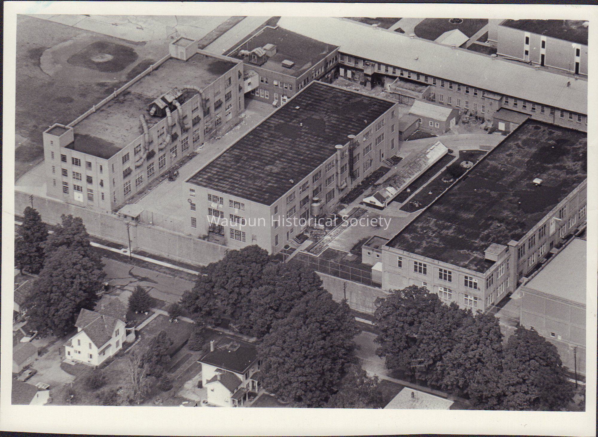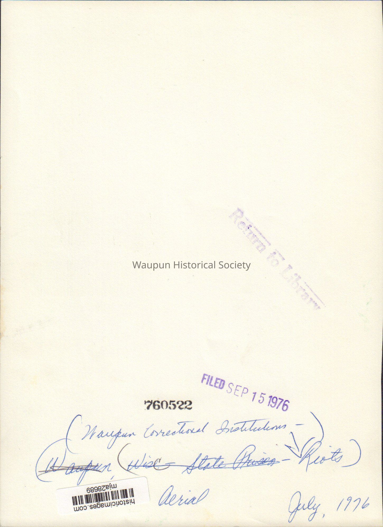 Photograph, Corrections, Wisconsin State Prison, Prison Disturbance, 1976. Black and white photo from Waupun Correctional Institution - aerial view of Waupun prison taken during July 1976 riots at prison.Acquisition