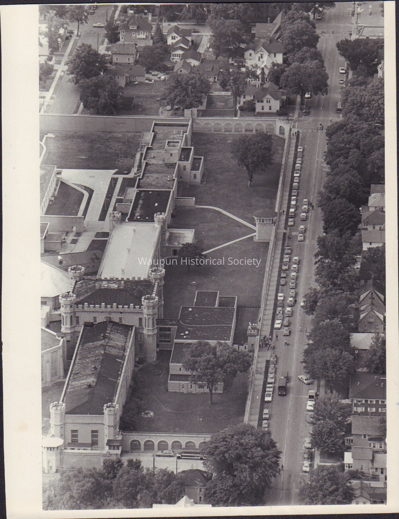 Photograph, Corrections, Wisconsin State Prison, Prison Disturbance, 1976. Black and white photo from Waupun Correctional Institution - aerial view of Waupun prison during July 1976 riots at prison. This view shows the front of the prison with all the police vehicles and policemen ready for the riots. This was taken looking north up Madison St.Acquisition