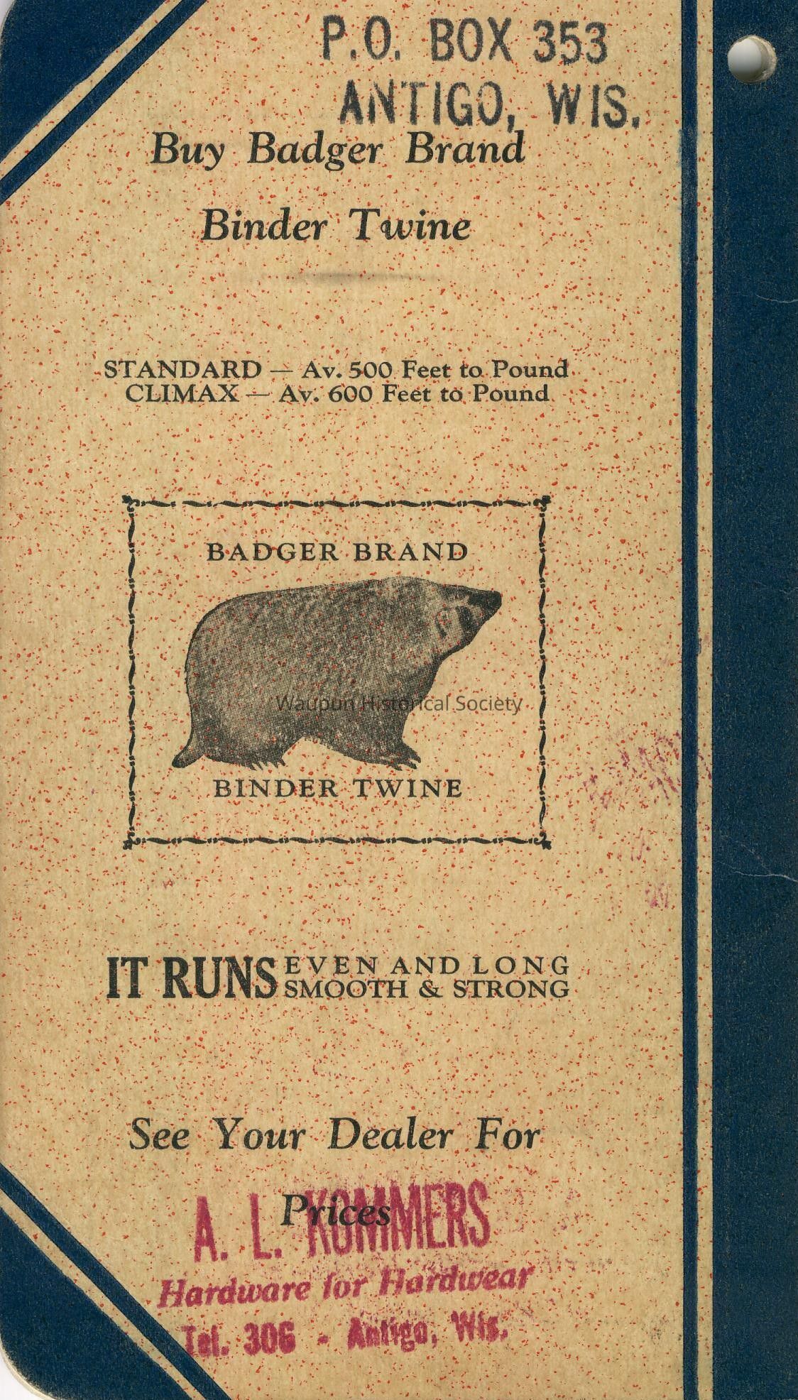 When in need of binder twine-ask your dealer for the old reliable "BADGER", it runs even and long, smooth and strong.
