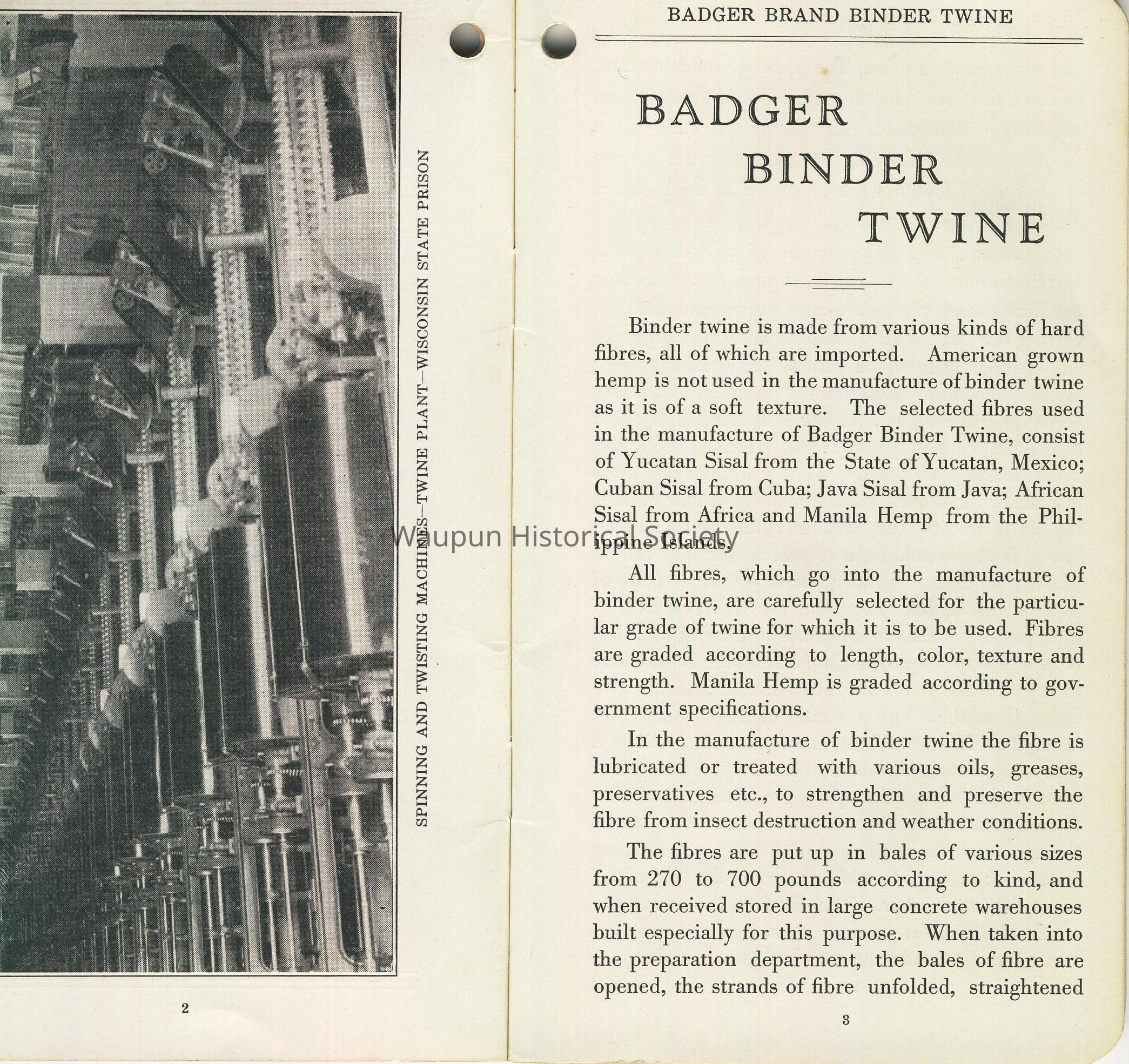 Booklet, Corrections, Wisconsin. State Prison, Badger Binder Twine. Badger Binder Twine. This picture is taken from a 1941 or '42 notes pad from the Badger Twine Co. This notebook contains photos of the Badger Binder Twine Co. which operated out of the Waupun State Prison and the story of the Twining process. For the complete story, please see below.