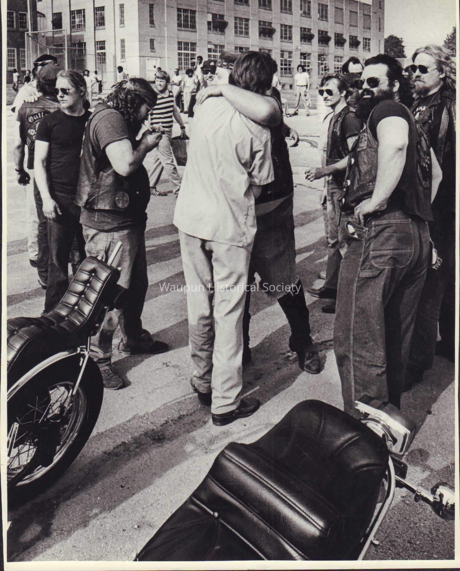 Lower: An inmate and maember of the Milwaukee Outlaws hugged pone another as they renewed an old acquaintance.Acquisition