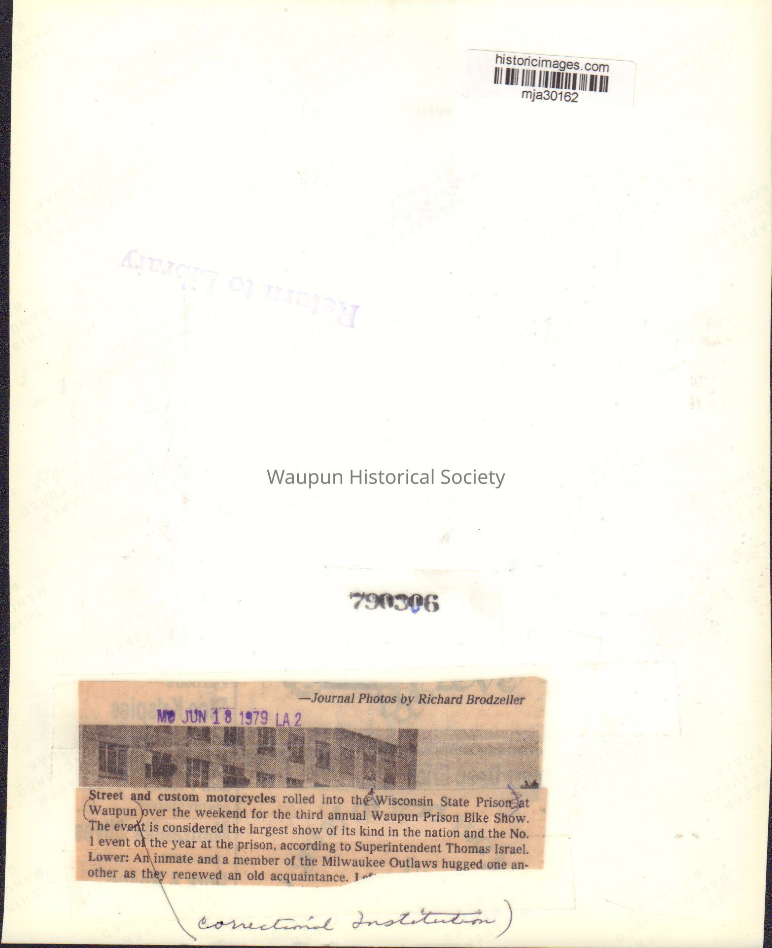Newspaper clipping info from Journal photo, dated Jun 18, 1979, by Richard Brodzeller is glued on back of photo: