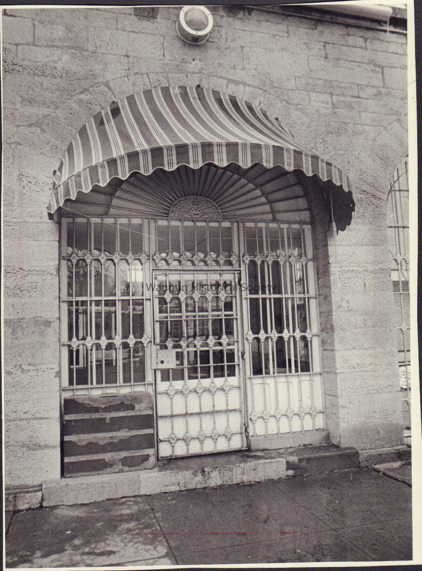 Photograph, Corrections, Wisconsin State Prison, Entrance. Black and white photo from Waupun Correctional Institution - Entrance to the prison has a canopy. Notice the ornate iron work on the bars.