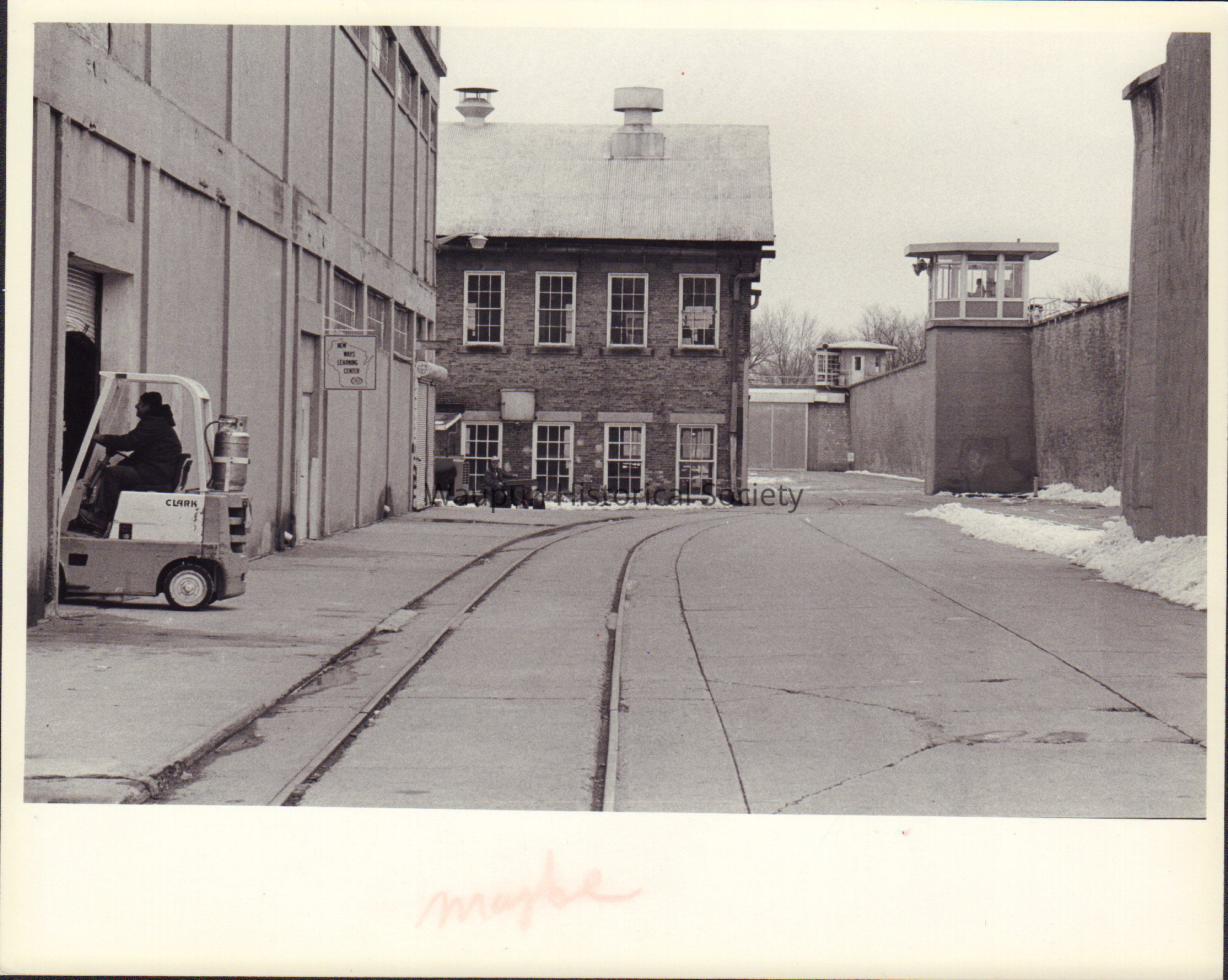 View of train tracks in the industrial yard inside Waupun prison. Two men appear to be working in the area; not sure if they are inmates.