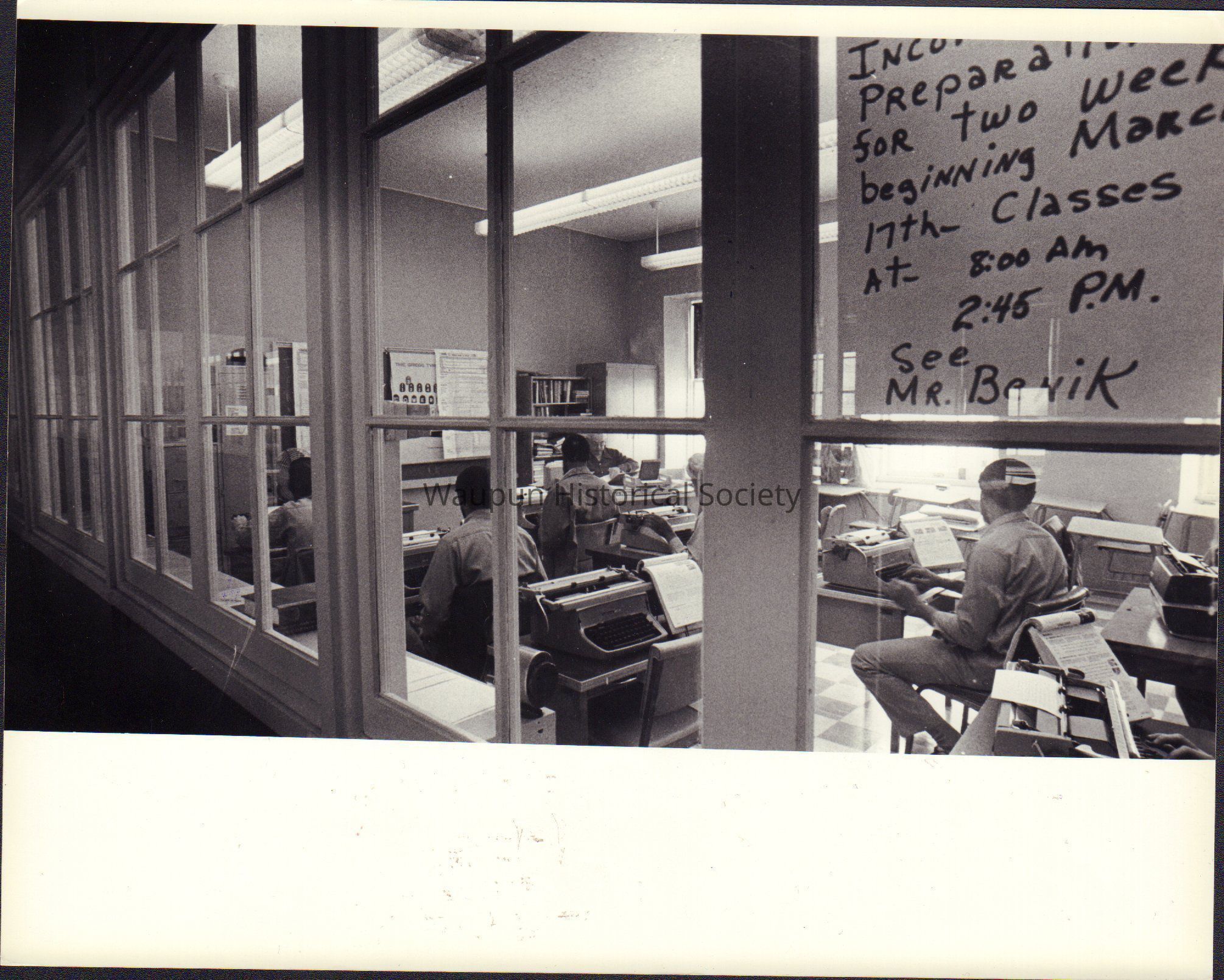Photo of what appears to be a classroom with prisoners at manual typewriters. Name, Mr. Benik appears on a sign on the window of the classroom.Acquisition