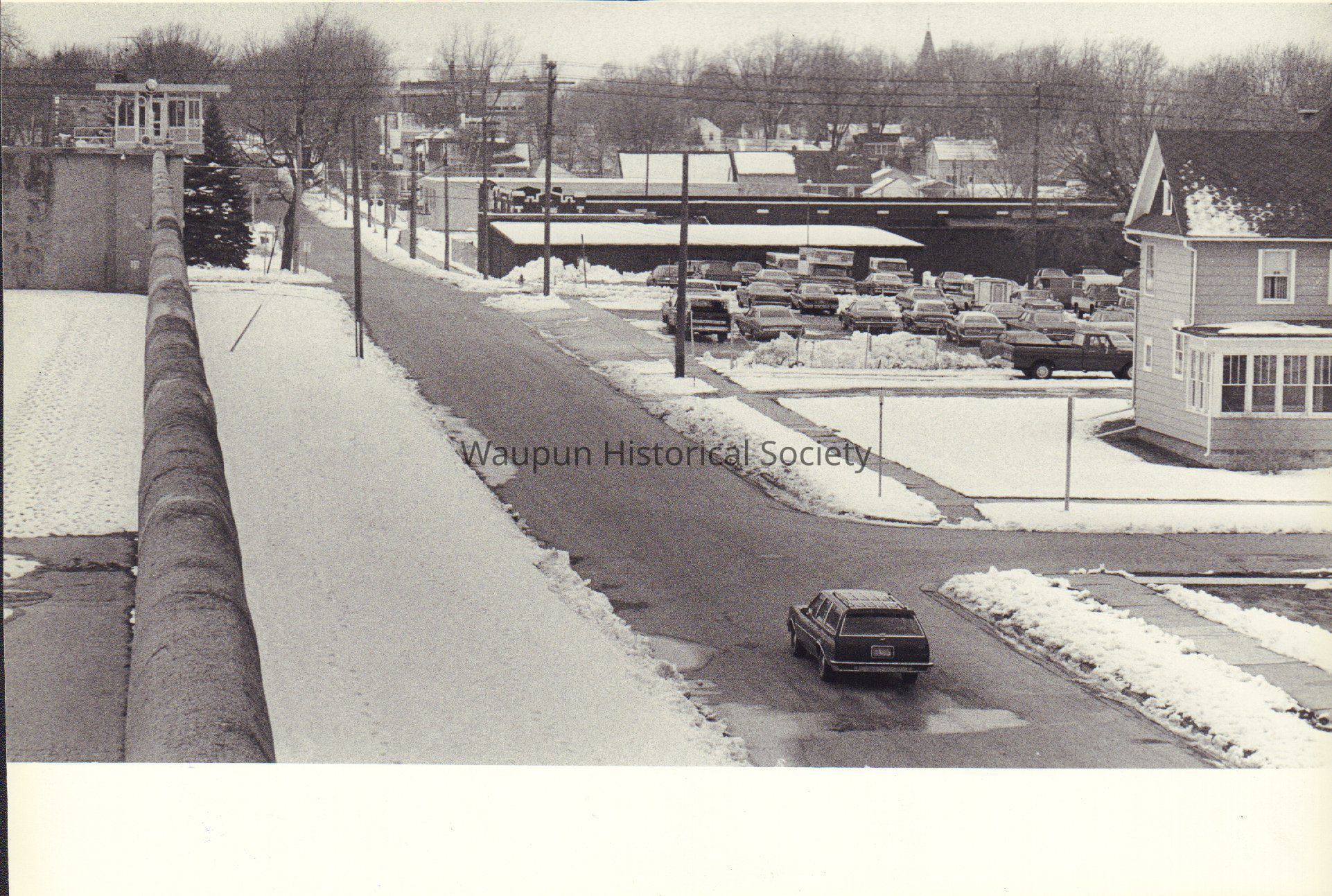 View of North wall of Waupun prison looking West on Brown St. S. Mill St. intersects with Brown St. The parking lot for National Rivet employees is visible across from the North wall of the prison.Acquisition