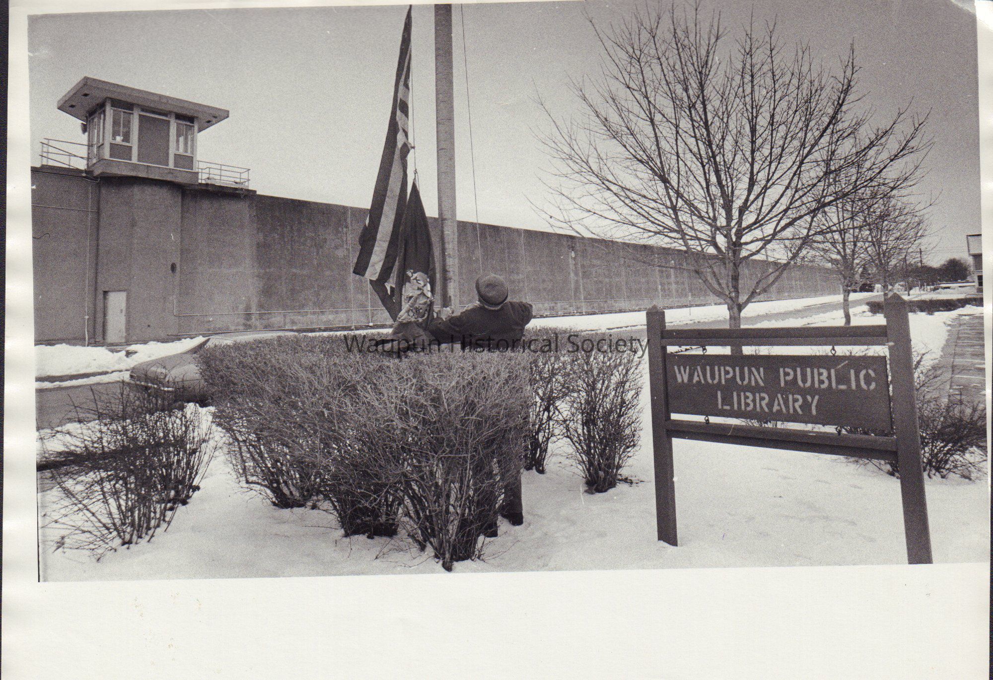 View of North wall of Waupun prison across from the Waupun Public Library. A man is raising flags at the library.Acquisition