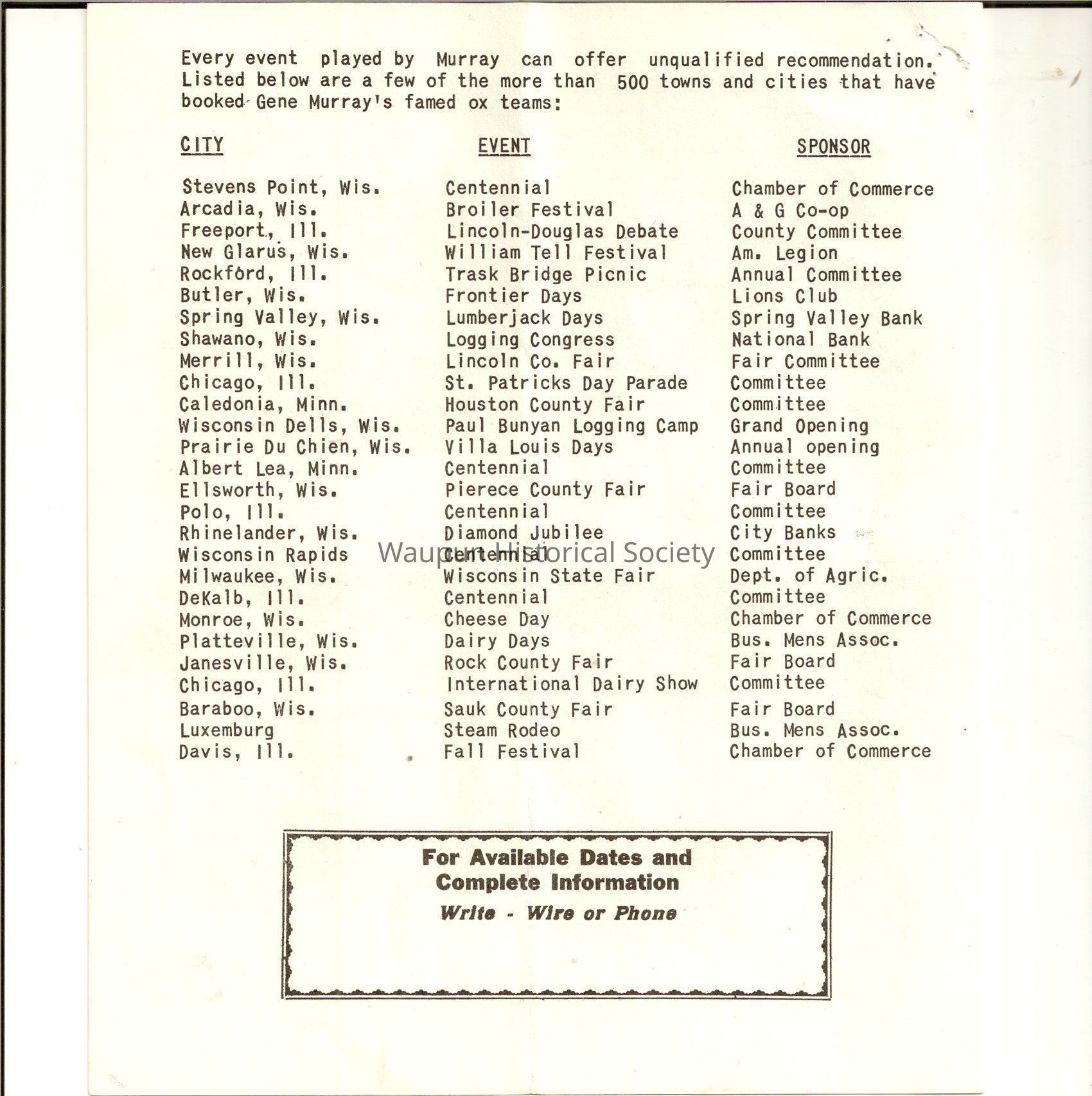 A Brochure of Gene Murray trainer and Owner of two Great show of team Oxen and also build his own cover wagons have always been fascinated by the Old West turn a hobby into a profitable business venture.Acquisition