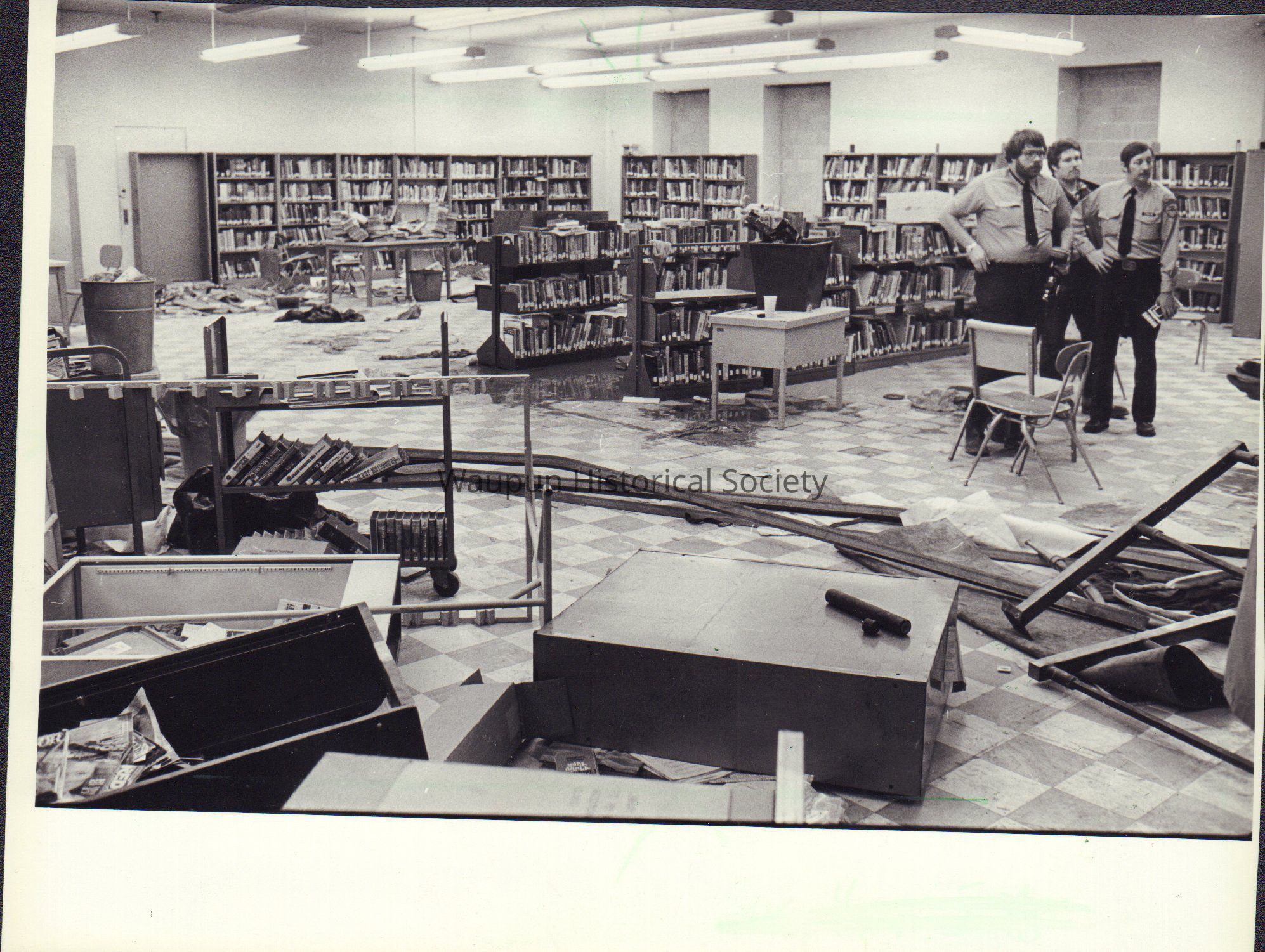 Information on back of photo - The library was among the areas damaged during Monday's uprising.Acquisition