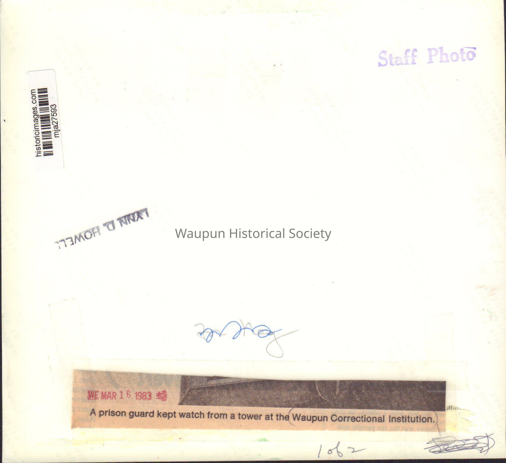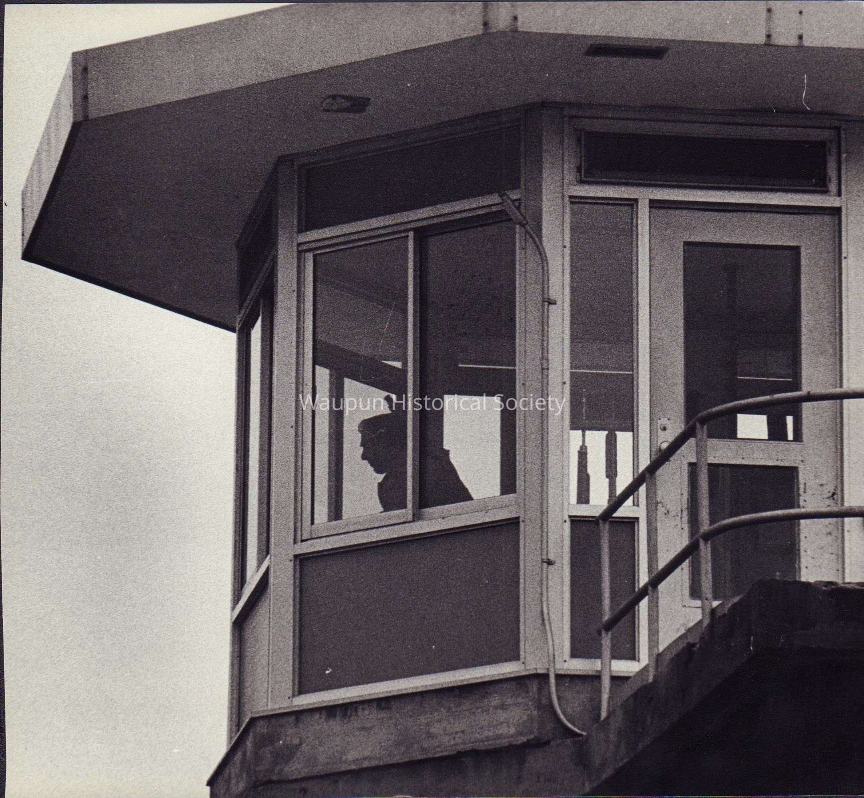 Information on back of photo - A prison guard kept watch from a tower at the Waupun Correctional Institution.