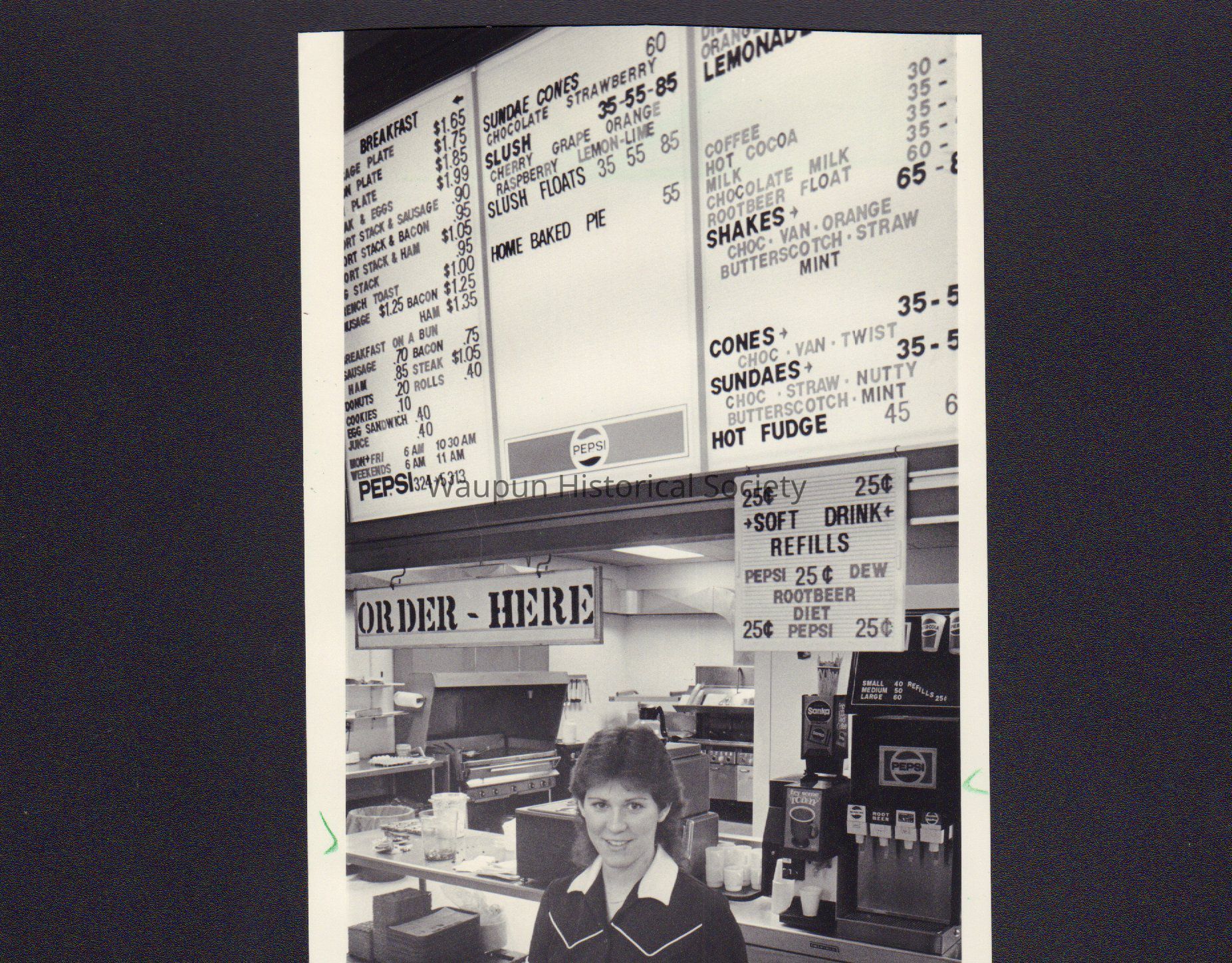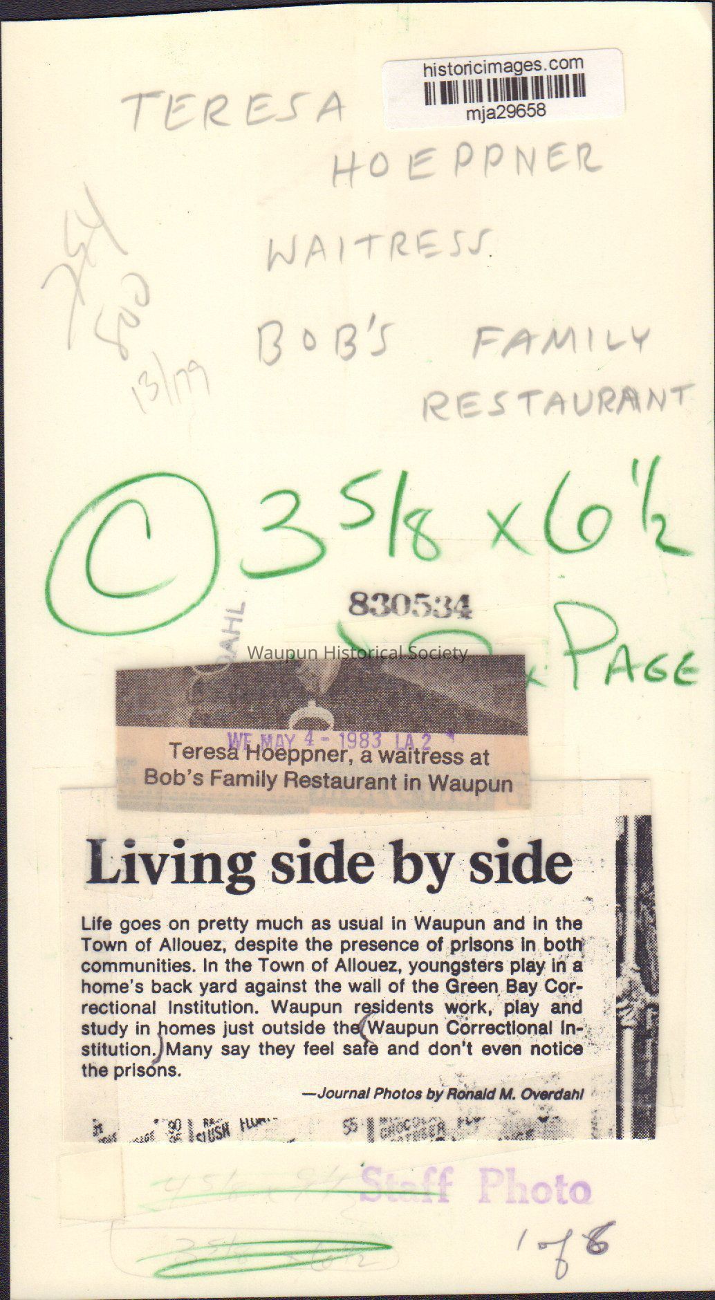 Information on back of photo - Teresa Hoeppner, a waitress at Bob's Family Restaurant in Waupun. Clipping dated May 4, 1983.