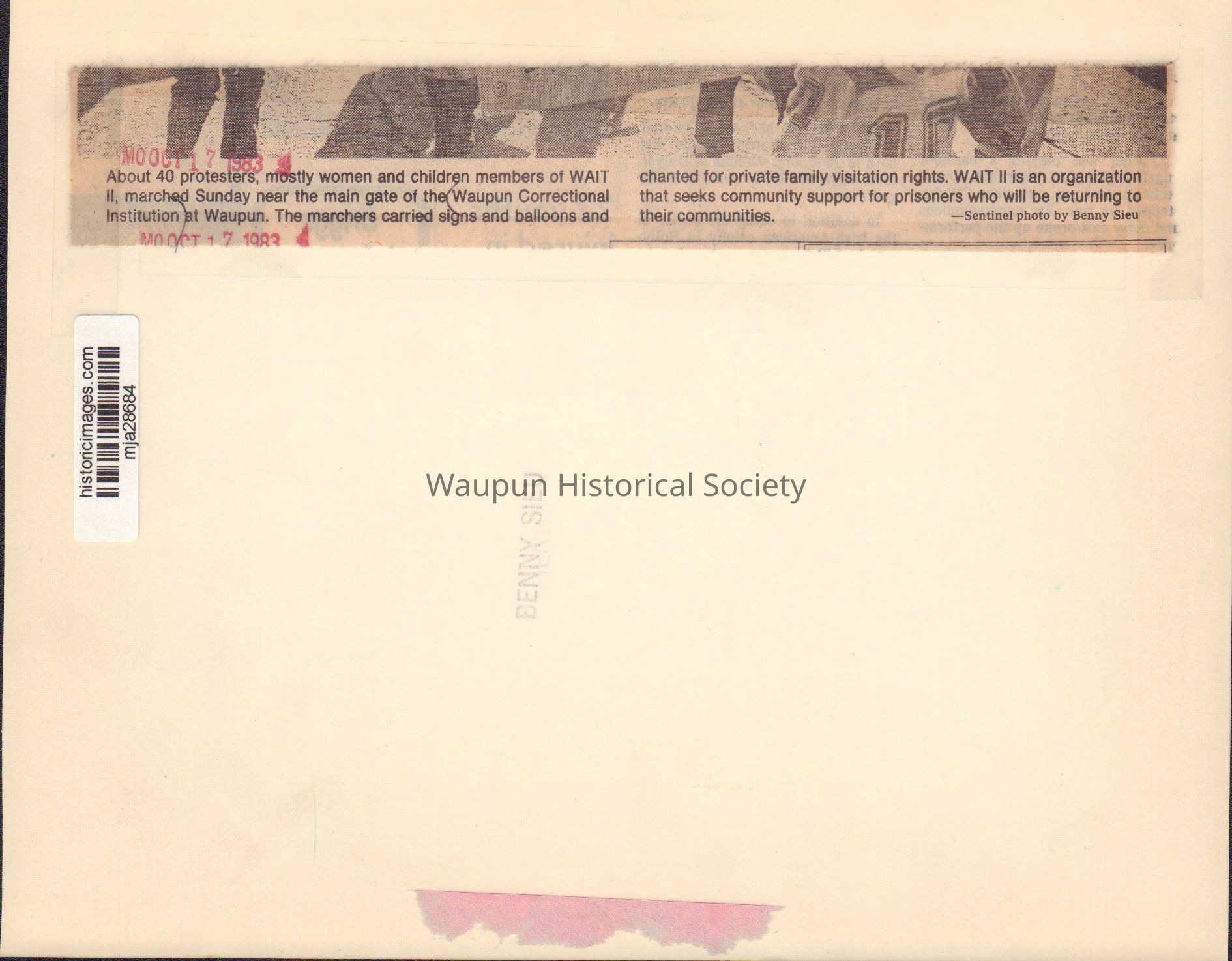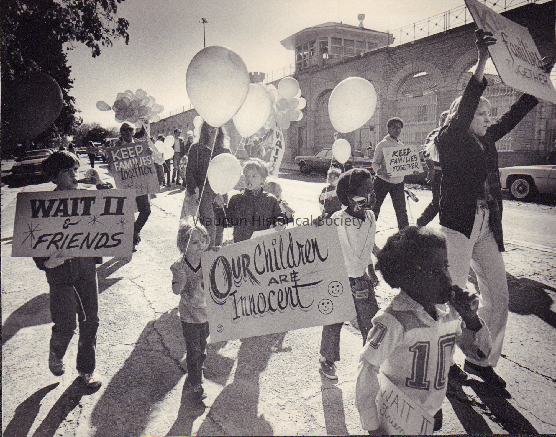 About 40 protesters, mostly women and children members of WAIT II, marched Sunday near the main gate of the Waupun Correctional Institution at Waupun. The marchers carried signs and balloons and chanted for private family visitation rights. WAIT II i an organization that seeks community support for prisoners who will be returning to their communities.Acquisition