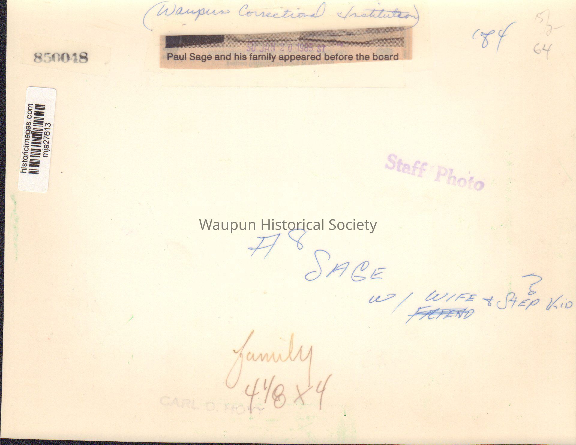 Photograph, Corrections, Wisconsin State Prison, Paul SageEntry/Object ID