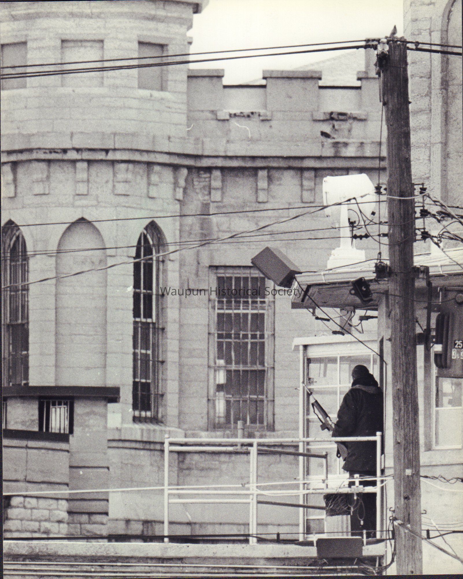 A rifle-carrying guard kept watch on the prison grounds in Waupun Monday afternoon. This is during the riots at the prison.Acquisition