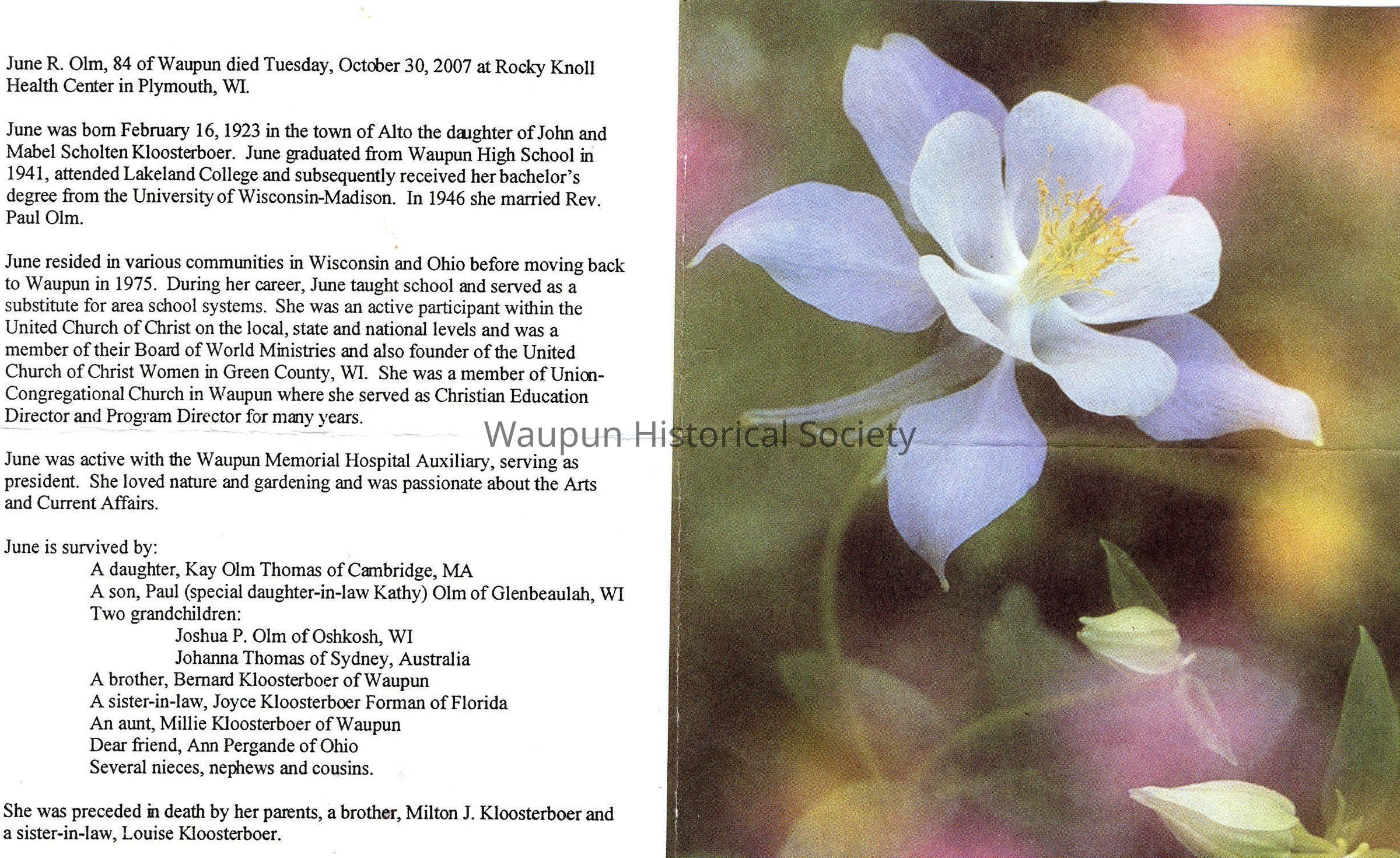 June is survived by: A daughter, Kay Olm Thomas of Cambridge, MA a son, Paul (special daughter-in-law Kathy) Olm of Glenbeaulah, WI two grandchildren: Joshua P. Olm of Oshkosh, WI Johanna Thomas of Sydney, Australia A brother, Bernard Kloosterboer of Waupun