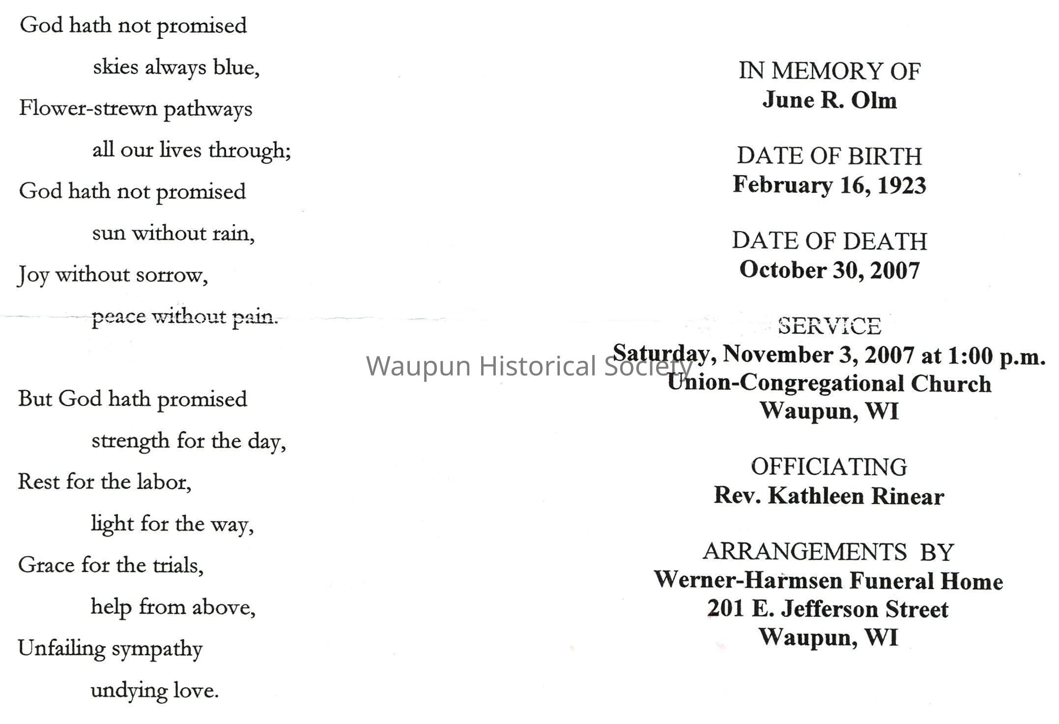 IN MEMORY OF June R. Olm DATE OF BIRTH February 16, 1923 DATE OF DEATH October 30, 2007 Saturday, November 3, 2007 at 1:00 p.m. Union-Congregational Church