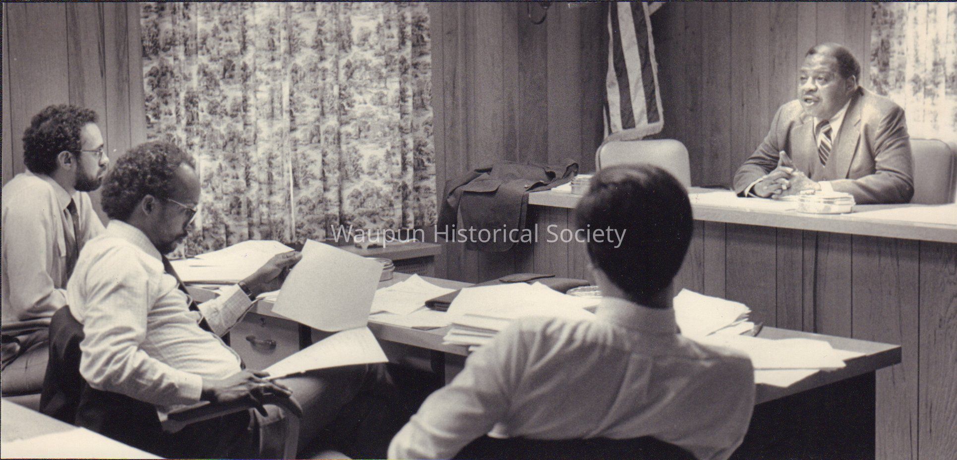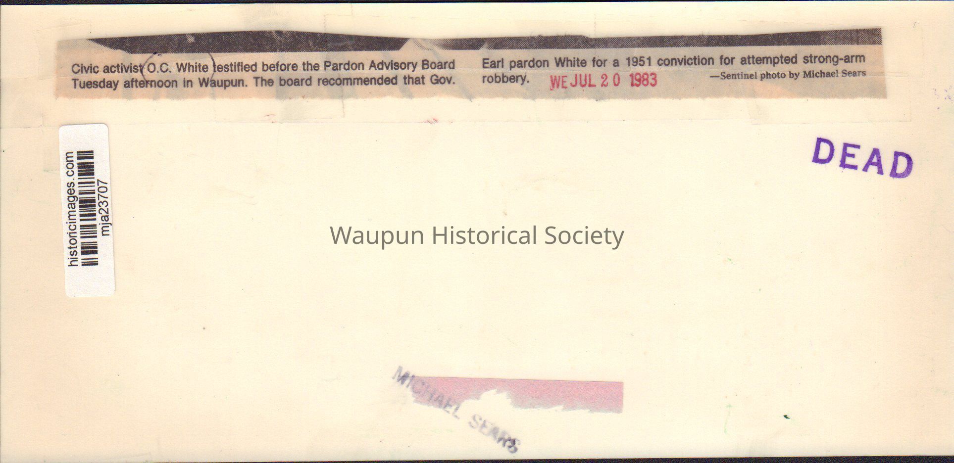 Information on back of photo - Civic activist O. C. White testified before Pardon Advisory Board Tuesday afternoon in Waupun. The board recommended that Gov. Earl pardon White for a 1951 conviction for attempted strong-arm robbery. - Sentinel photo by Michael Sears
