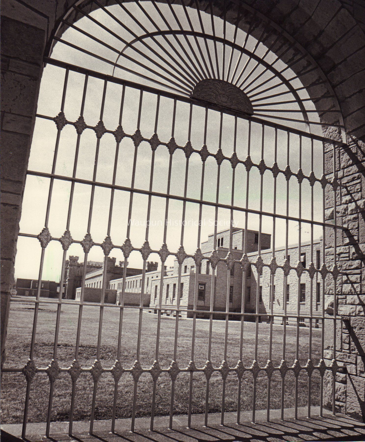 A view of the Waupun Correctional Institution looking in thru the bars of the prison wall.