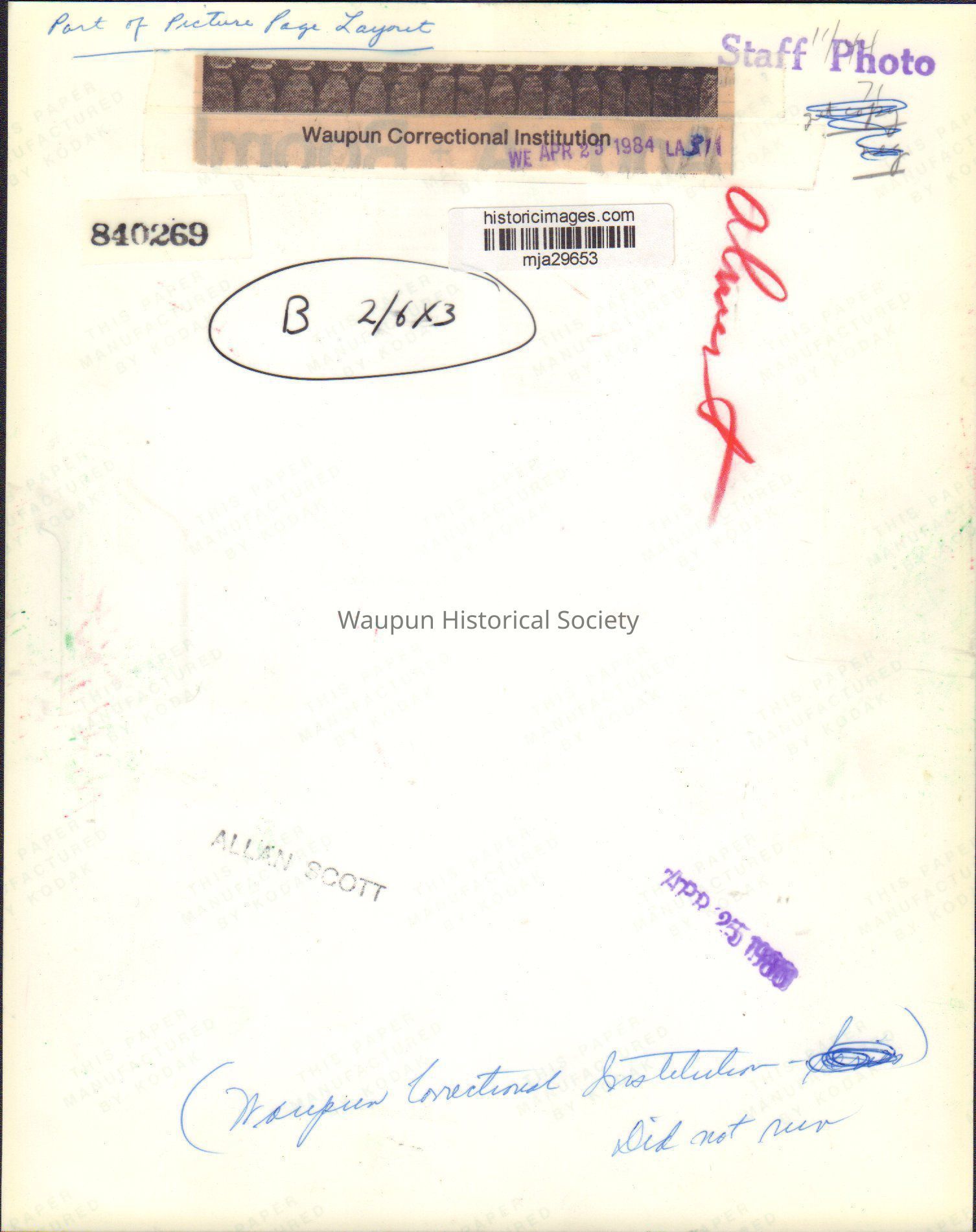 The name Allan Scott is stamped on back. Also, part of picture page layout, is handwritten on top.Acquisition