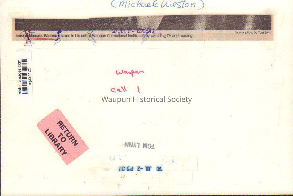 Photograph, Corrections, Wisconsin State Prison, Inmate Michael Weston. Black and white photo from Waupun Correctional Institution