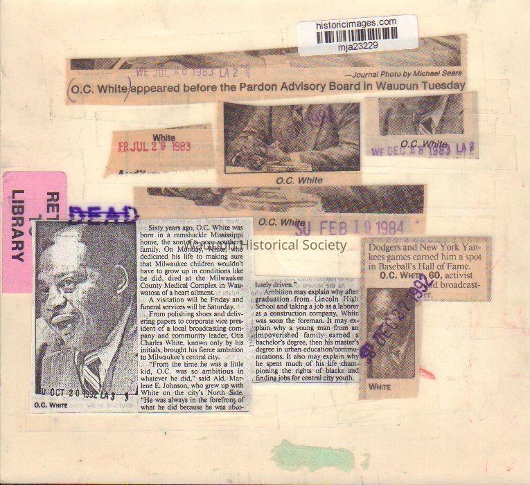 Several clippings attached on back of photo dated July 20, 29, 1983; December 28, 1983; February 19, 1984; and October 20, 27, 1992, where O. C. White is mentioned.