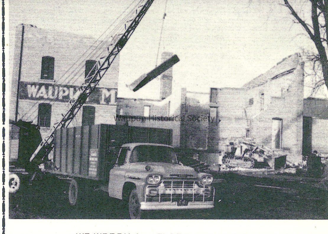 Black and white photo of the take down of the building. The name Waupun followed by the letter M (Malt?) are still visible. The donor indicates the picture is from the Dodge Co. Plat Book. There is nothing written about the photo, building or it's demise.Acquisition
