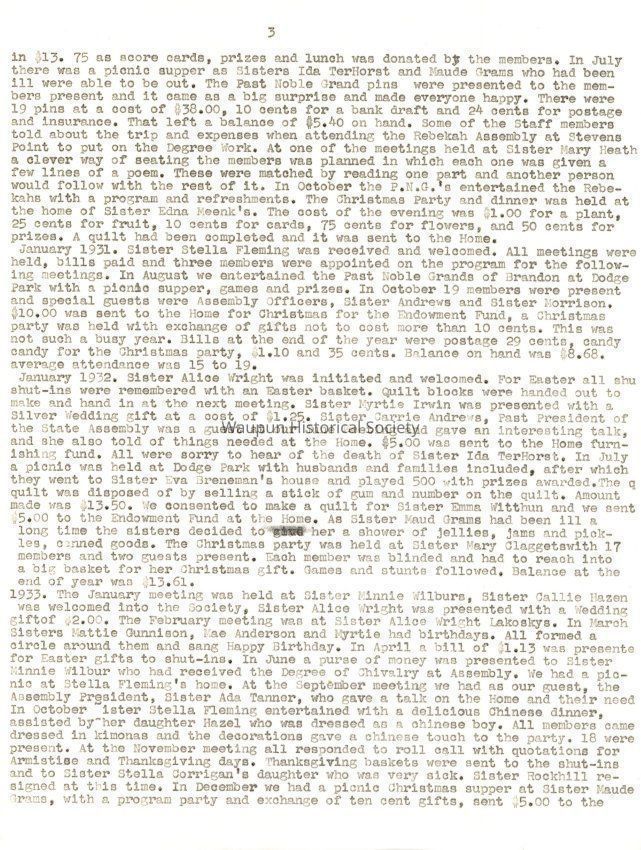 January 1929. Quilts were pieced for Sisters Hattie Lubitz and Edna Heenk, Sister Mertie Geidel furnishing the material Sisters Hattie Lubitz and Rockhill were initiated, into the circle and welcomed. In February it was decided to sing the song Blest be the Tie that Binds. It was at this meeting the members decided to have a President, Vice President, Secretary and Treasurer and Chaplain. On March 13 the Rebekah Sisters were entertained, and the P.G. of the I.O.O.F. at the Hall, a St. Patrick's party and refreshments were served. There was a bill of $2.25 for plants for Sister Emma Witthun and Sister Edna Meenk's father. Sisters Eva Brenaman and Edna Bush were appointed to look up the material on our deceased members and compiled in a book for our keeping. Sister Sara Johnson passed away after being ill a long time. At the June meeting the members started singing the Hymn, God be with You Til we meet again and 16 members were present. A picnic was held in Dodge Park for members and families. In September, 14 members were present and in November the Rebekahs invited the P.N.G.s to a party. It was held on the 13th. A motion carried to buy material to finish the quilts and 20 yards of toweling to make towels for the Home for Christmas. Bills totaled $5.25 plus $3.80 for toweling, $1.05 for candy, 42 cents for quilt material and 17 cents for cards and postage. It was voted to have card parties for P.N.G. pins. Average attendance during the year was 14 or 15. Balance at end of year $5.76.