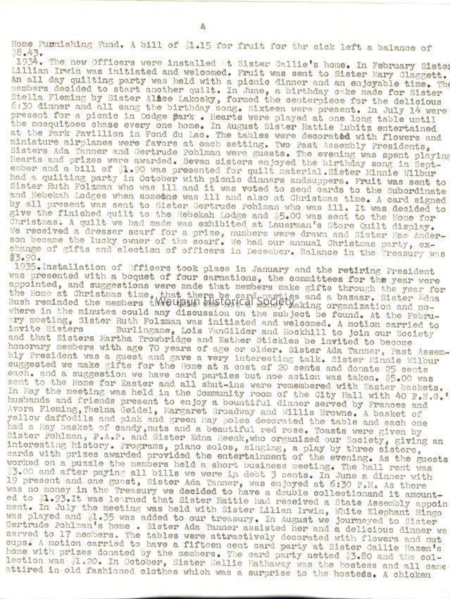 1934. The new Officers were installed at Sister Callie's home. In February Sister Lillian Irwin was initiated and welcomed. Fruit was sent to Sister Mary Claggett. An all day quilting party was held with a picnic dinner and an enjoyable time. The members decided to start another quilt. In June, a birthday cake made for Sister Stella Fleming by Sister Alice Lakosky, formed the centerpiece for the delicious 6:30 dinner and all sang the birthday song. Sixteen were present. In July 14 were present for a picnic in Dodge park. Hearts were played at one long table until the mosquitoes chase every one home. In August Sister Hattie Lubitz entertained at the Park Pavillion in Fond du Lac. The tables were decorated with flowers and miniature air lanes were favors at each setting. Two Past Assembly Presidents, Sisters Ada Tanner and Gertrude Pohlman were guests, The evening was spent playing Hearts and prizes were awarded. Seven sisters enjoyed the birthday song in September and a bill of $1.90 was presented for quilt material. Sister Minnie Wilbur had a quilting party in October with picnic dinners and suppers. Fruit was sent to Sister Ruth Folzman who was ill and it was voted to send cards to the Subordinate and Rebekah Lodges when someone was ill and also at Christmas time. A card signed by all present was sent to Sister Gertrude Pohlman who was ill. It was decided to give the finished quilt to the Rebekah Lodge and $5.00 was sent to the Home for Christmas. A quilt we had made was exhibited at Lauerman's Store Quilt display. We received a dresser scarf for a prize, numbers were drawn and Sister Mae Anderson became the lucky owner of the scarf. We had our annual Christmas party, exchange of gifts and election of officers in December. Balance in the Treasury was $3.90.