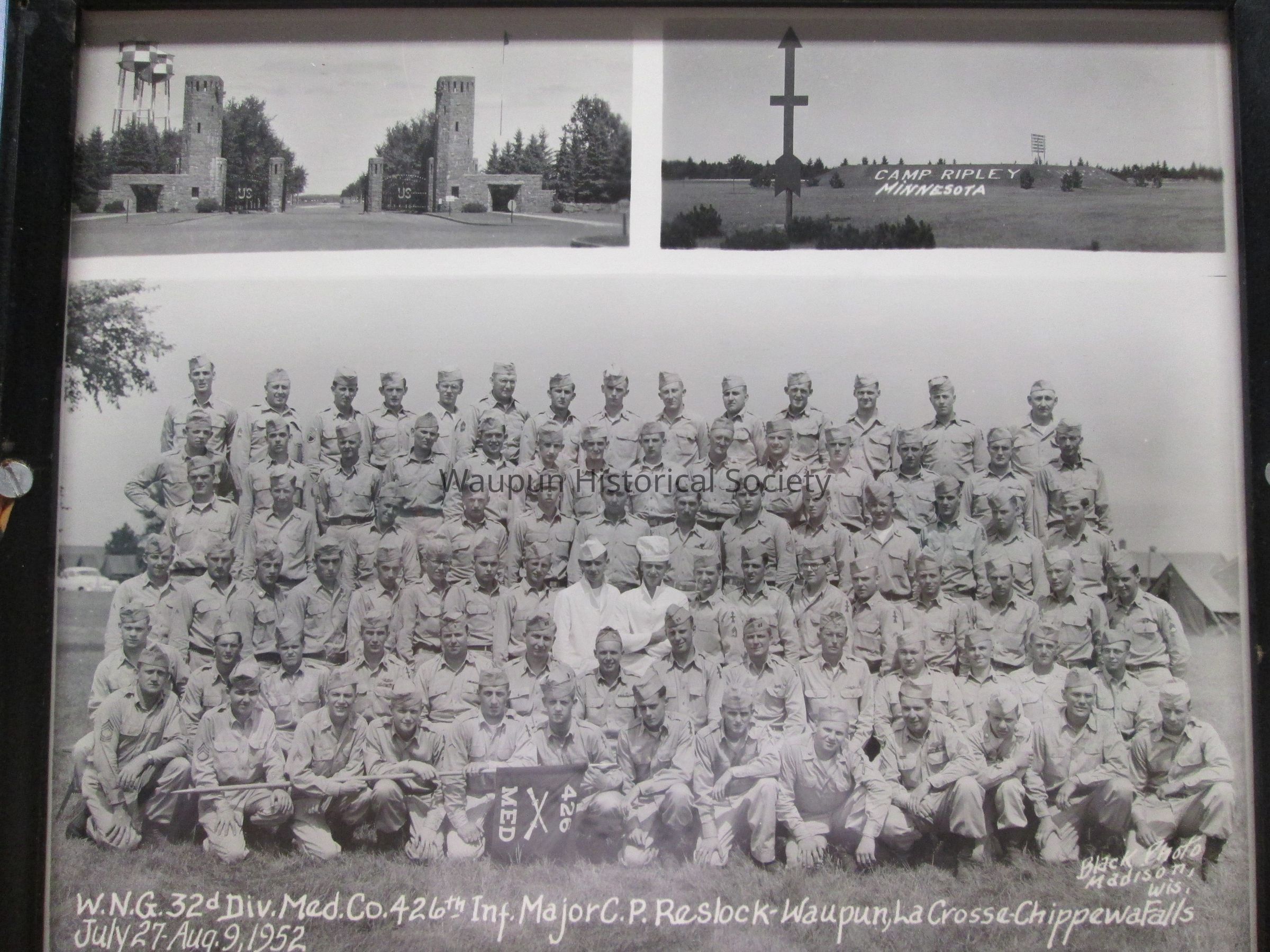 7.5" x 9.5" Black and white photo of W.N.G. 32nd Div. Med. Co. 426th Inf. Major C.P. Reslock-Waupun, La Crosse-ChippewaFalls July 27 - Aug. 9, 1952. The photo includes the gates of Camp Ripley in one photo, a picture of a hill inside Camp Ripley, MN, as well as a photo of the men who were there training the week of July 27th thru August 9, 1952.