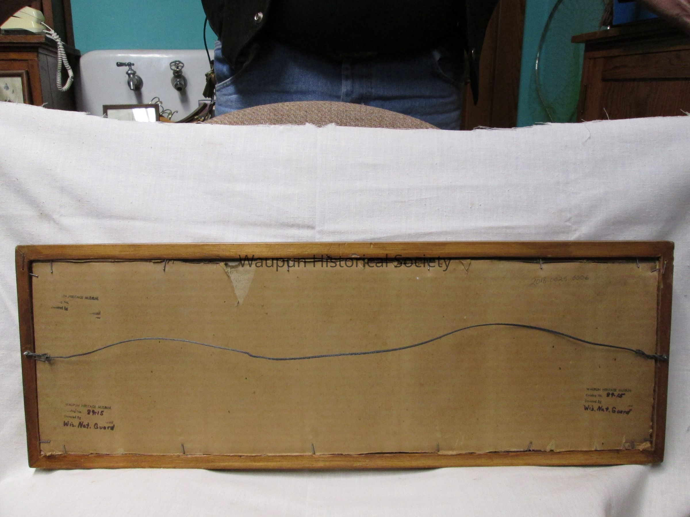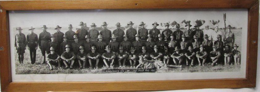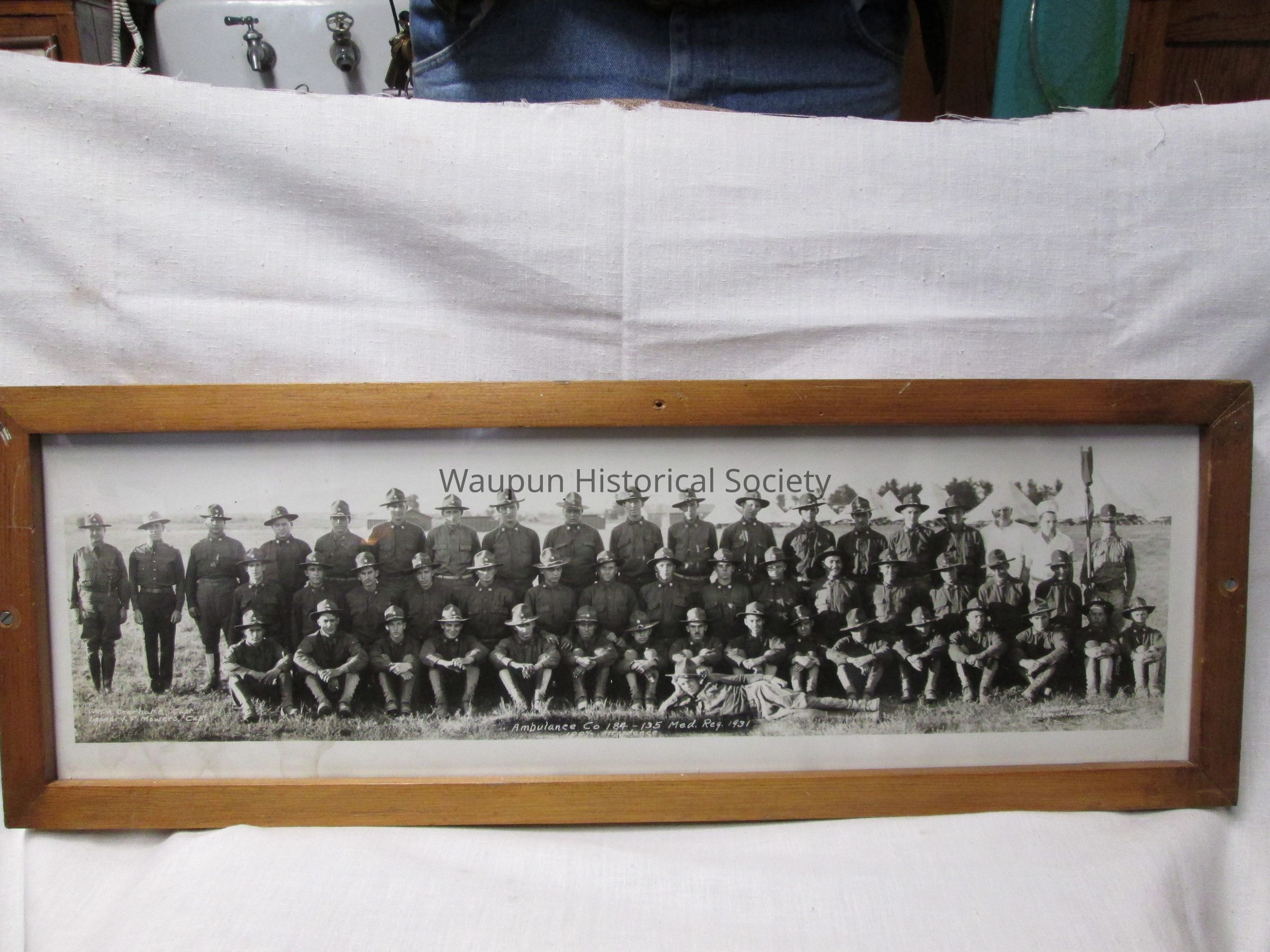 25.5" x 8" Black and white photo of National Guard 135th Medical Reg. Ambulance Co. 184. Photo was taken in 1931 by Phot Art House Madison-Milwaukee, WI. Noted on the picture are the names of two Captains; WM.A. Deerhake and Leonard F. Mowers. Photo is framed in brown wooden frame with glass.Acquisition