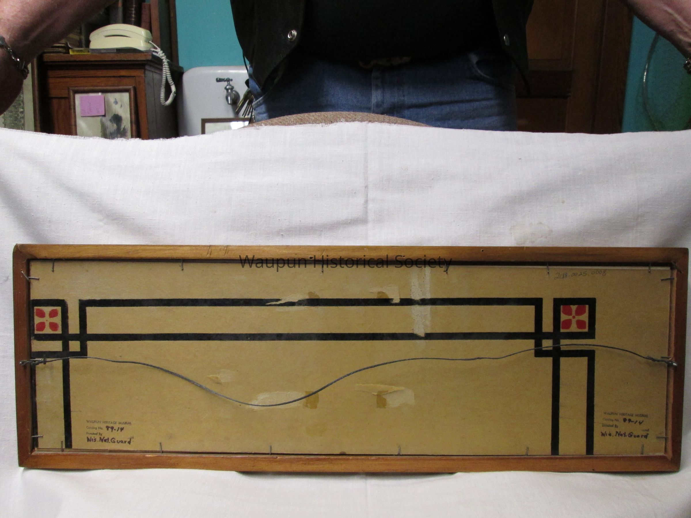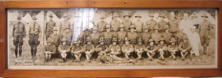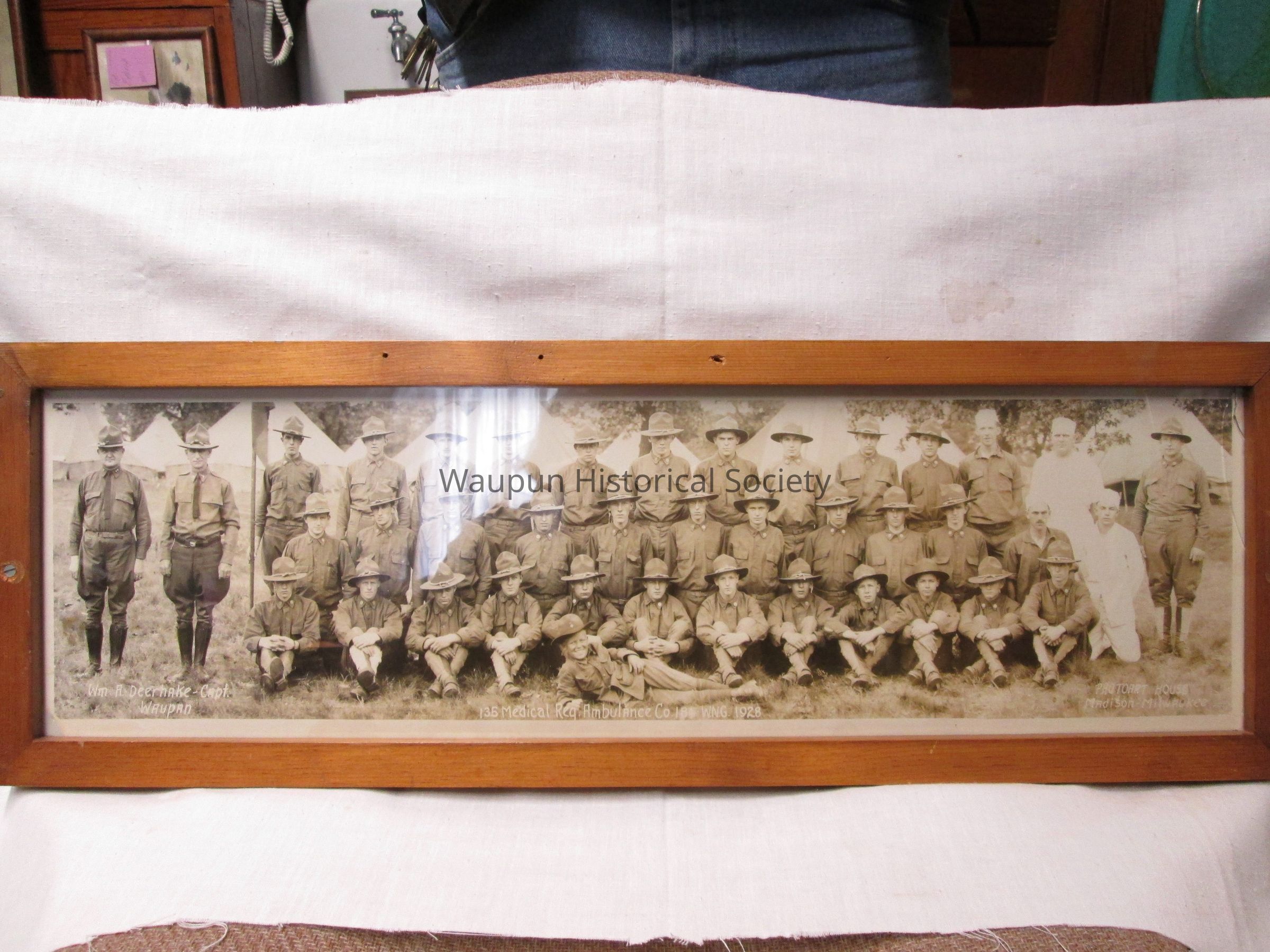 27" x 8" Black and white photo of the National Guard. 135th Medical Reg. Ambulance Co. 184 W.N.G. 1928. Noted on picture is officer; WM. A. Deerhake-Cap. from Waupun. Photo was taken by Photo Art House Madison/Milwaukee. Photo is frames in a lt brown wooden frame with a small crack in the glass on the front right upper corner. Located on back of photo is a list of some of the men in the photo: 1) Capt. Deerhake, 2) Dowiegne Brow, 3) Morris Vande Zande, 4) Wally Shoochliebell, 5) Earl Schumer, 7) Bud Clark, 8) Mike Mulder, 9) TerHorst, 12) David Towne. 2nd Row; 1) John DeHartog, 2) Hance Getchel, 3) Duke Vande Zande 4) Edward, 5) Harvey Hendricks, 6) Hendricks, 7) Monte Cornell, 10) Strekern, 11) Neil Fairbanks, 12) Calkins cook. 3rd Row; 1) Kip Keough, 2) Verl Guebe, 3) Bill Wilderman 5) Gordon Redman, 6) Edward Haase, 7) John Van Zane, 9) Euctstile, 10) Buck Harold Schultz, 11) Delmar Gerriston, 12) Lyle Groves, 13) Bert Redman. Numbers skipped had no names by them.Acquisition