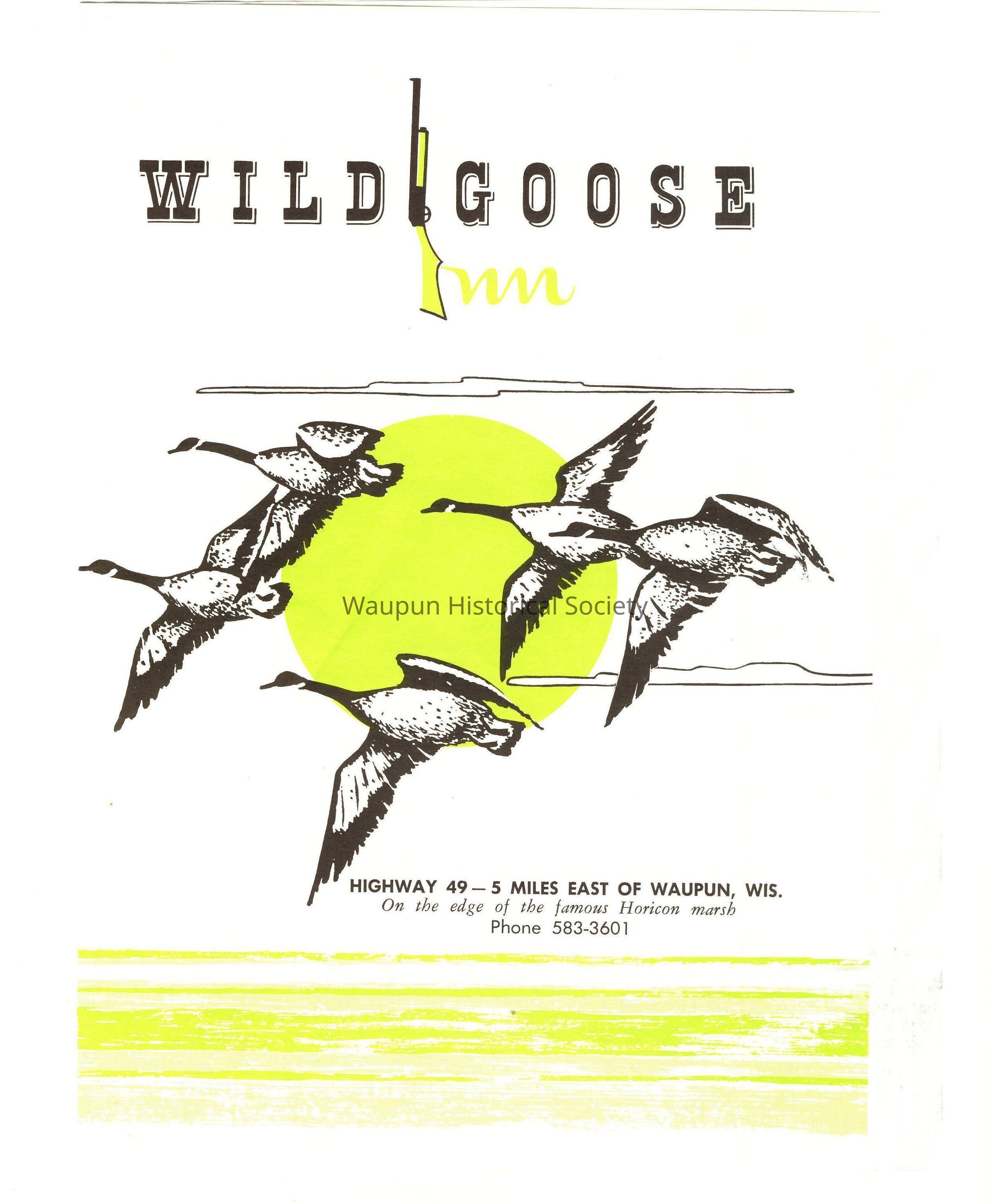 It has a map of the Horicon National Wildlife Refuge and a green star marking the spot where the Wildgoose Inn is located on Hwy. 49 - 6 Miles East of Waupun, Wis. On the edge of the famous Horicon Marsh - Phone 583-3601