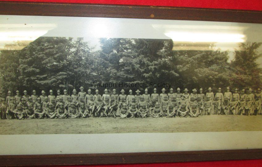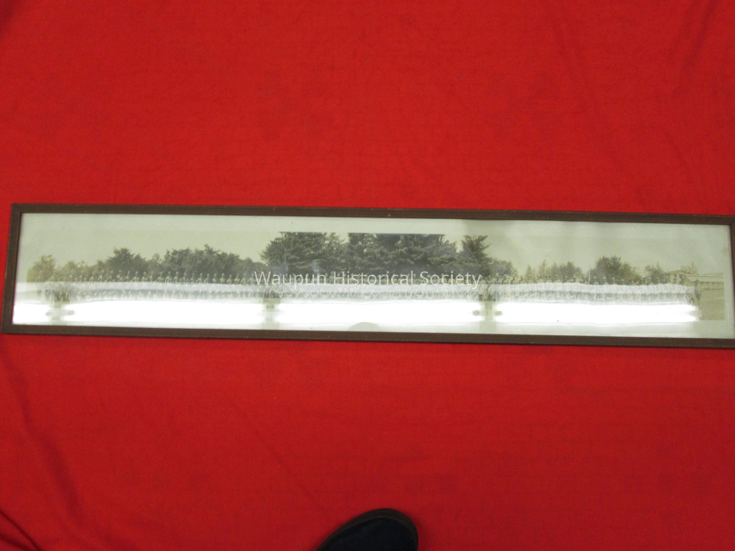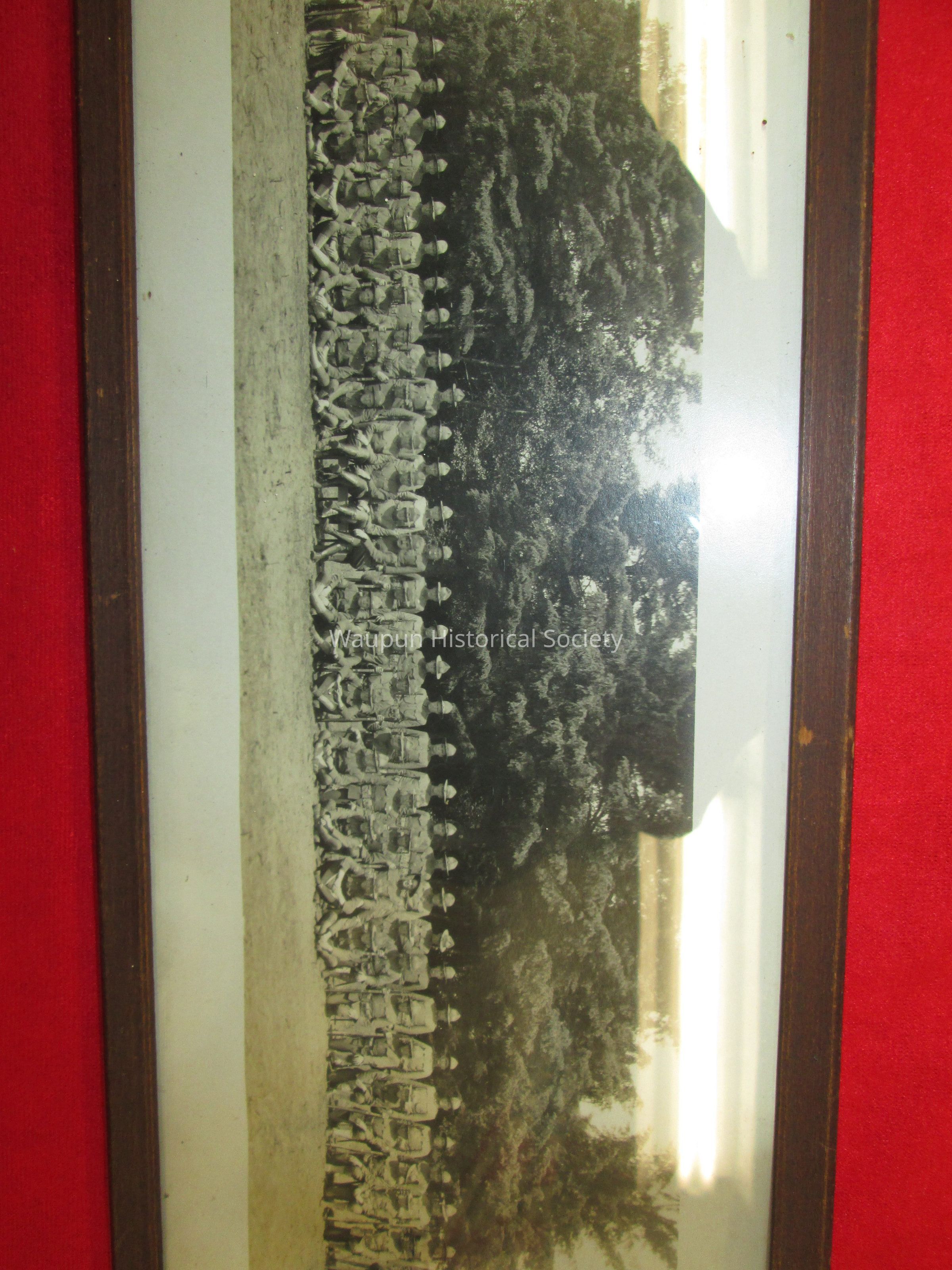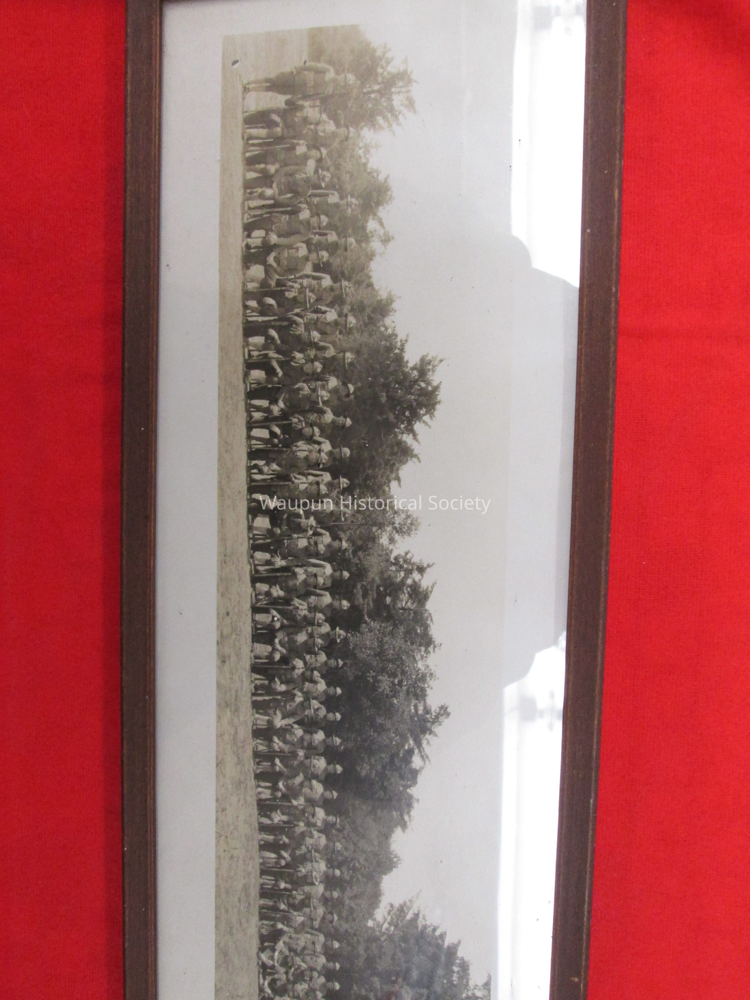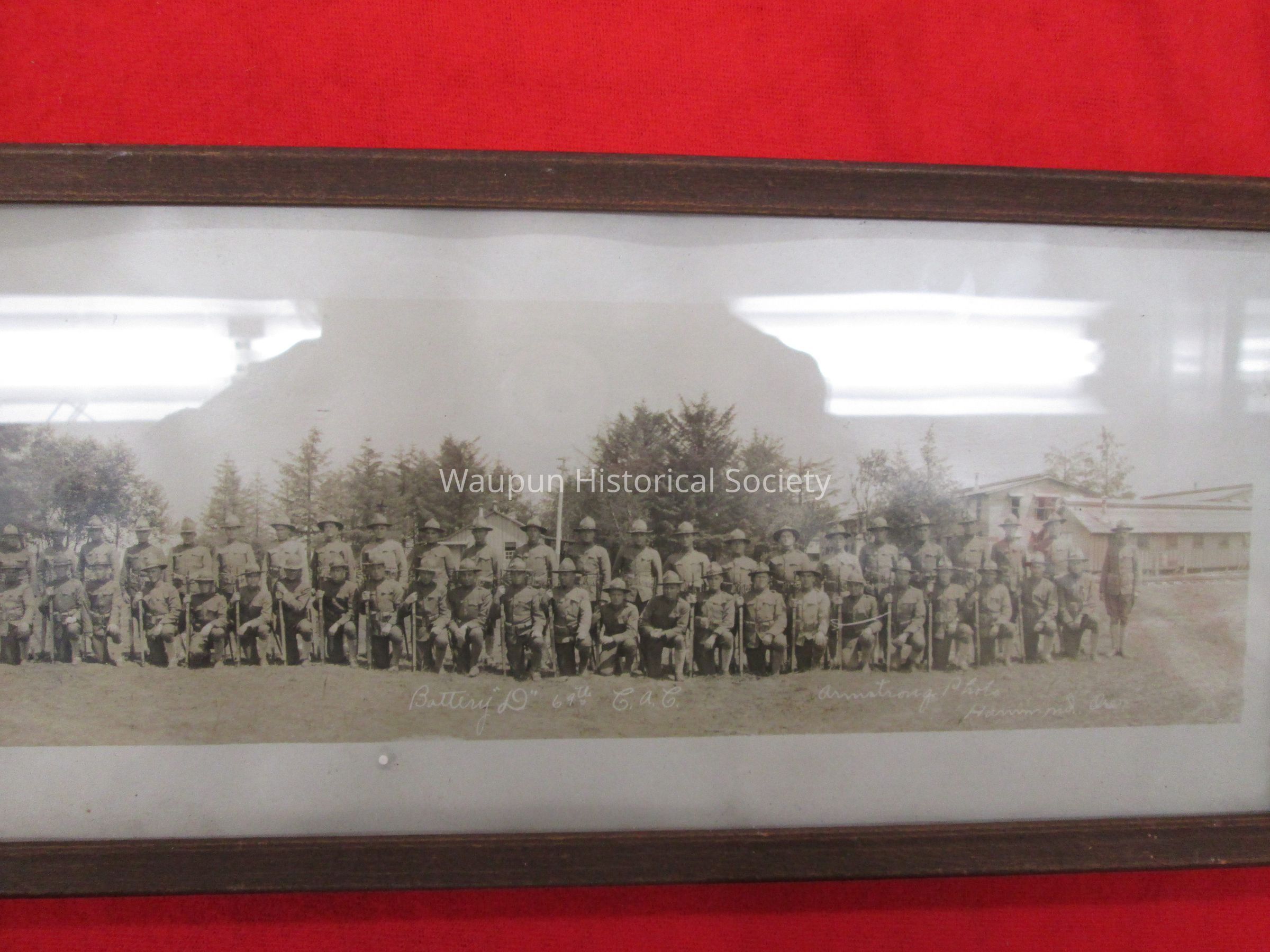 35.5" x 6" print photo of military personnel labeled, "Battery "D" 69th C.a.C. Men are pictured standing and sitting on a grassy knoll with trees behind them. Photo is framed in a very worn wooden frame with glass.