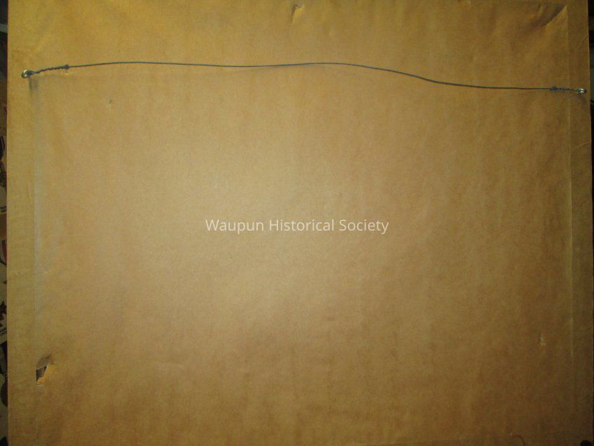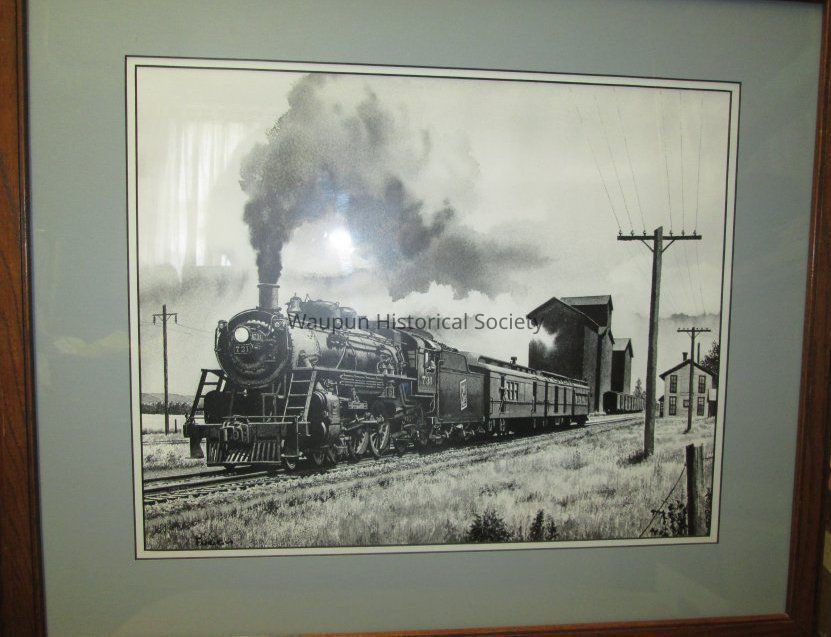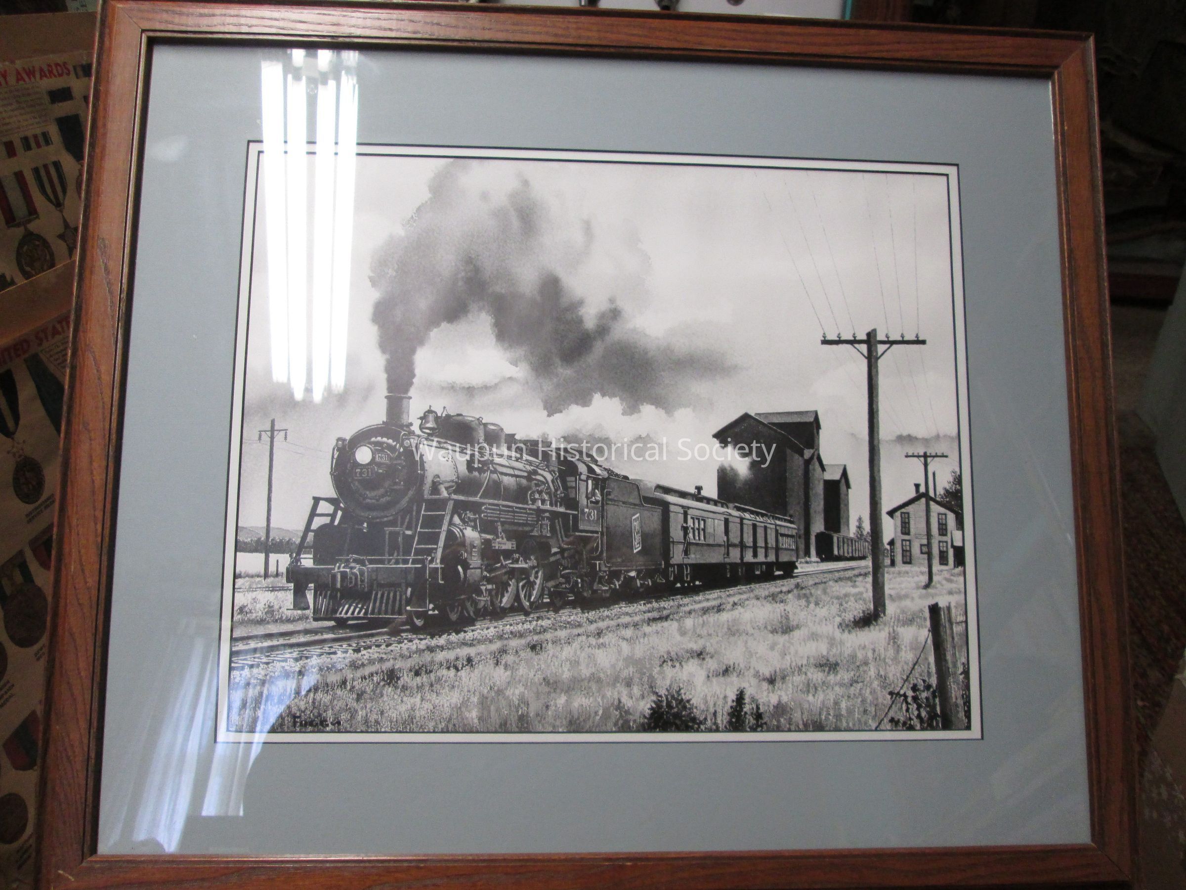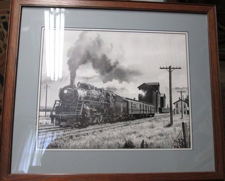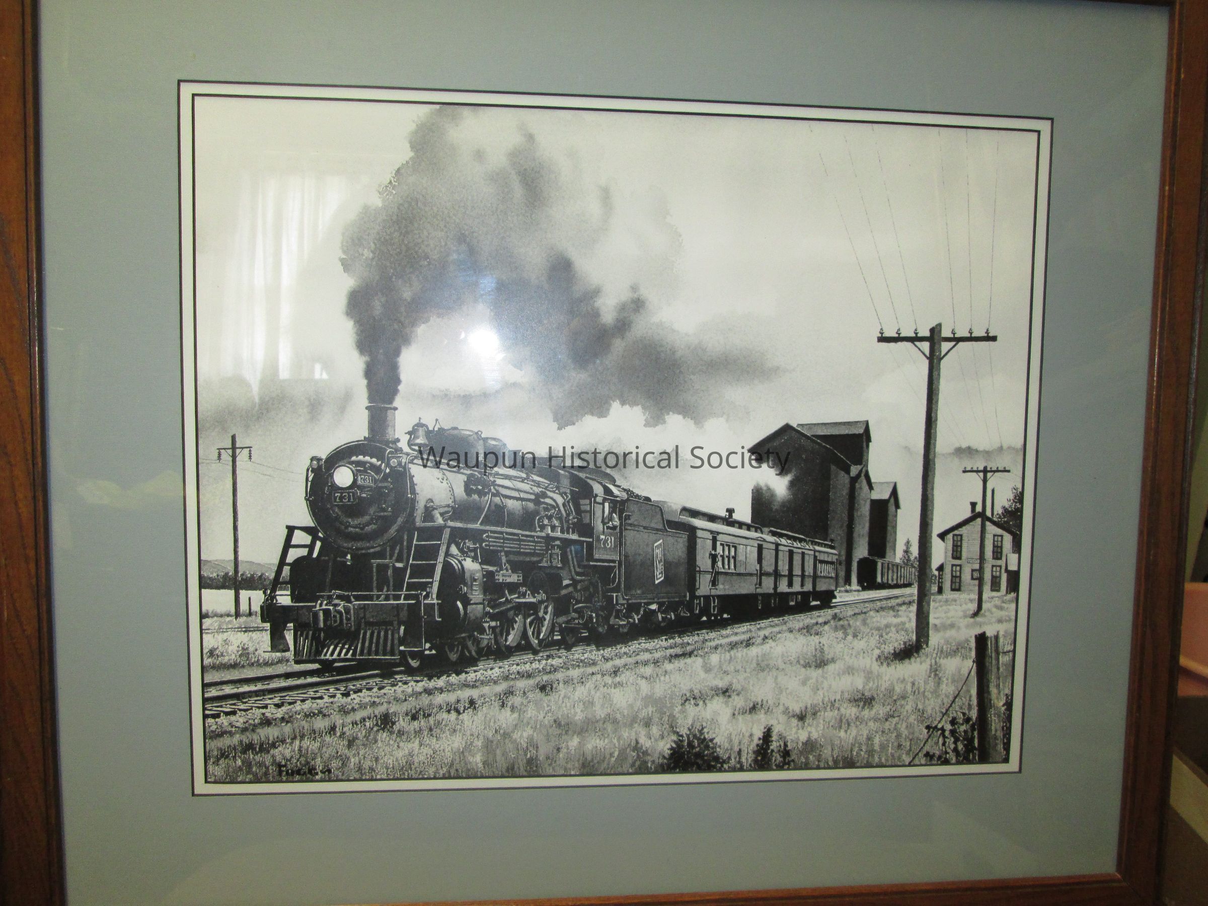 Framed picture of a coal burning engine train #731 with 2 additional freight cars and 1 passanger car. Train is shown leeaving depot. Artist is unknown. Picture is matted and framed in a light brown wooden frame with glass.Acquisition