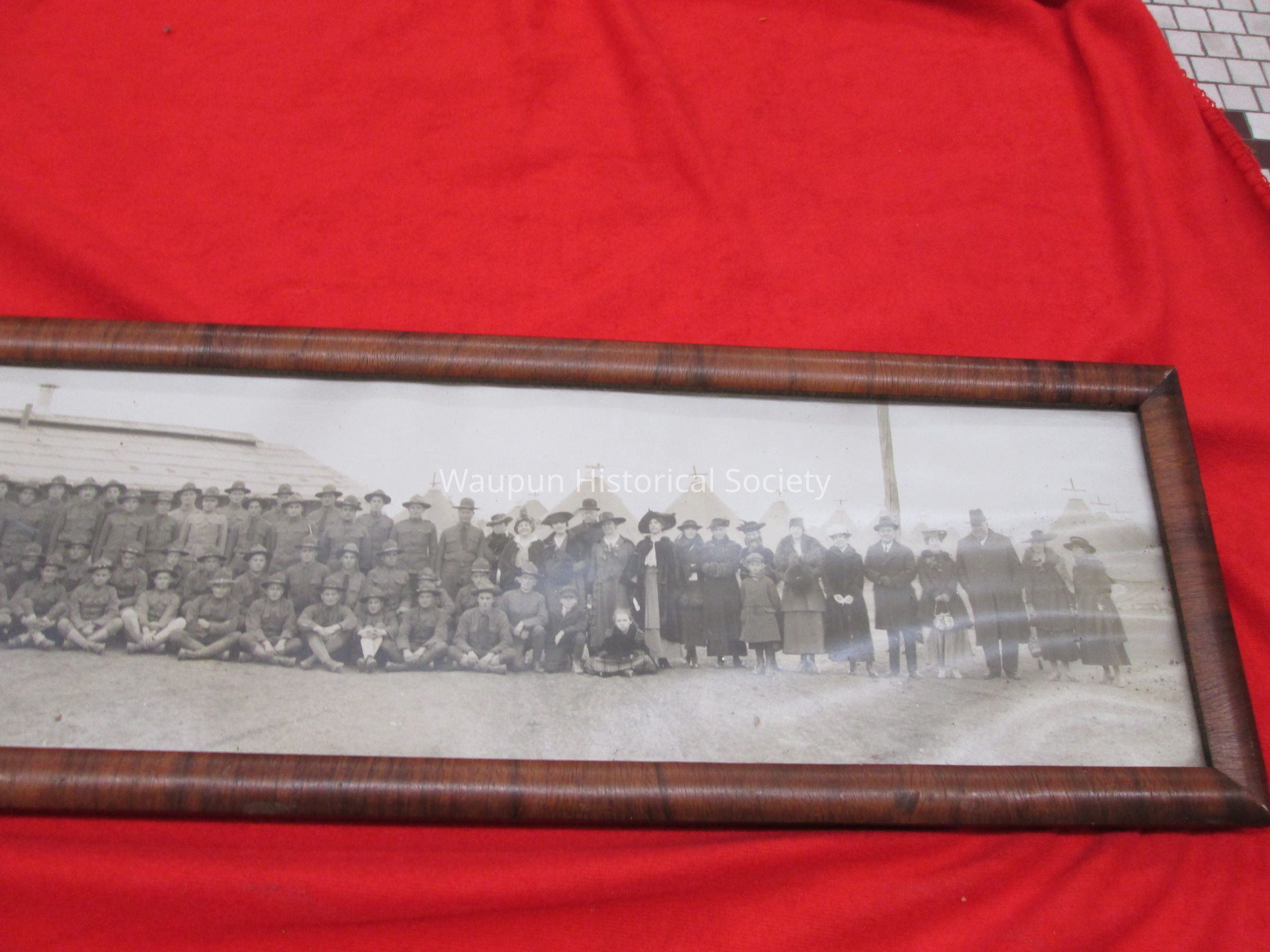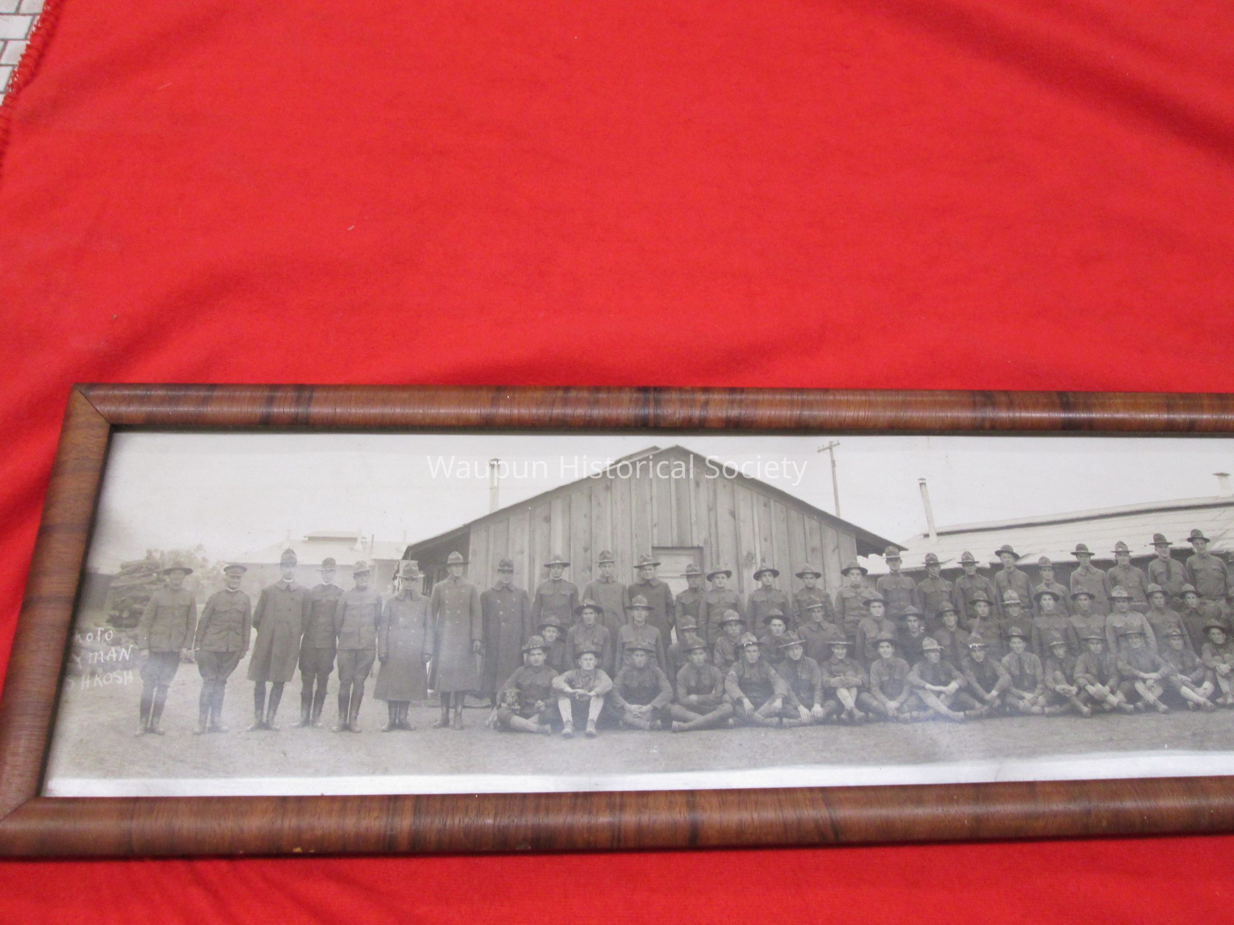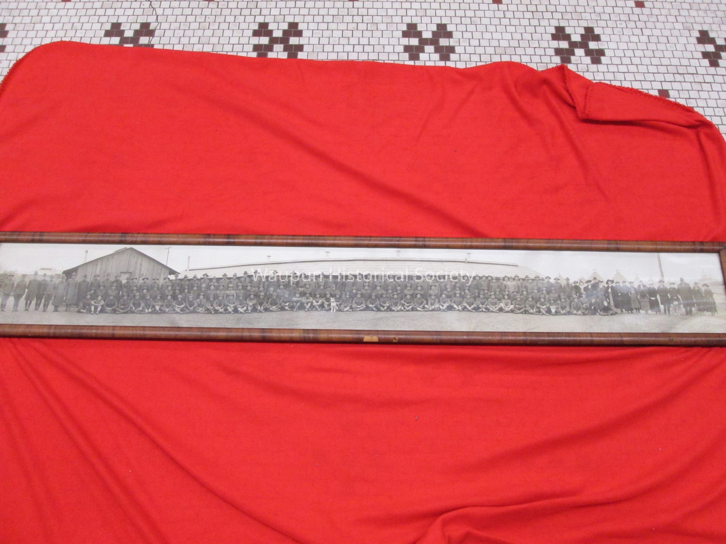 47.5" x 6" photo of military personnel labeled only, "Photo Lyman Oshkosh". No info is listed on front or back of who the men are, what year ther photo is from or why the photo was taken. Photo is in a thin wooden frame with a glass front. Writing on back of frame states, "$400 Armg".Acquisition