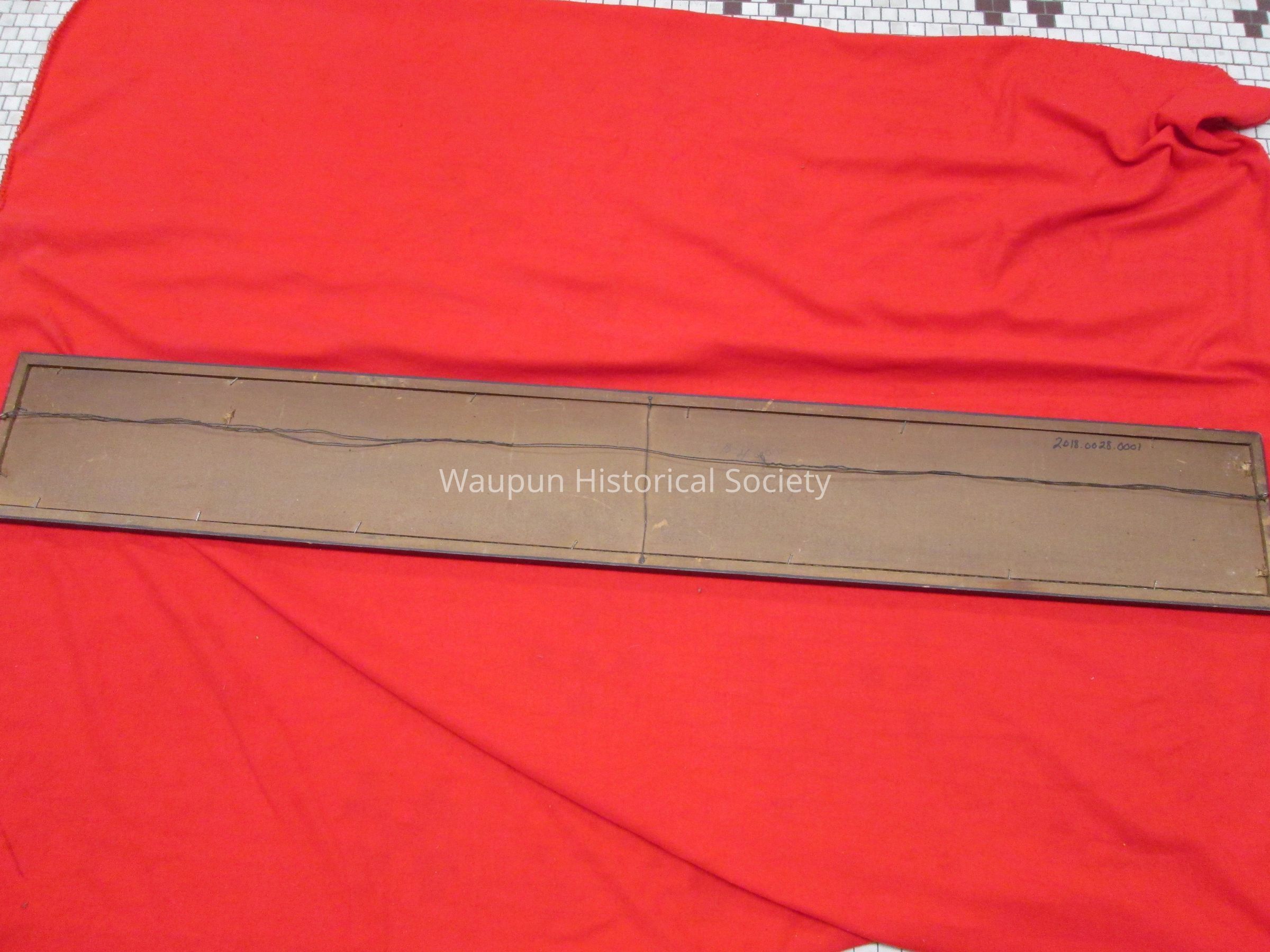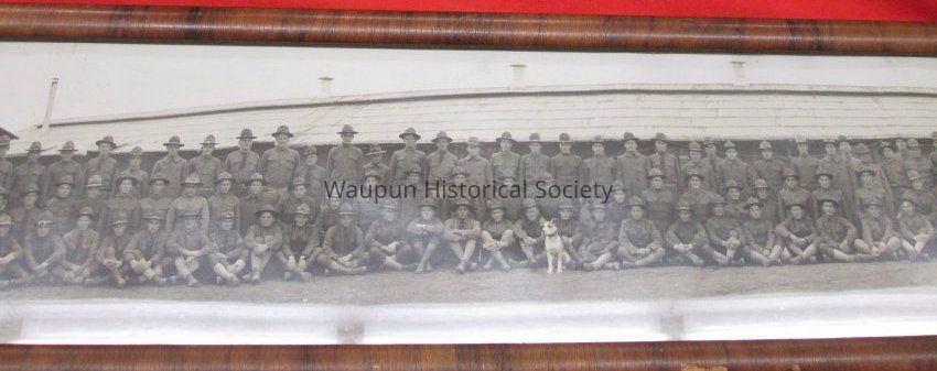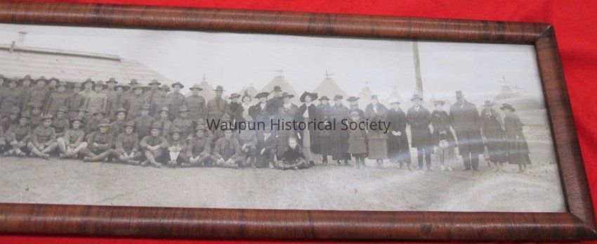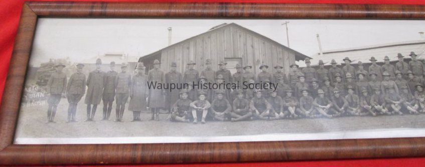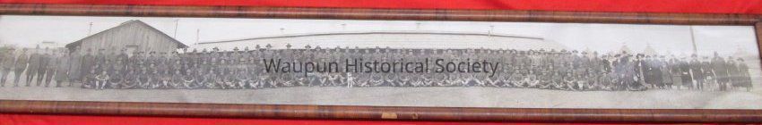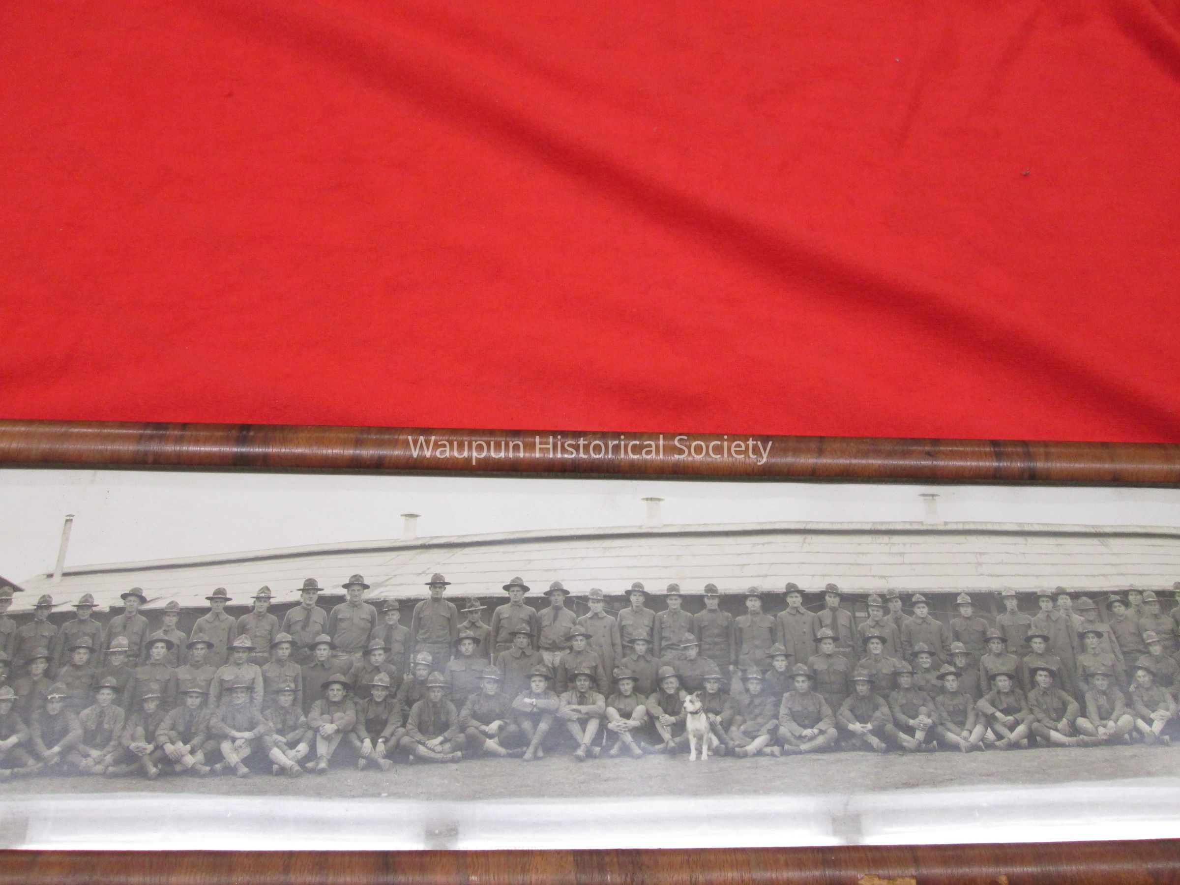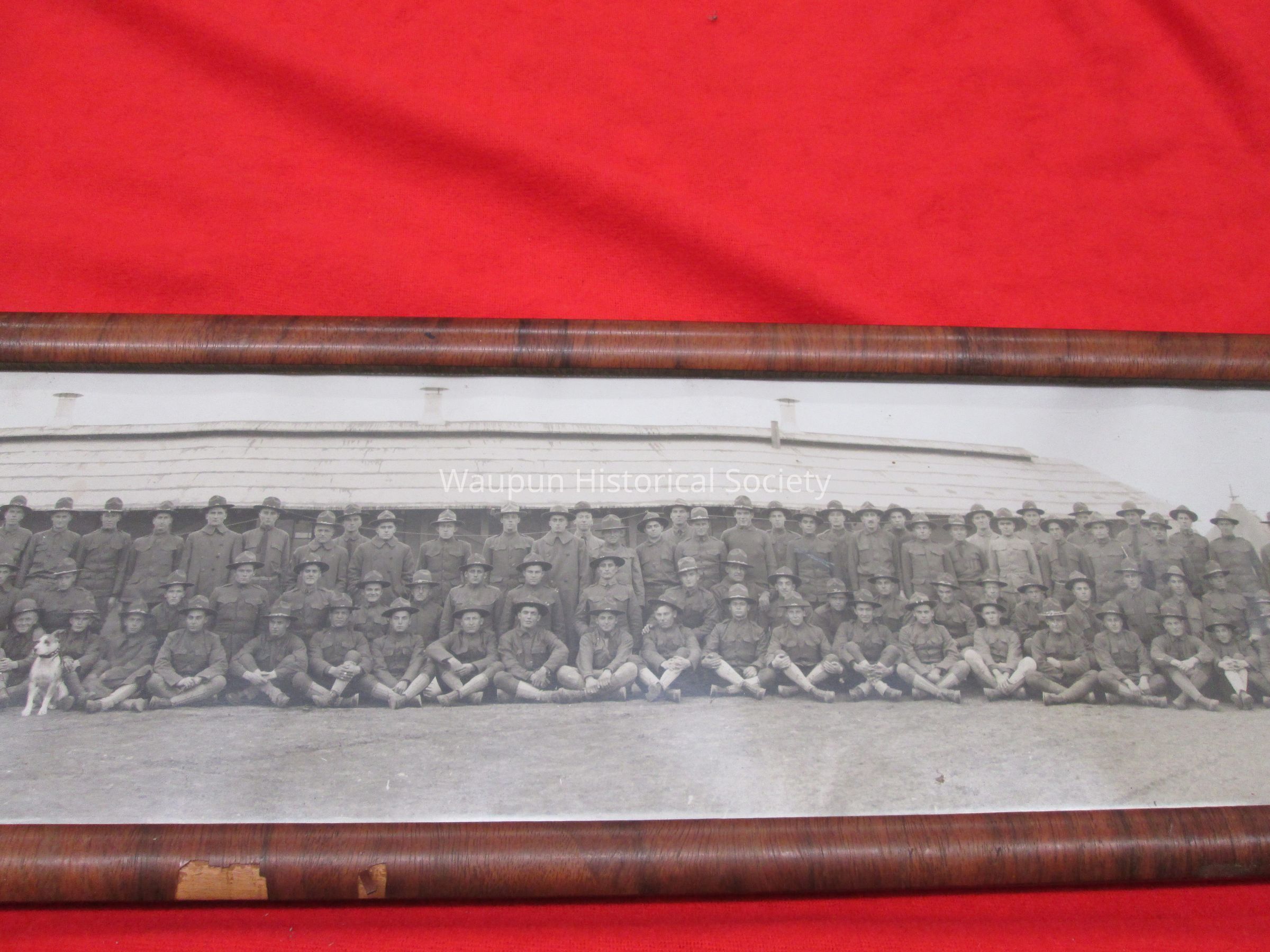 47.5" x 6" photo of military personnel labeled only, "Photo Lyman Oshkosh". No info is listed on front or back of who the men are, what year ther photo is from or why the photo was taken. Photo is in a thin wooden frame with a glass front. Writing on back of frame states, "$400 Armg".Acquisition