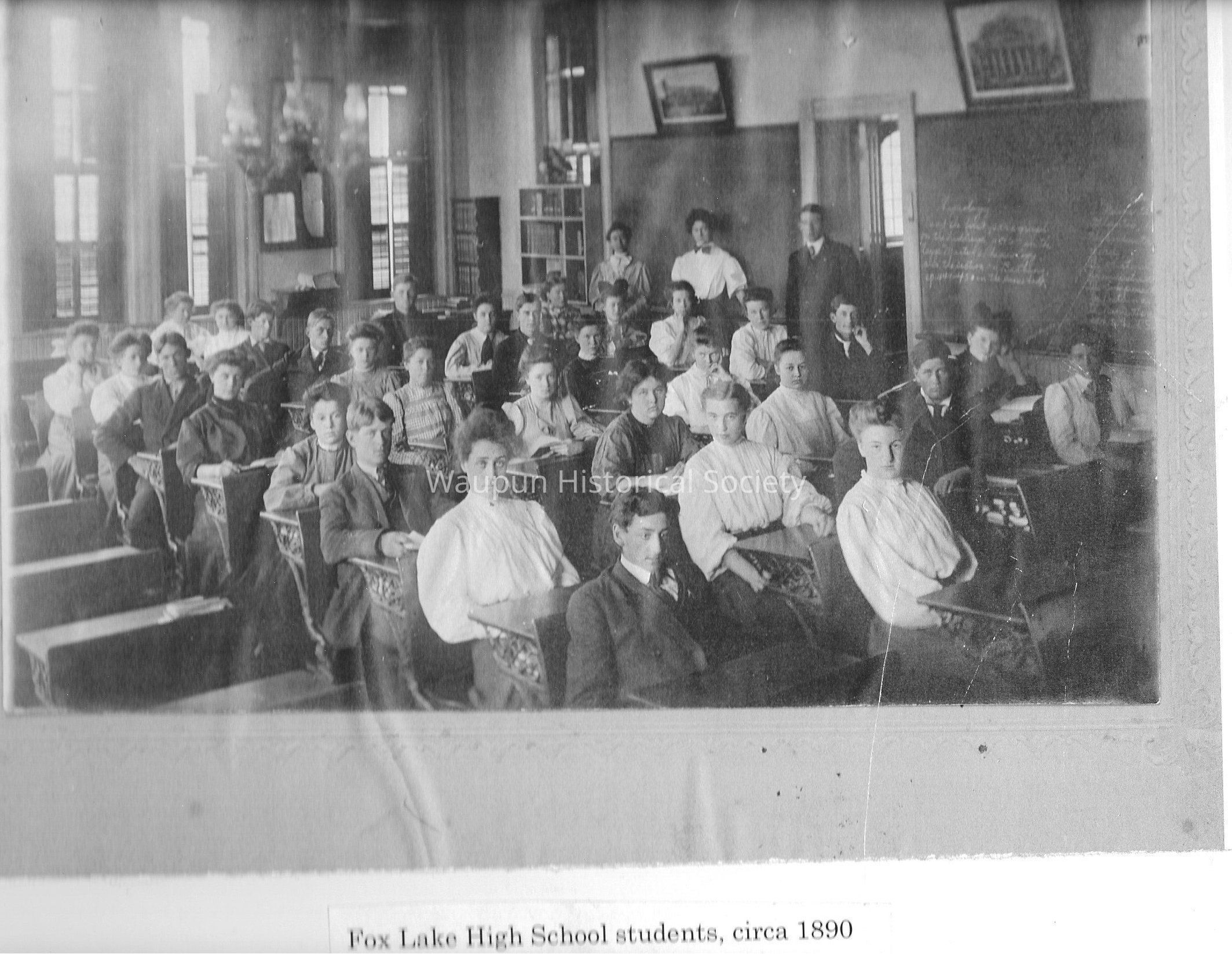11" x 9" Faded black and white photo of Fox Lake High School students, circa 1890. Photo in mounted on foam board.Acquisition