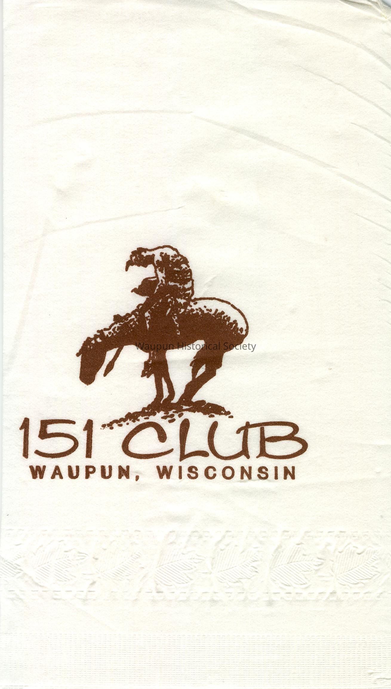 Napkin from 151 Club, Waupun, Wisconsin. Date unknown.