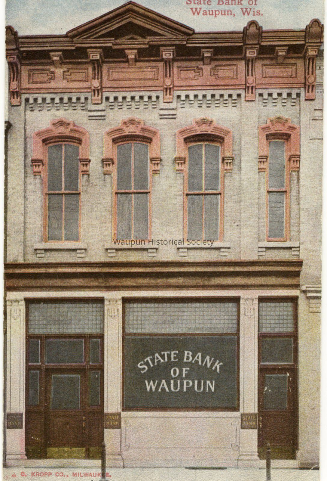 Colorized photo postcard of the Waupun state Bank. This postcard is blank on the reverse side.Acquisition