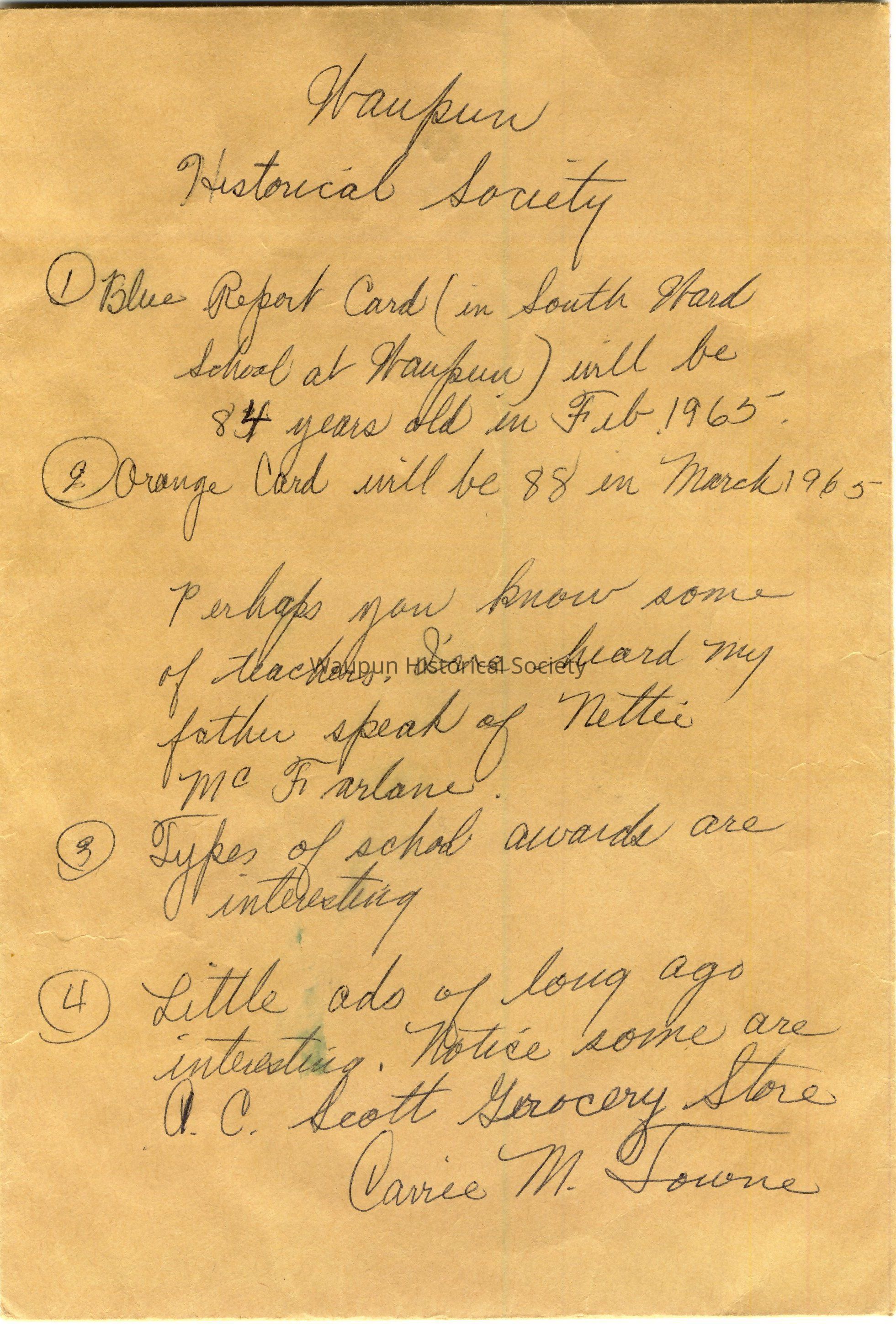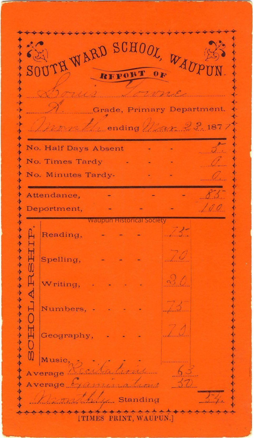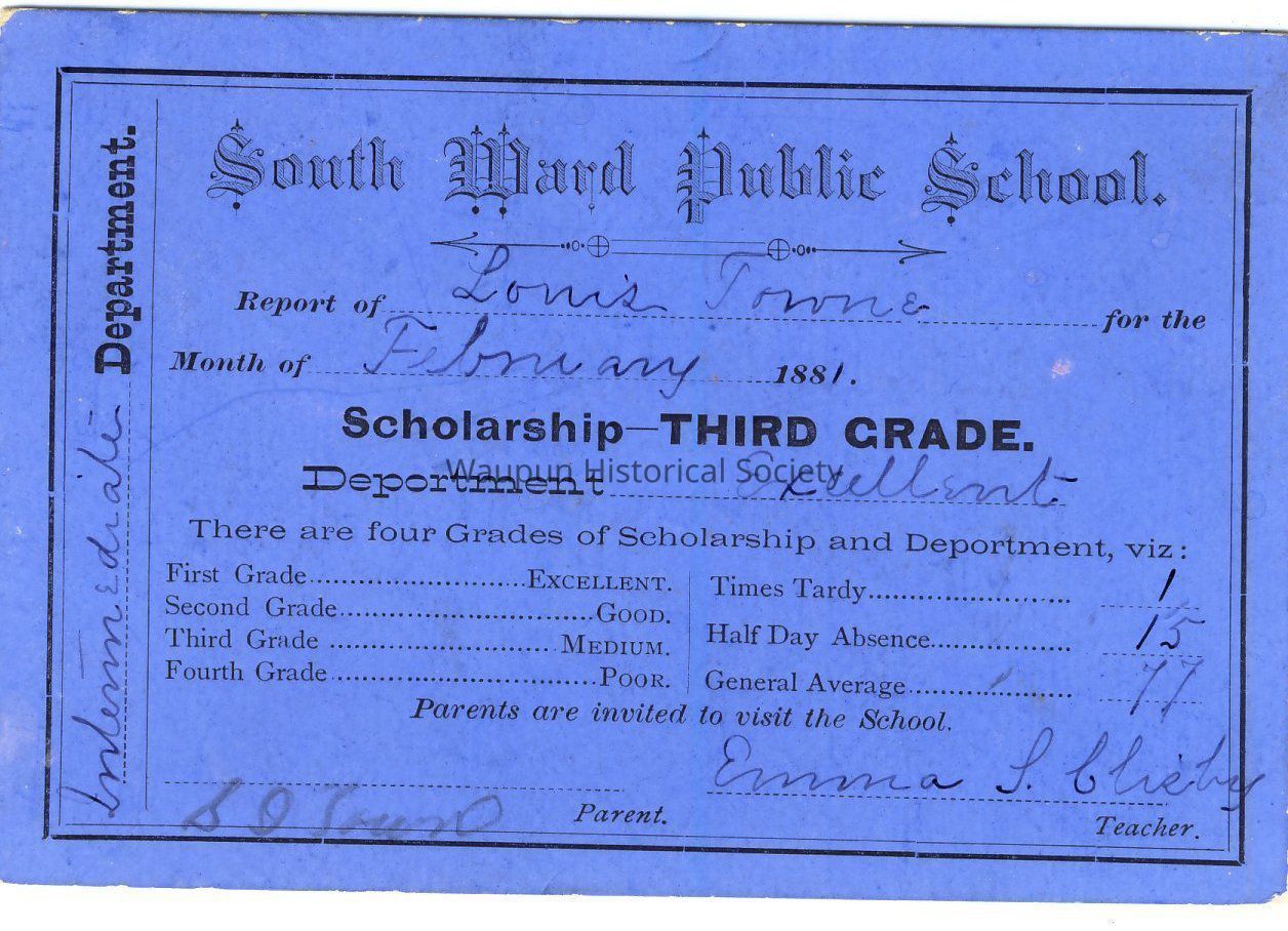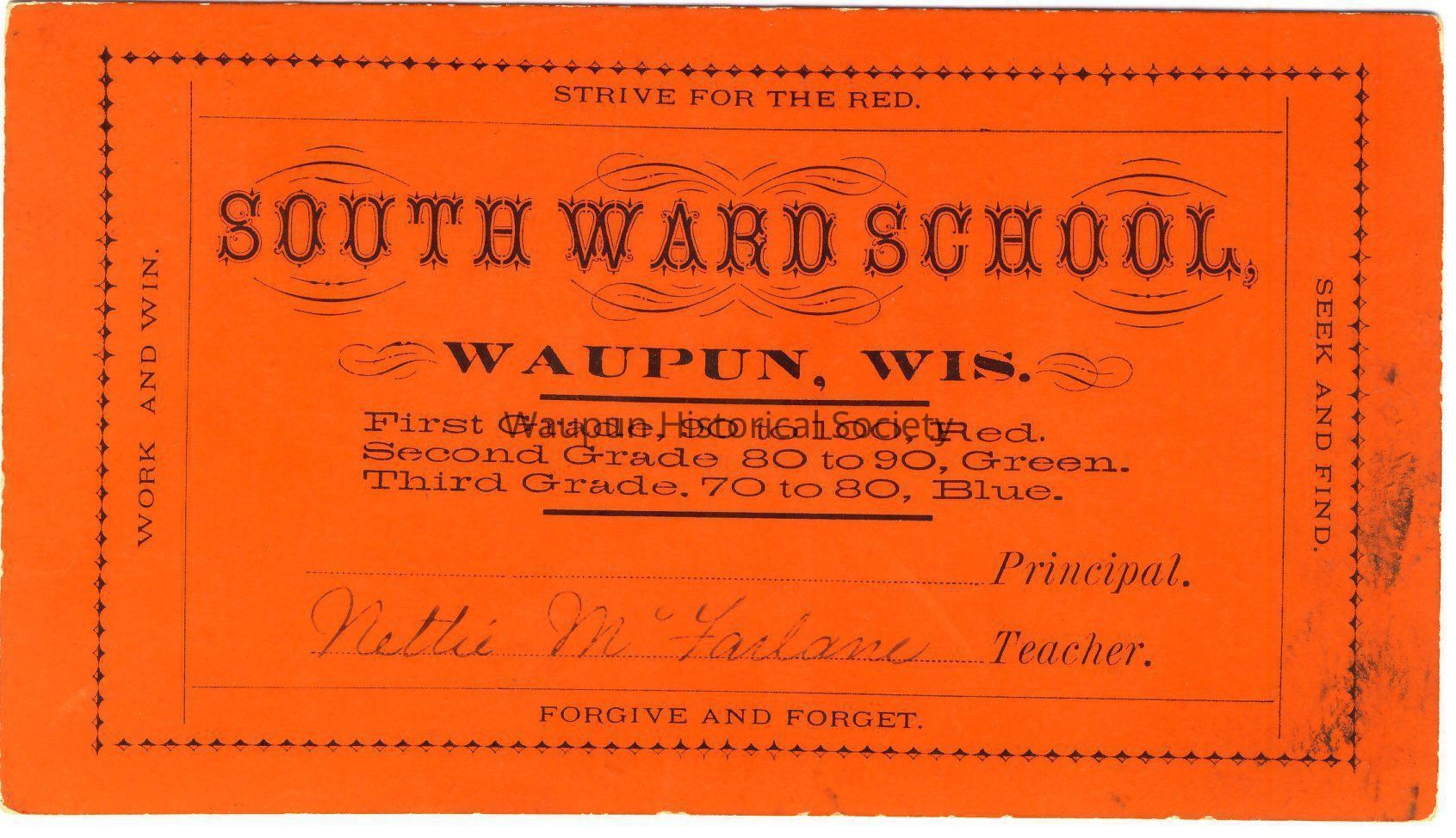 Blue Report Card ( in South Ward School at Waupun) will be 84 years old in Febuary 1965.