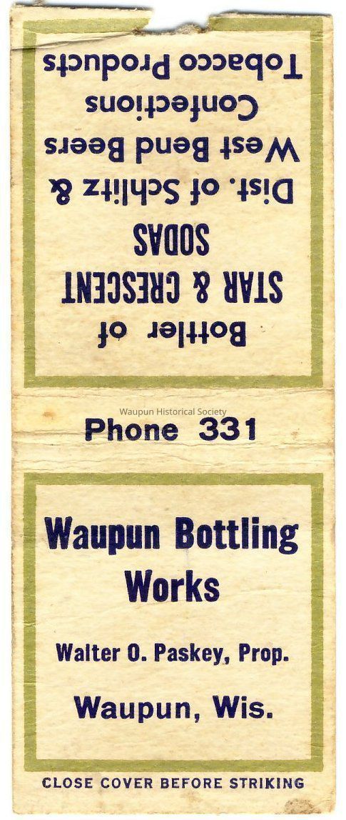 Matchbook advertising Waupun business - Waupun Bottling Works, Walter O. Paskey, Prop., Waupun, Wis/, Phone 331
