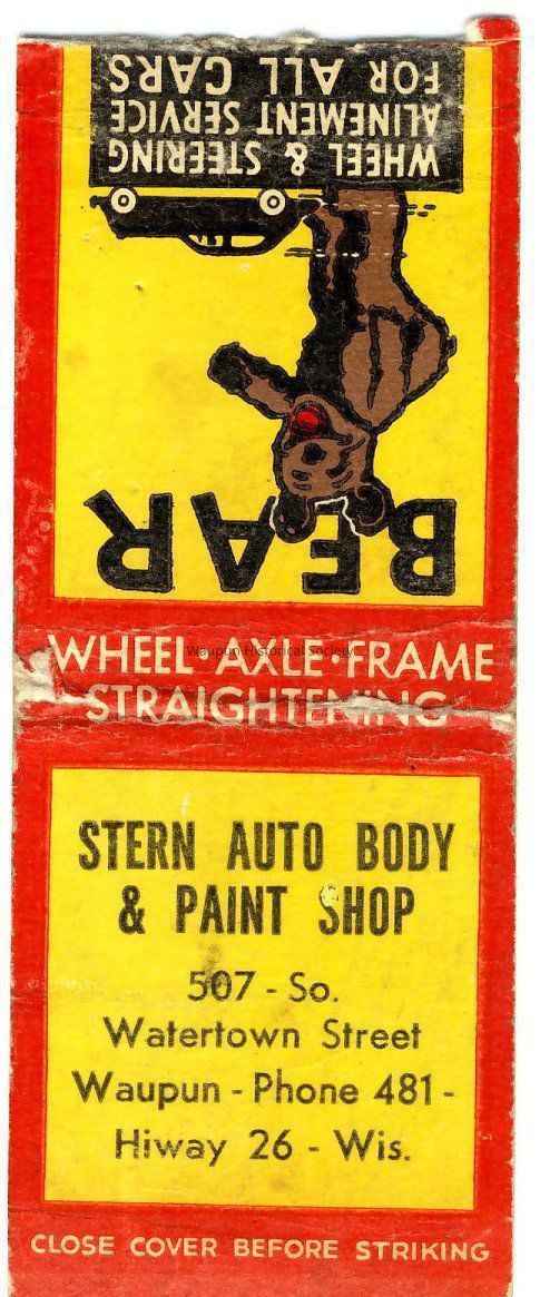 Matchbook advertising Waupun business - Stern Auto Body & Paint Shop, 507 So. Watertown Street, Waupun - Phone 481 - Hiway 26 - Wis.