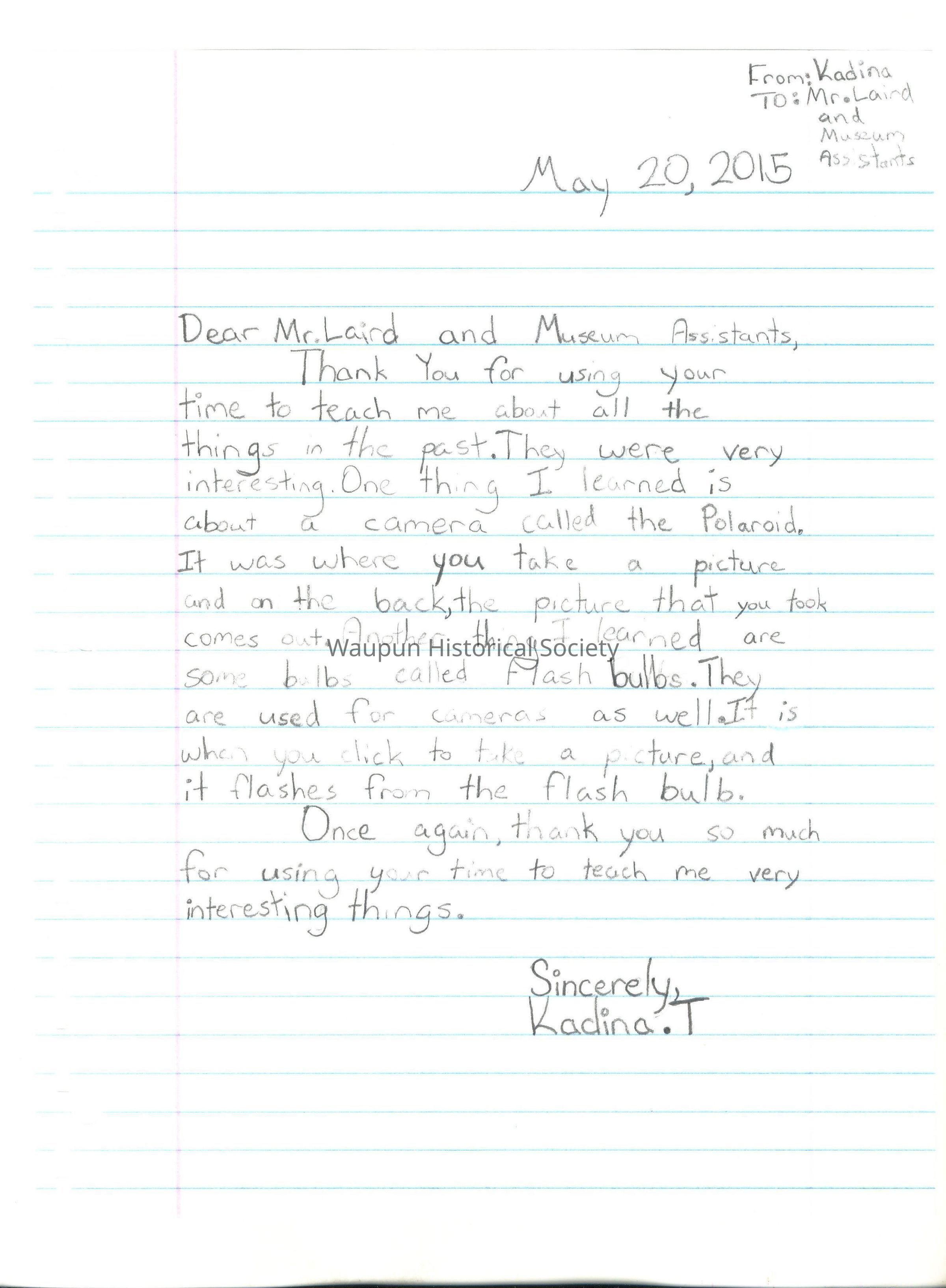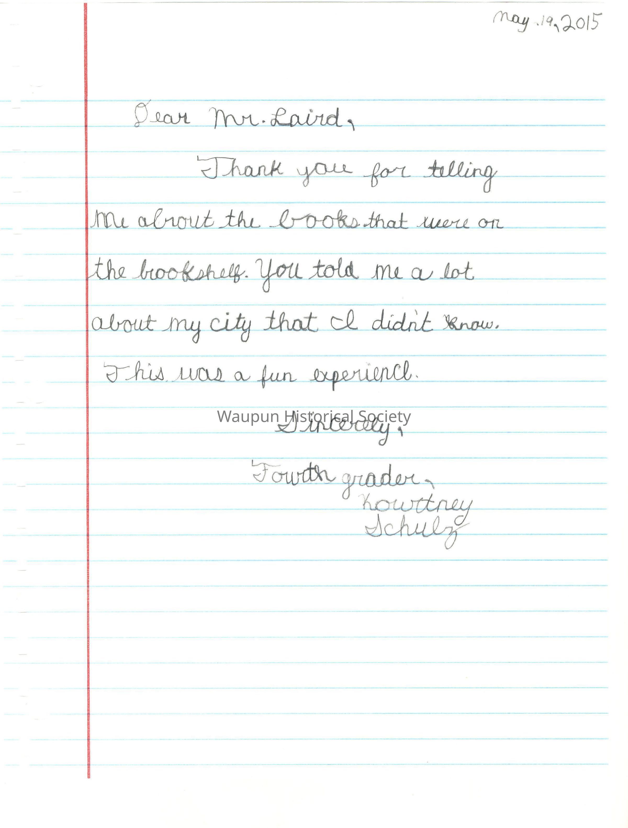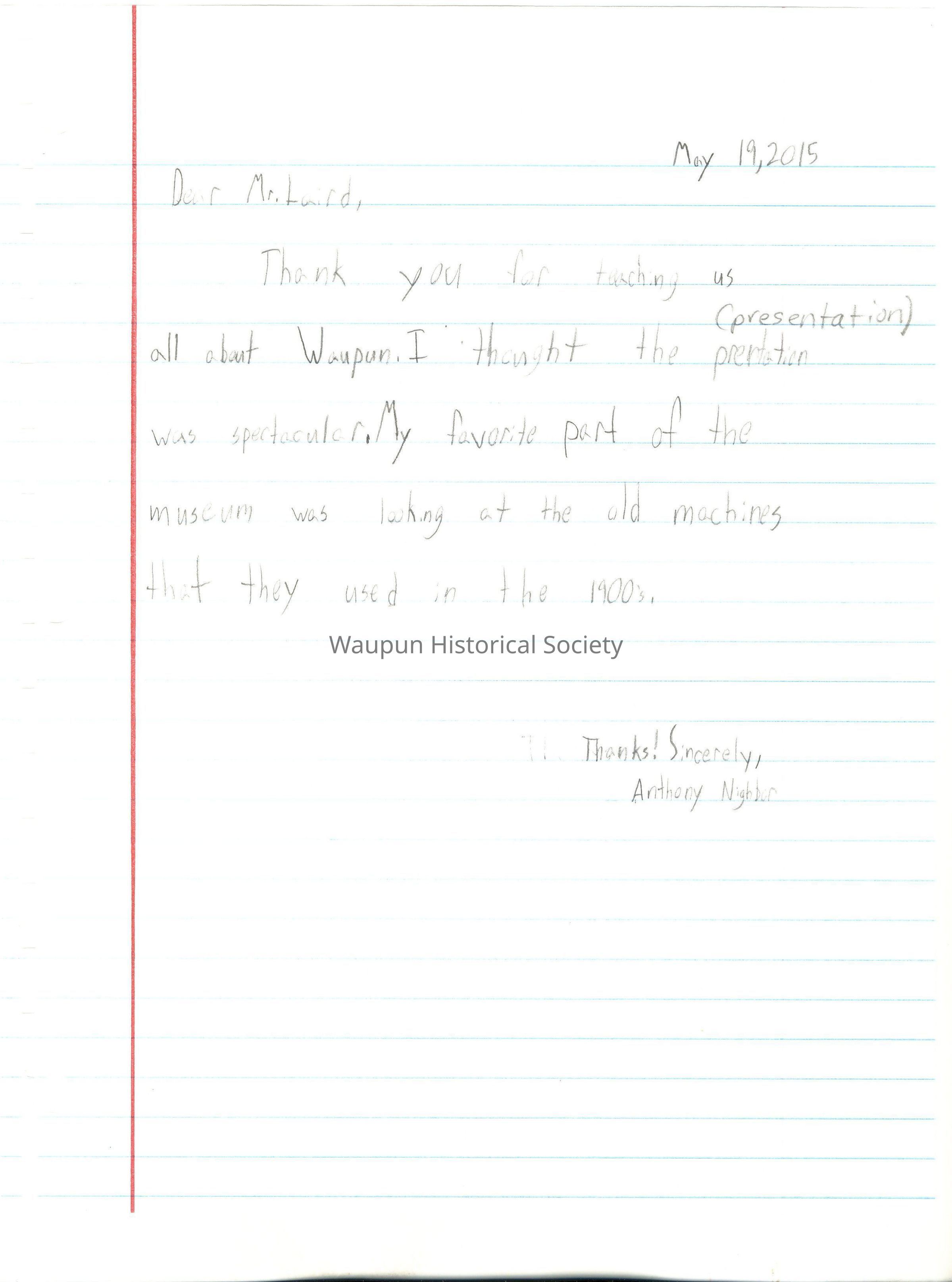 Booklet with Thank You letters to Jim Laird for tour of Historical Museum from 4th graders of Rock River Intermediate School, on May 19, 2015. The letters are entered just as they appear in the booklet without any grammatical corrections.