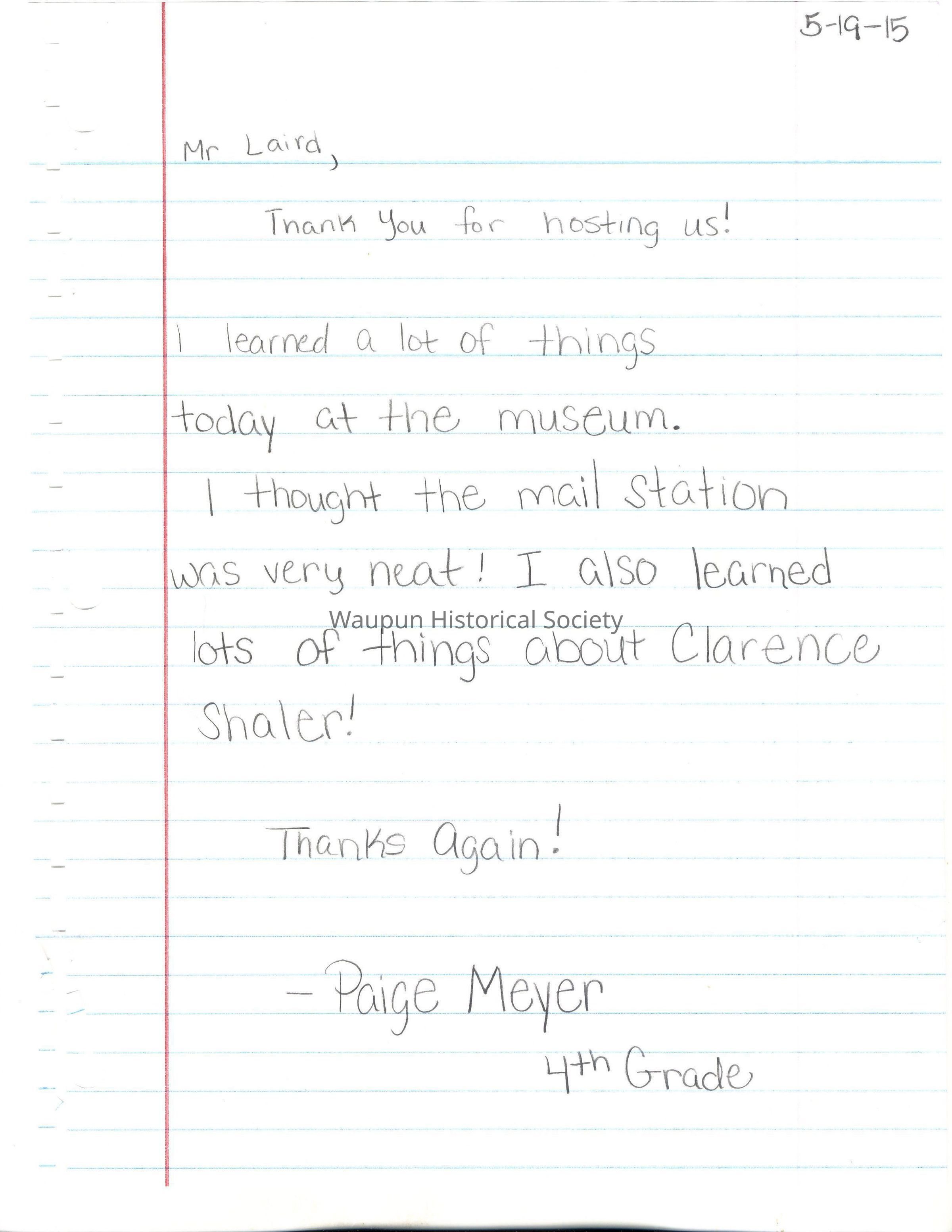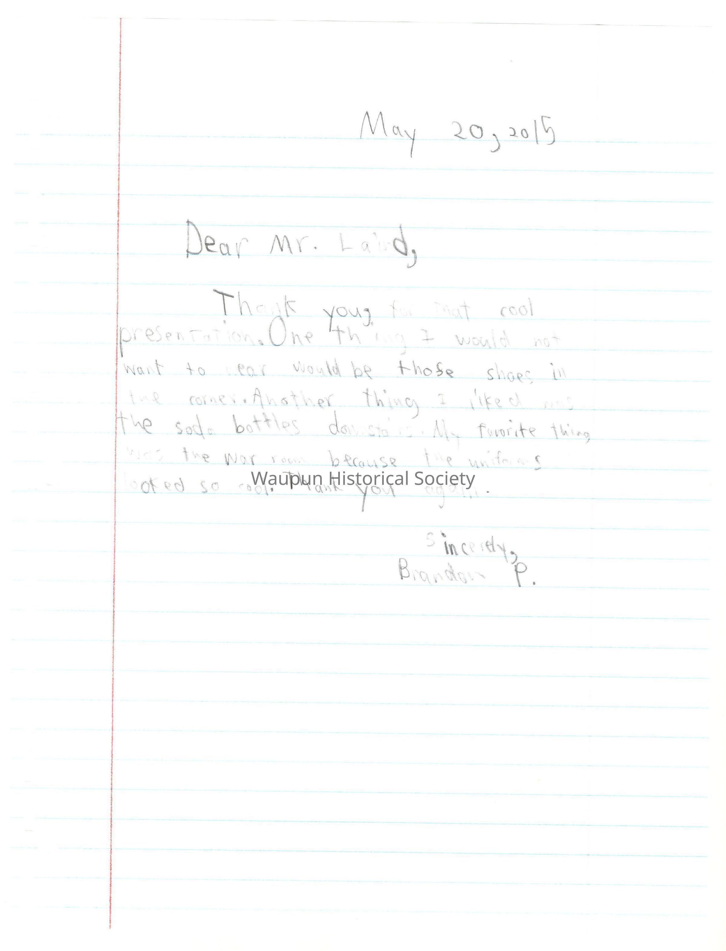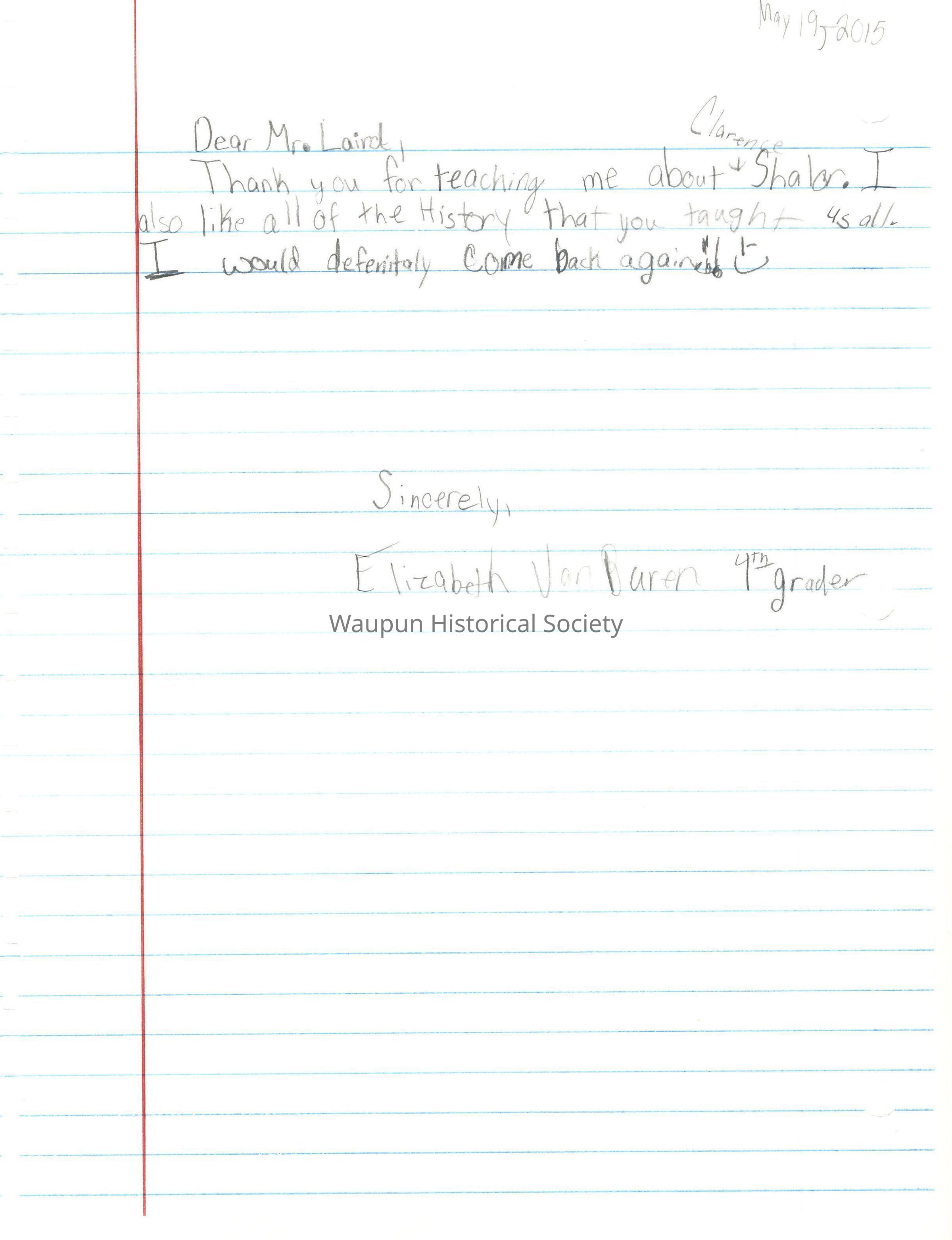 Booklet with Thank You letters to Jim Laird for tour of Historical Museum from 4th graders of Rock River Intermediate School, on May 19, 2015. The letters are entered just as they appear in the booklet without any grammatical corrections.