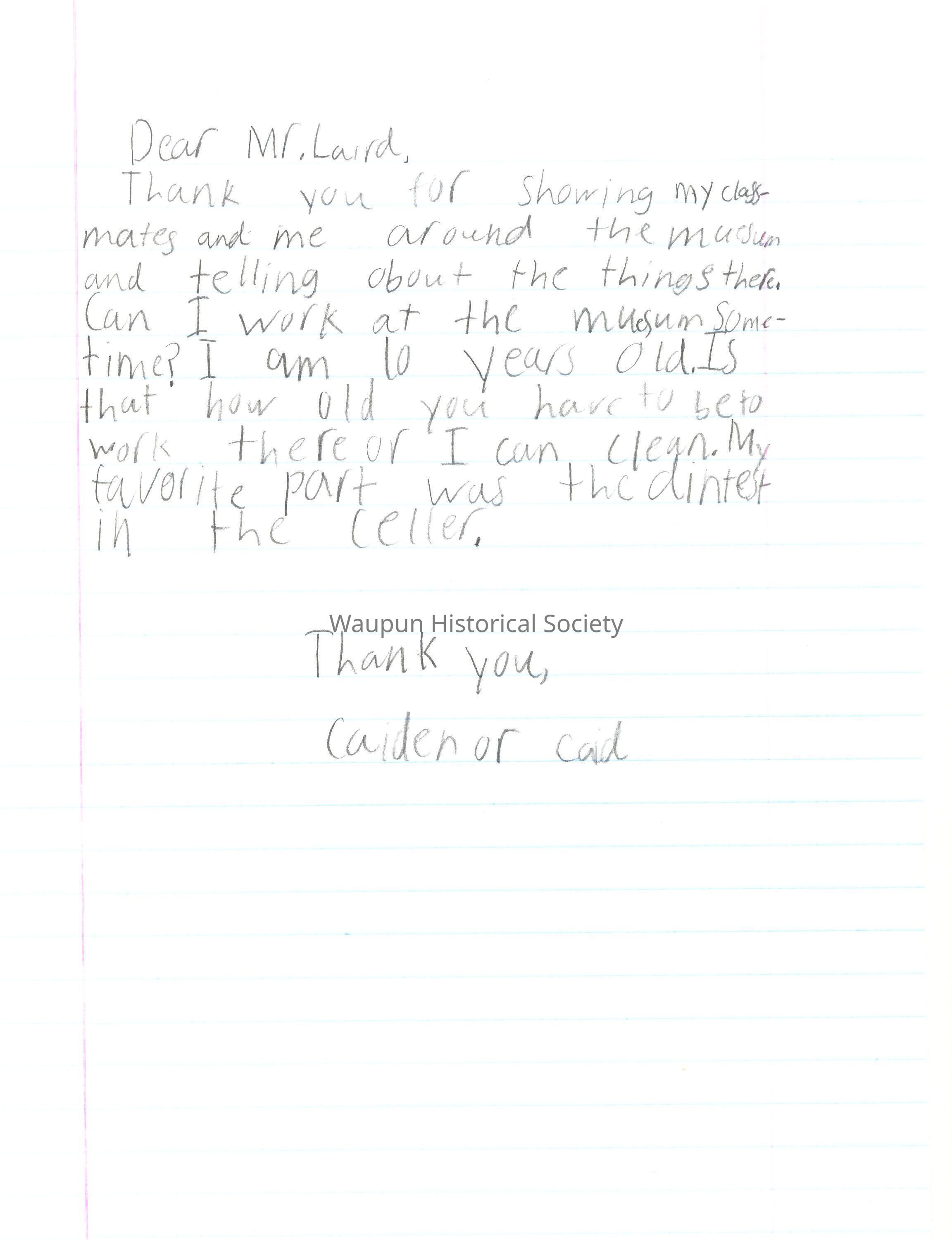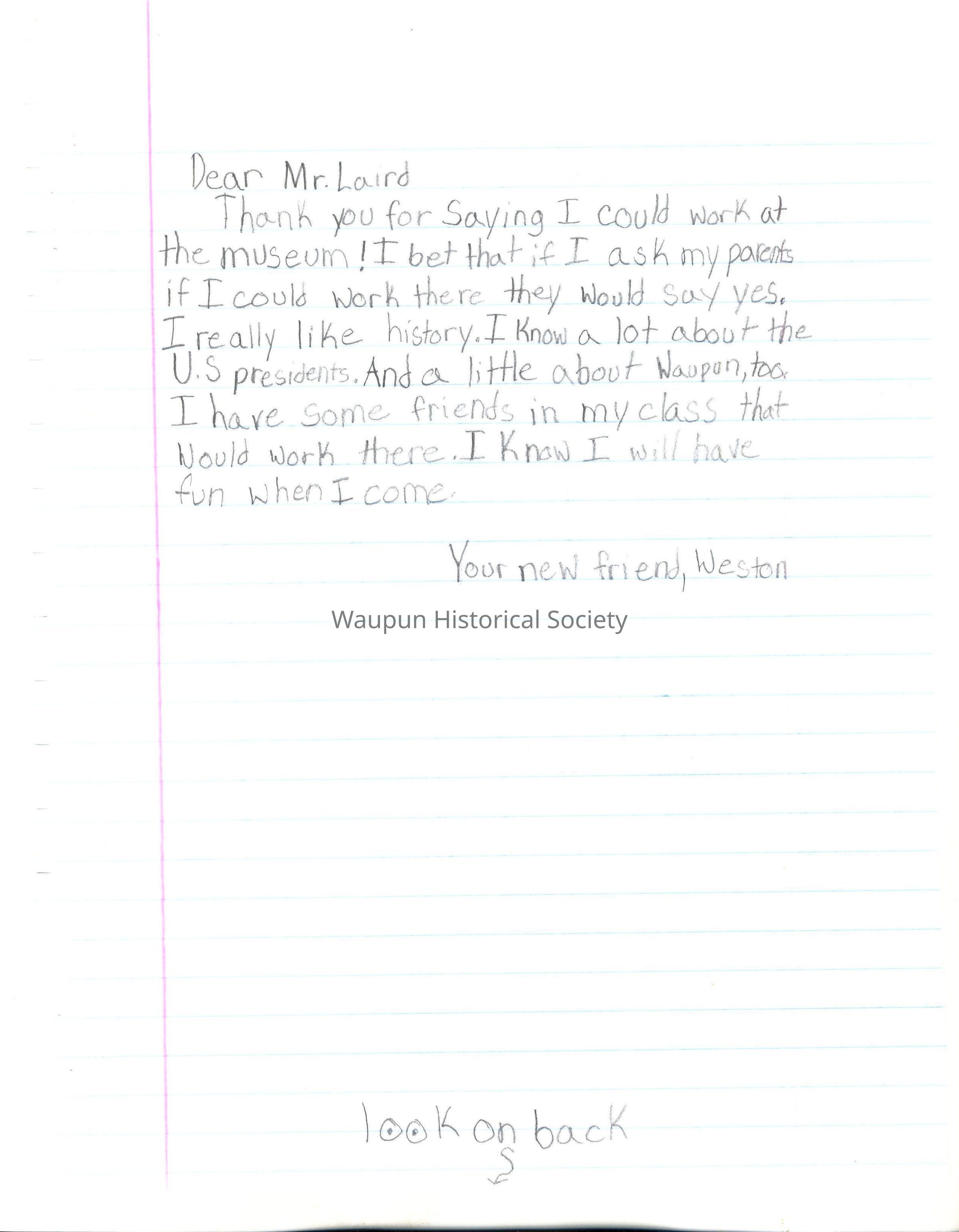 Thank you for saying I could work at the museum! I bet that if I ask my parents if I could work there they would say yes. I really like history. I know a lot about the U.S. presidents. And a little about Waupun, too. I have some friends in my class that would work there. I know I will have fun when I come.