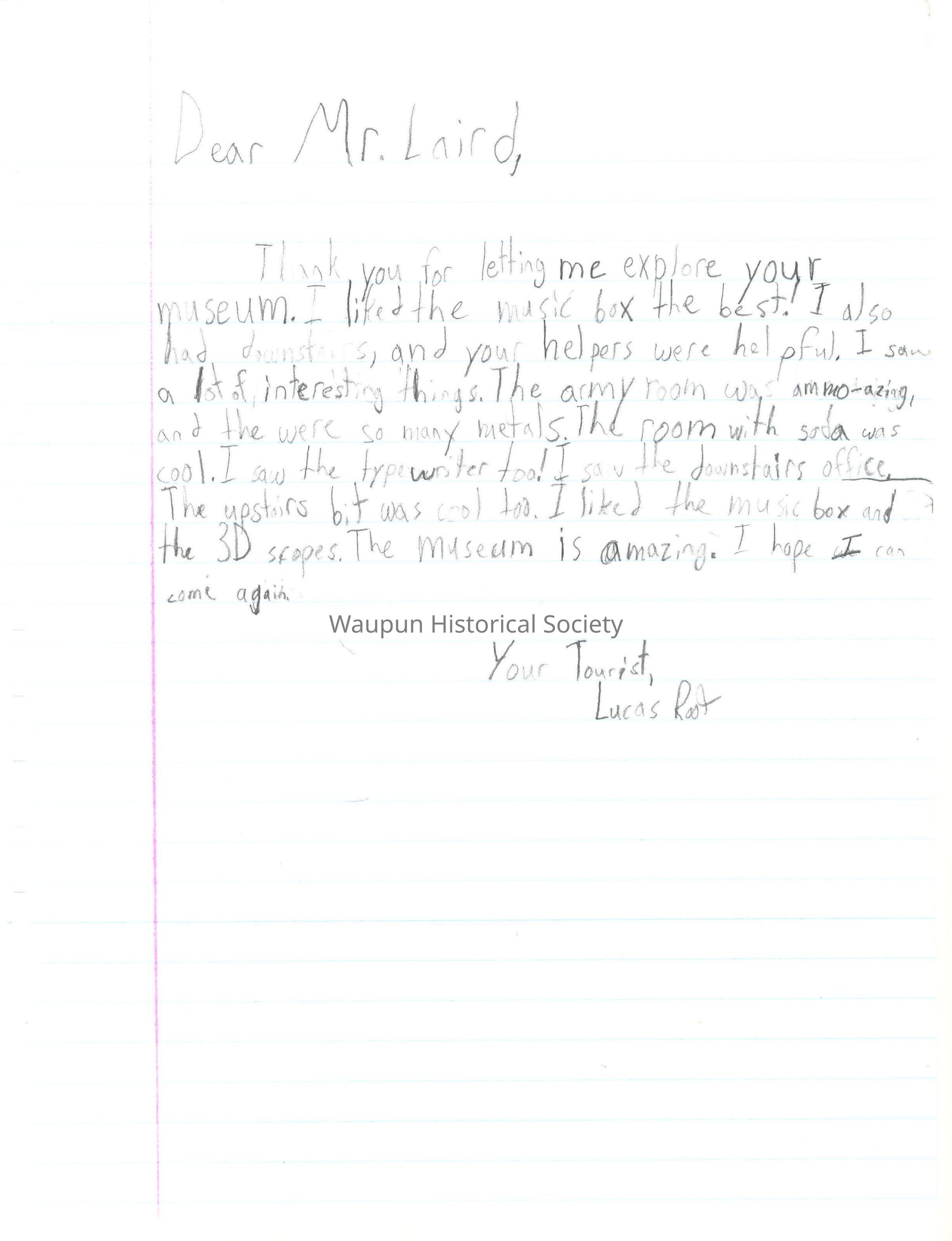Thank you for letting me explore your museum. I liked the music box the best! I also had downstairs, and your helpers were helpful. I saw a lot of interesting things. The army room was ammo-azing and there were so many metals. The room with soda was cool. I saw the typewriter too! I saw the downstairs office. The upstairs bit was cool too. I liked the music box and the 3D scopes. The museum is amazing. I hope I can come again.