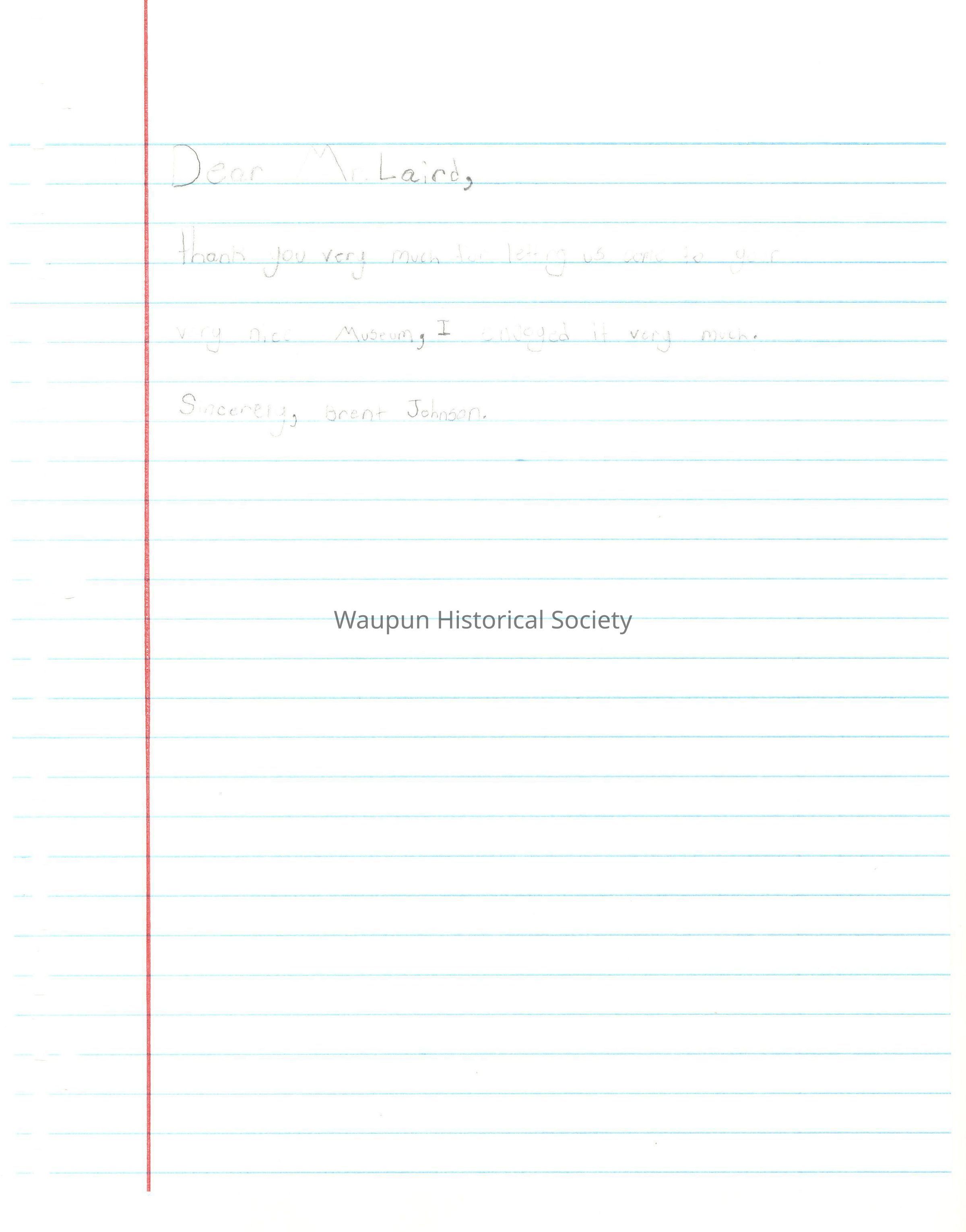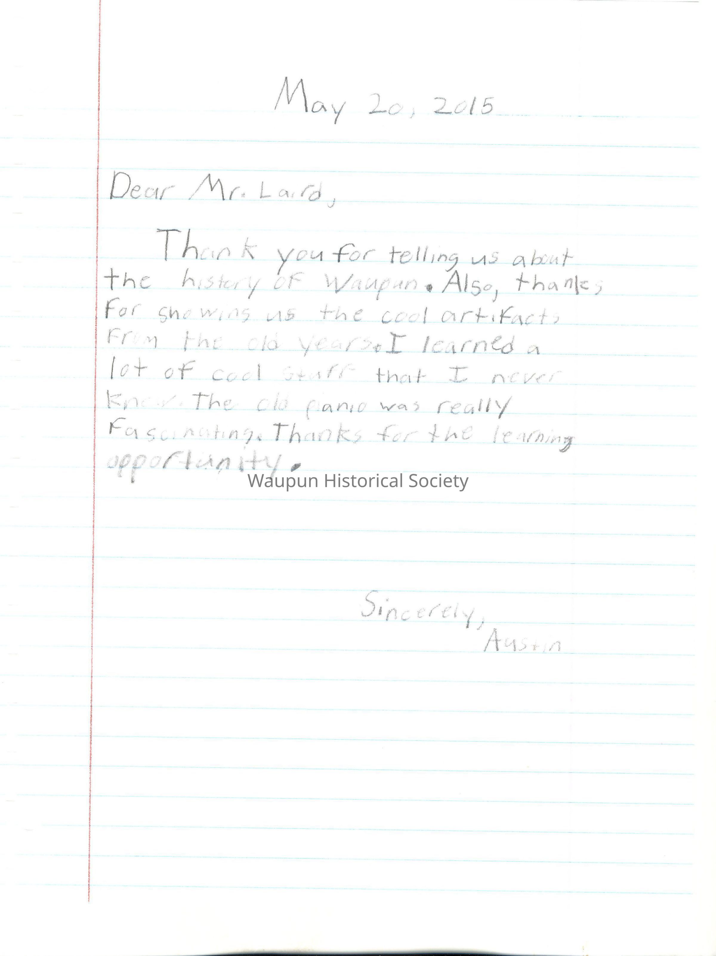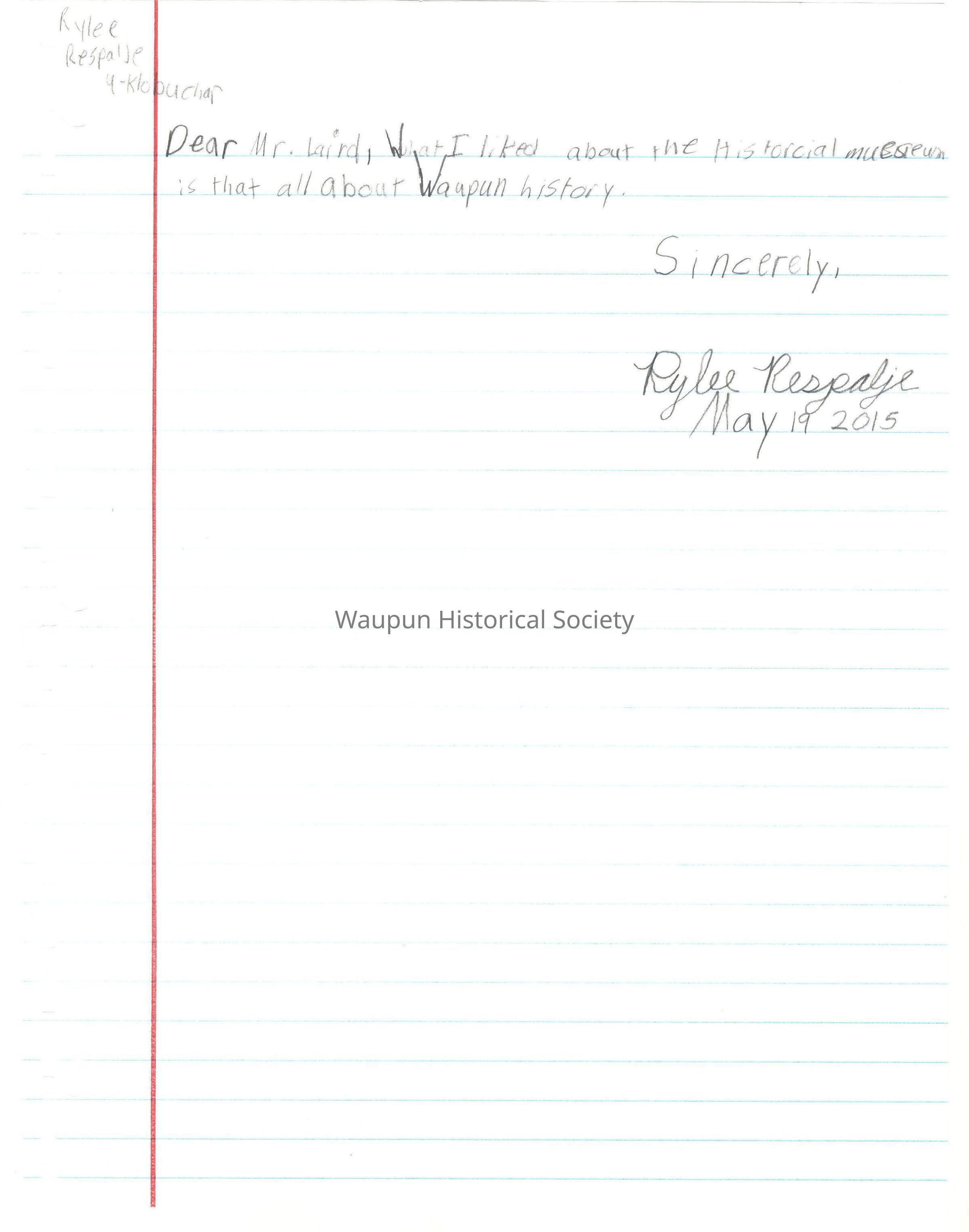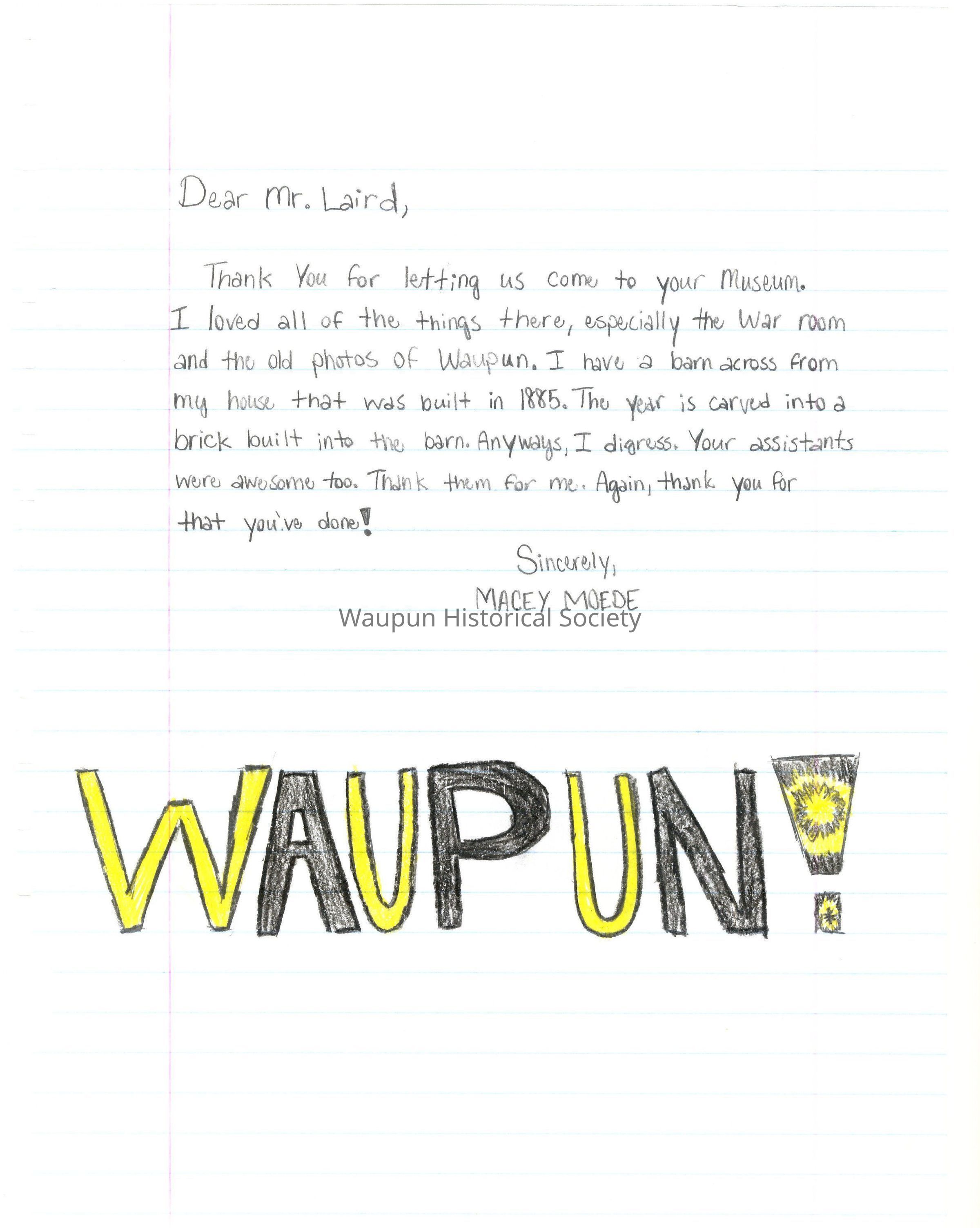 Dear Mr. Laird, What I liked about the Historical museum is that all about Waupun history.