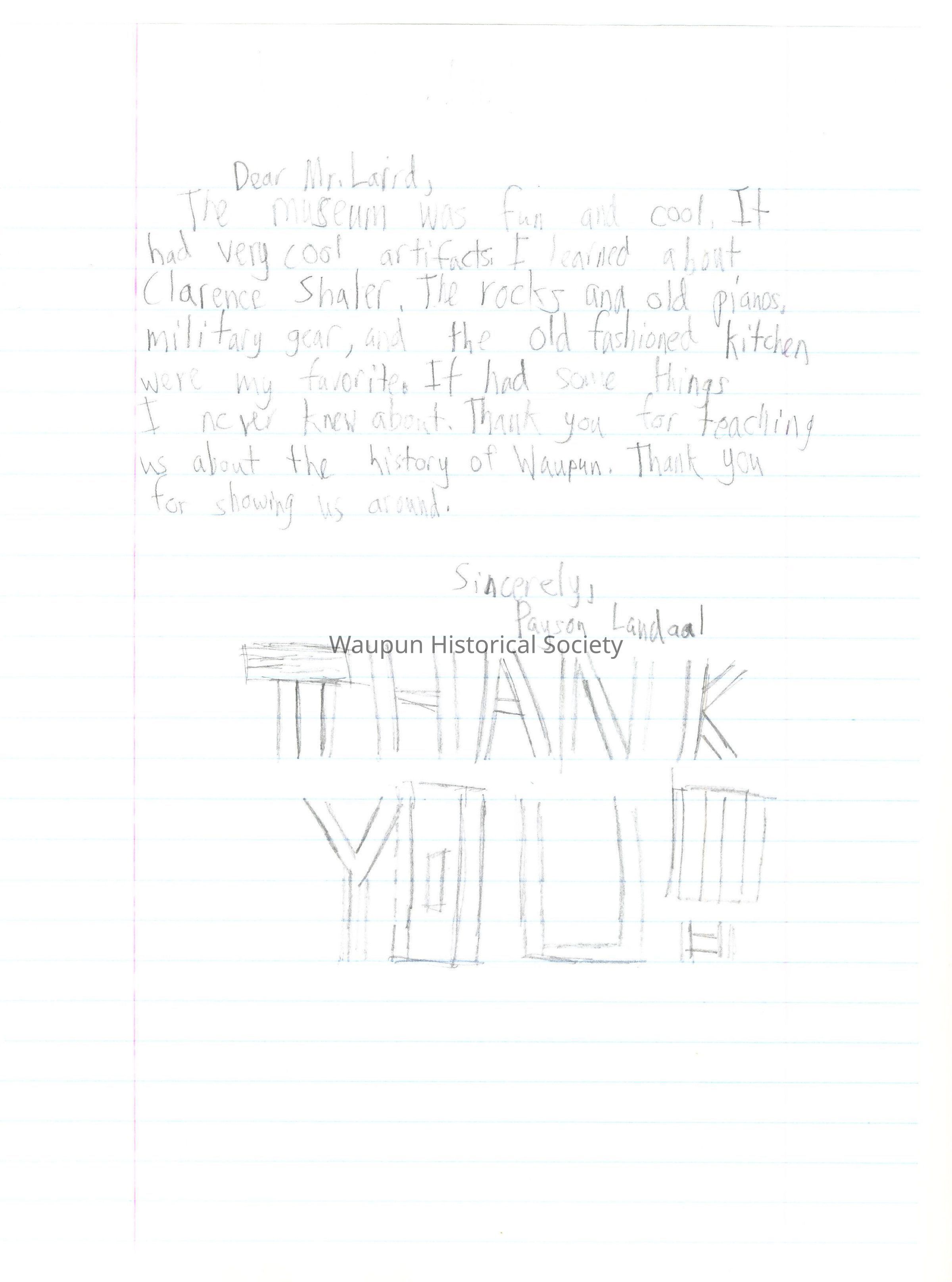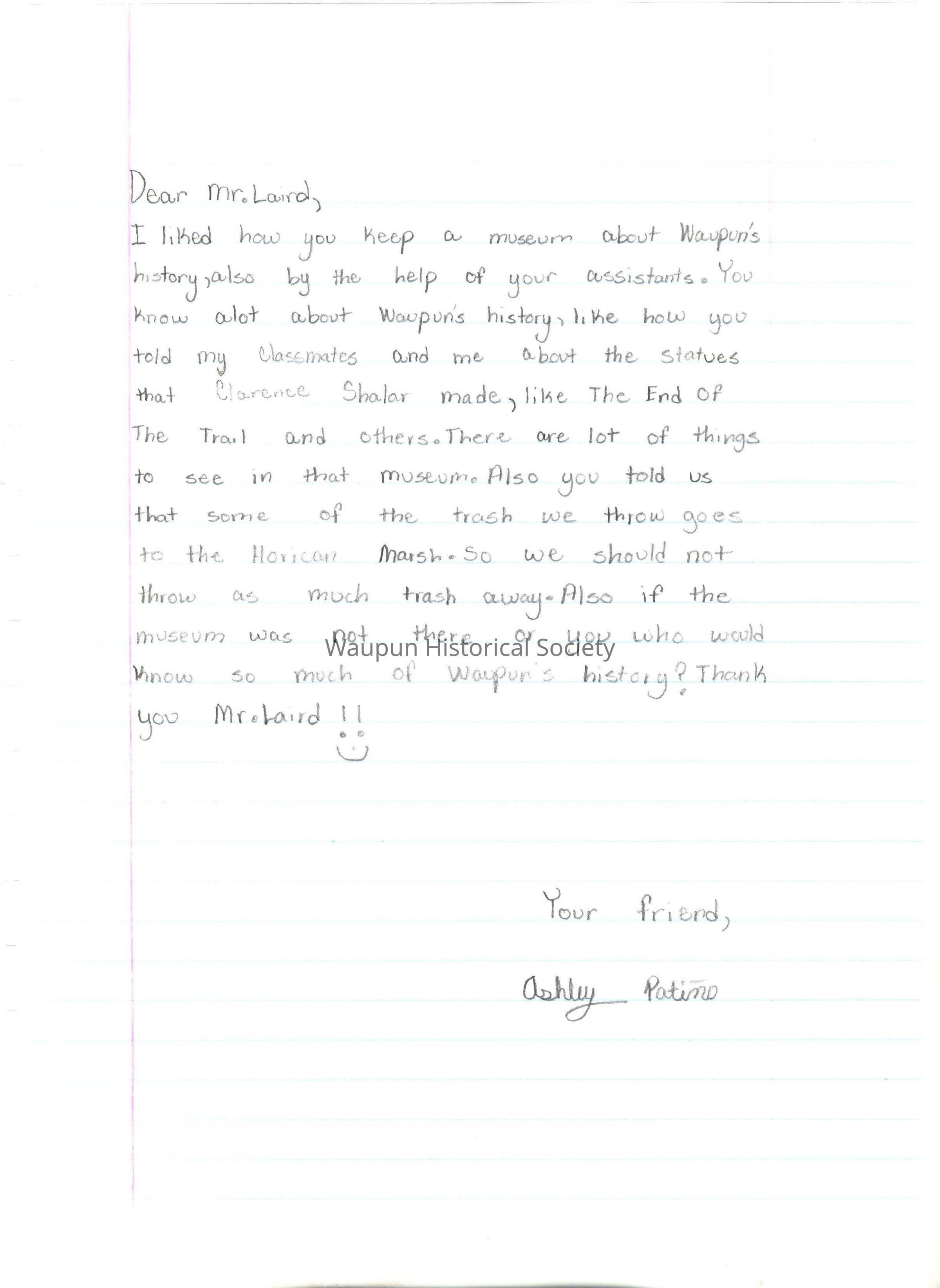 I liked how you keep a museum about Waupun's history, also by the help of your assistants. You know a lot about Waupun's history, like how you told my classmates and me about the statues that Clarence Shaler made, like The End of the Trail and others. There are lot of things to see in that museum. Also you told us that some of the trash we throw goes to the Horicon Marsh. So we should not throw as much trash away. Also if the museum was not there or you who would know so much of Waupun's history? Thank you Mr. Laird!!