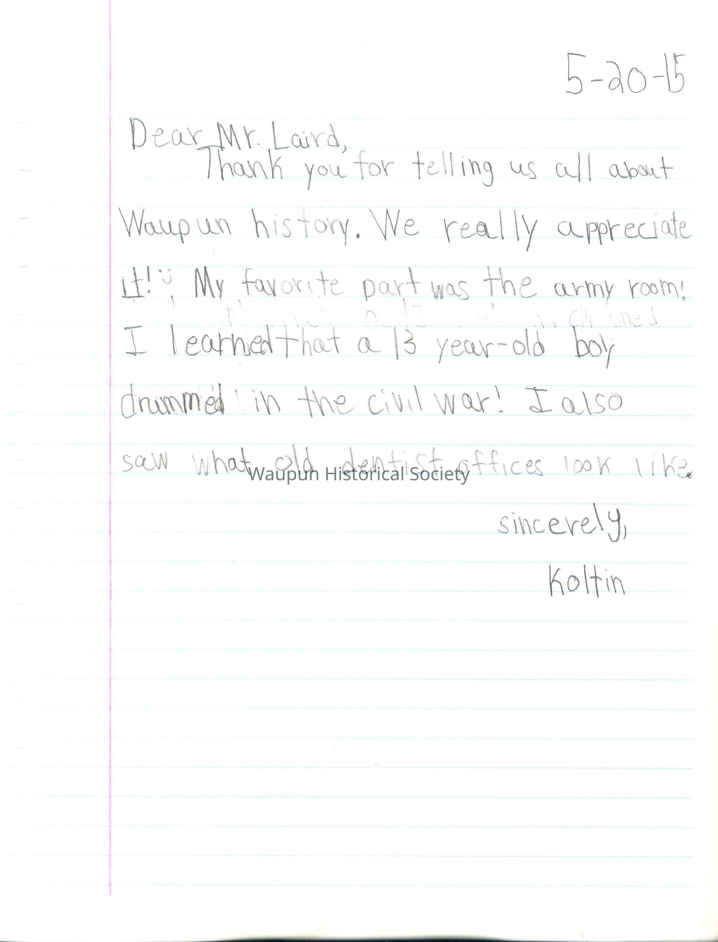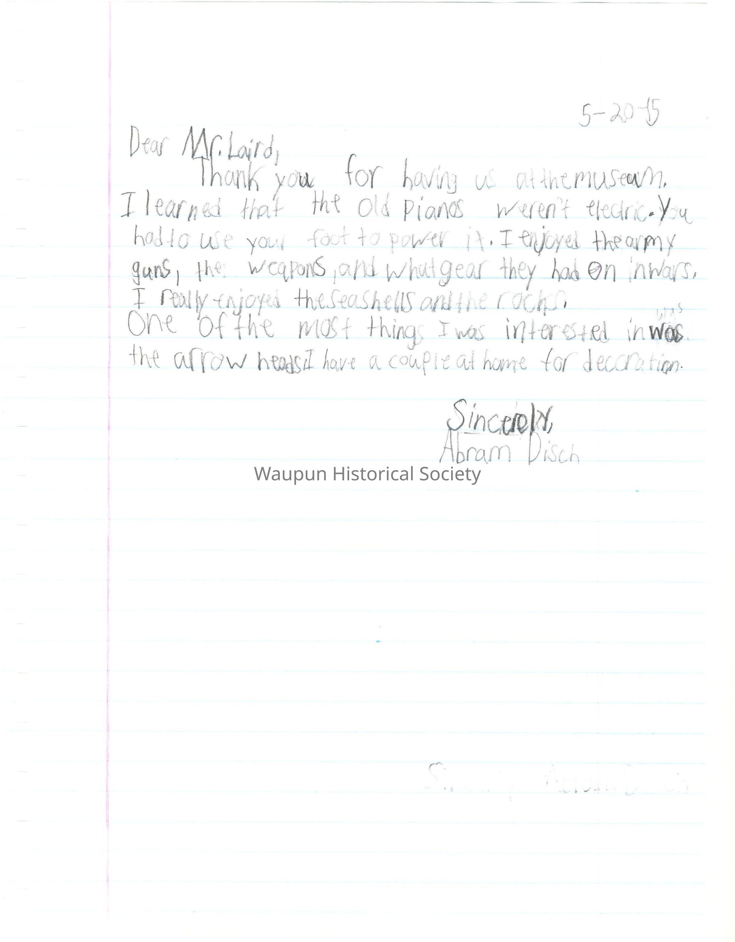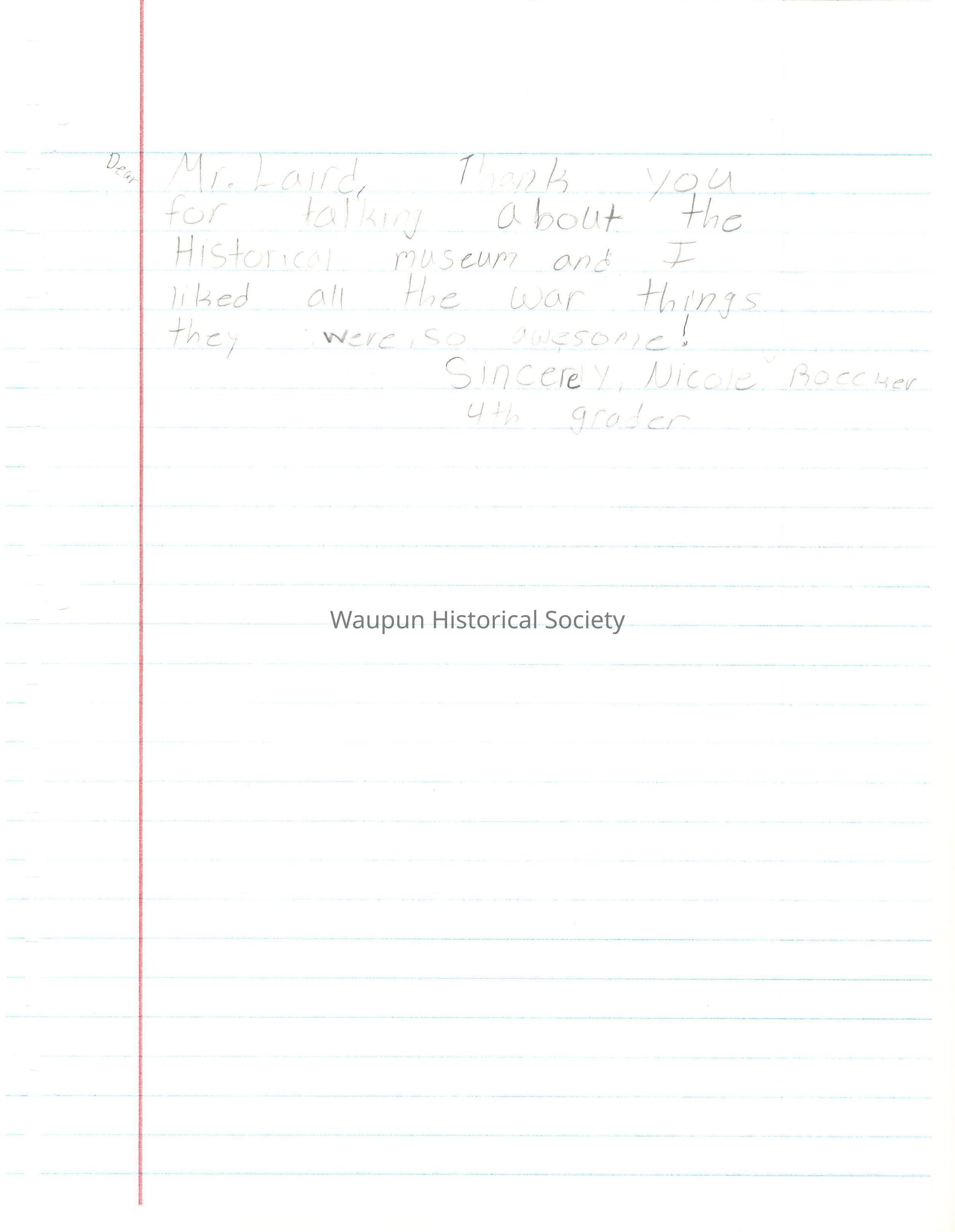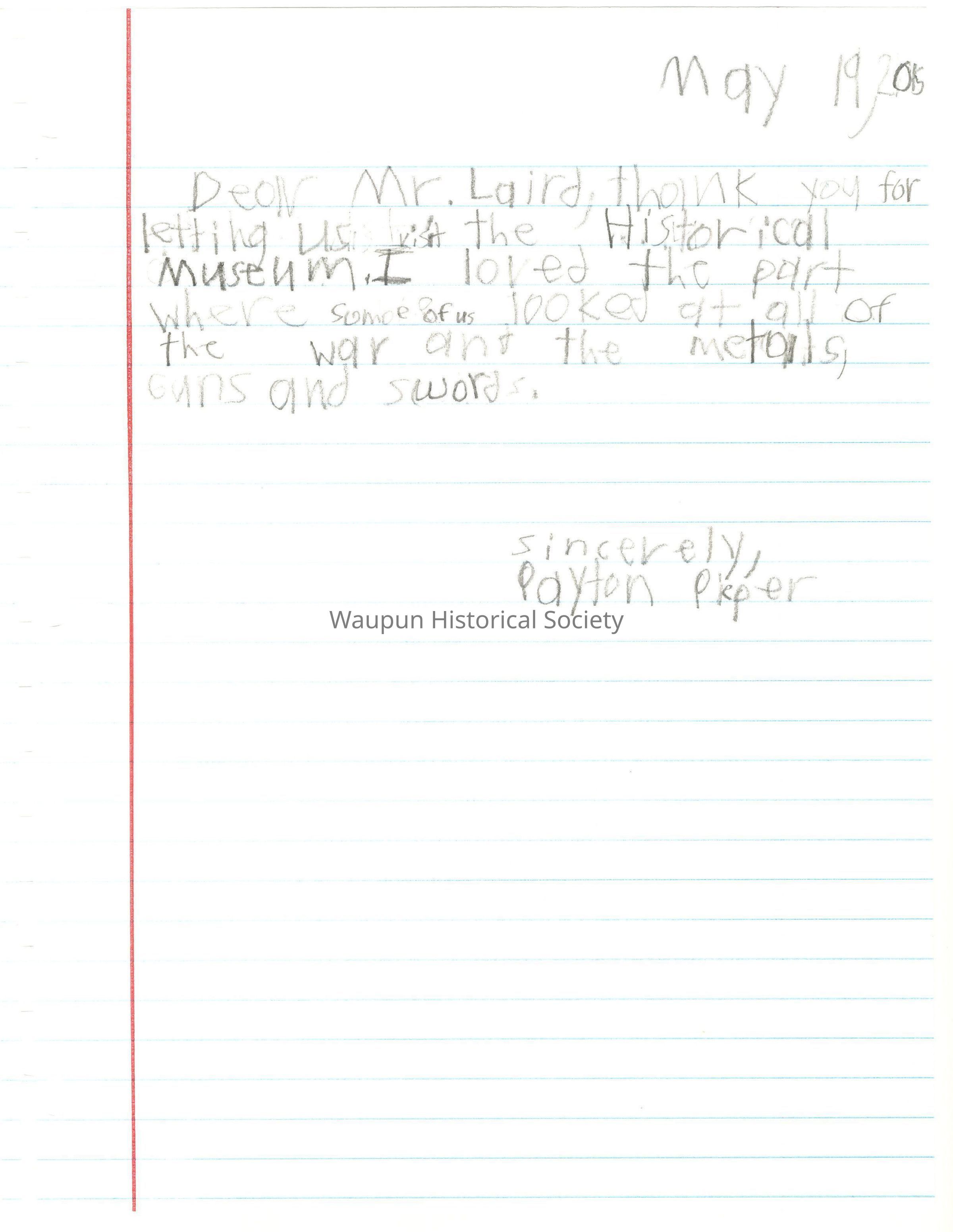 Dear Mr. Laird, Thank you for letting us visit the Historical Museum. I loved the part where some of us looked at all of the war and the metals, guns and swords.