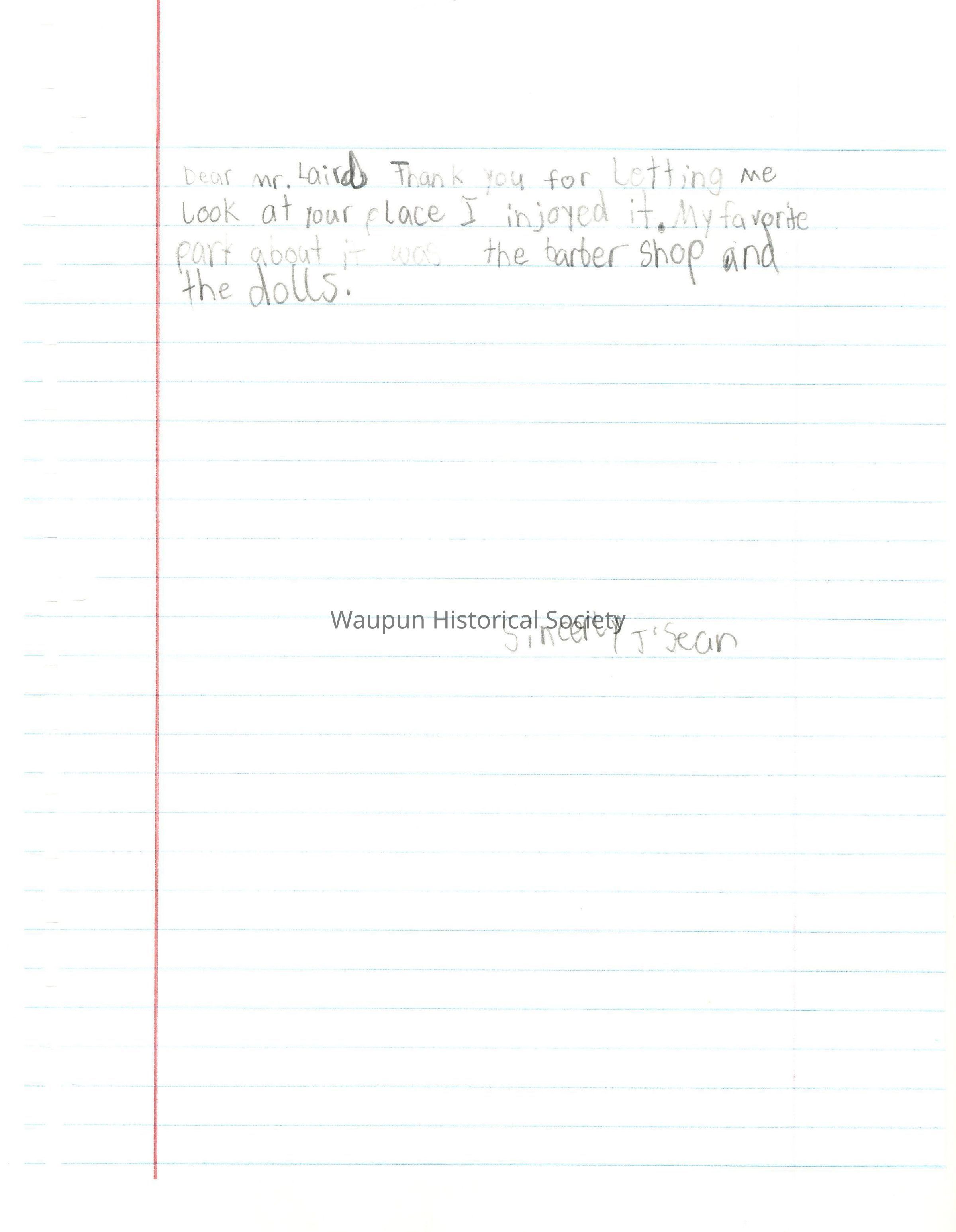 Dear Mr. Laird, Thank you for letting me look at your place. I enjoyed it. My favorite part about it was the barber shop an the dolls.